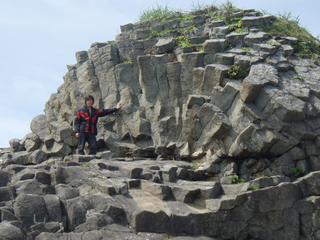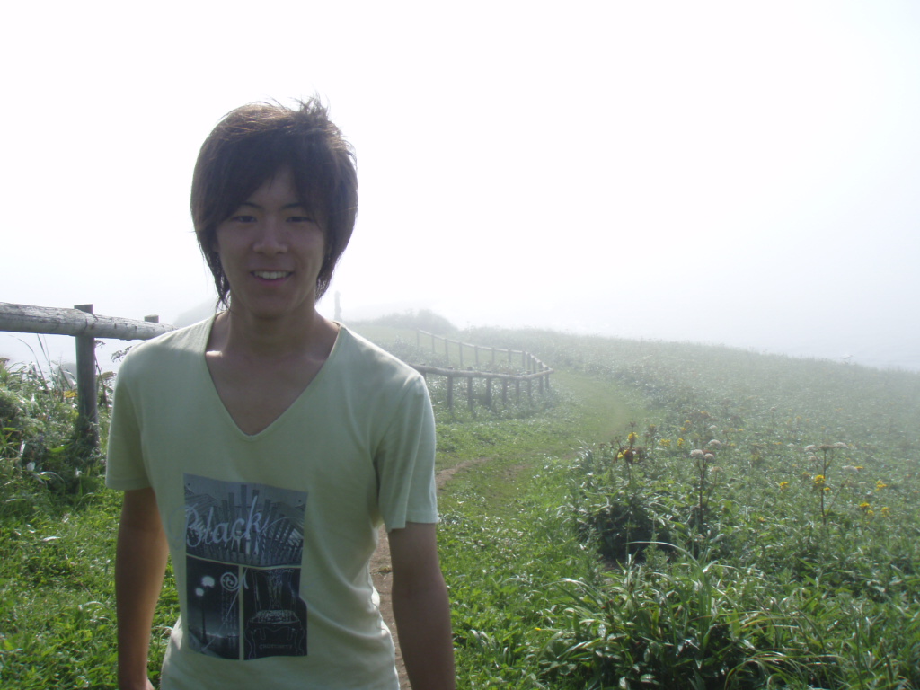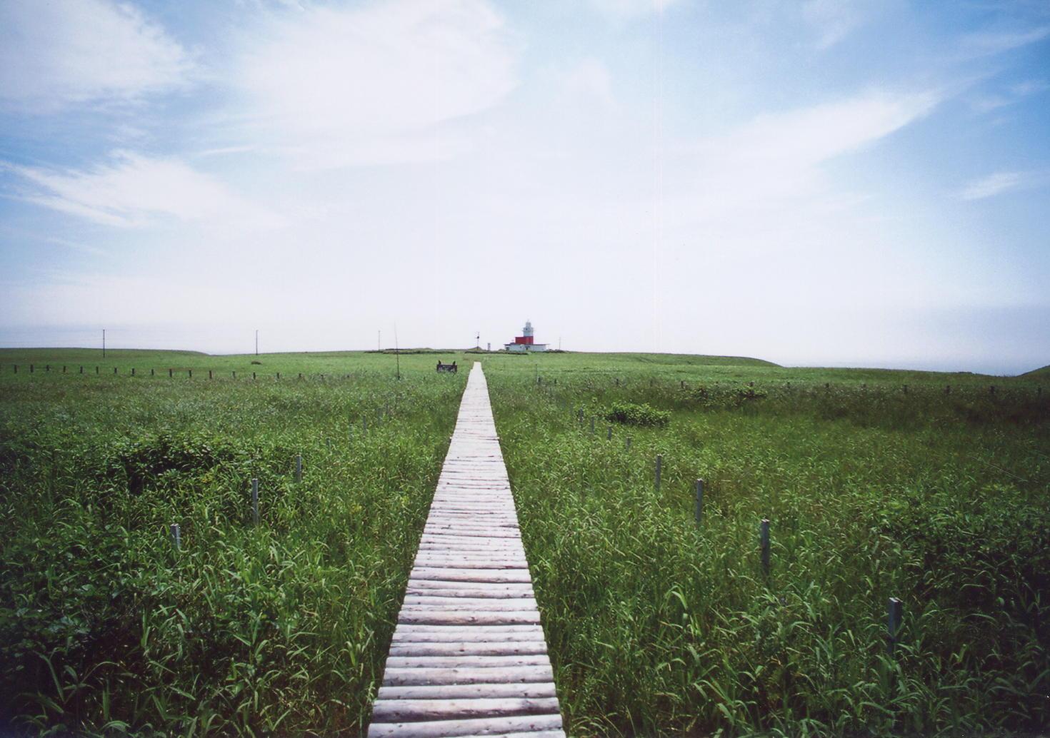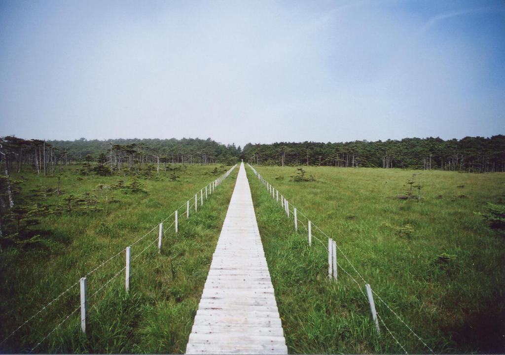 落石崎はバイクを降り20分そのうち10分以上このような直線の木道を歩く林の中-草原-林の中-草原ととてつもない長さの木道だ。そのため岬が見えたときの爽快感は格別。 | ![]() |