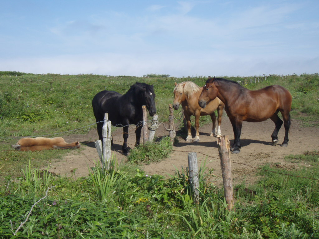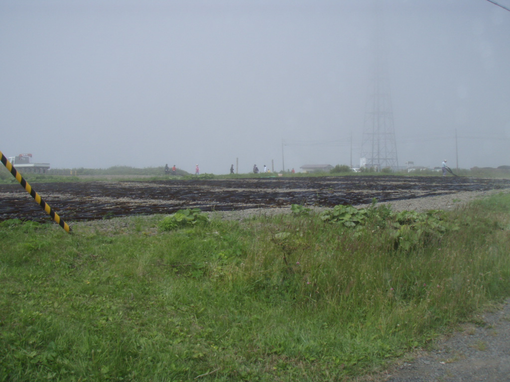 帰りも木道をのんびり歩いて戻る。林と林の間には草原が広がり歩いていて飽きない。またよく見ると鹿が歩いた足跡があちこちに見られた。![]() 岬周辺では昆布の天日干しが行われていた。一家総出で行っていた。 |