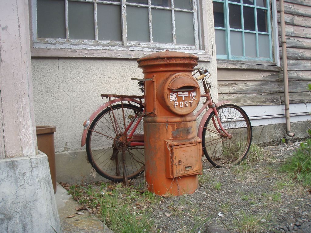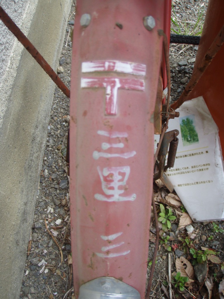 | 早川町の郷土資料館となっている旧郵便局の建物。 建物前には古いポストと自転車、なんと言っても自転車の泥除けに郵便のマークがプレスで型押しされているところがすごい。当然特注でしょう。こんなのがまだ存在していることにびっくり、ずっと残っていてほしいものだ。 |