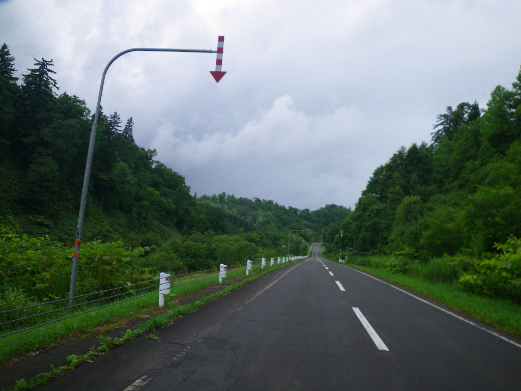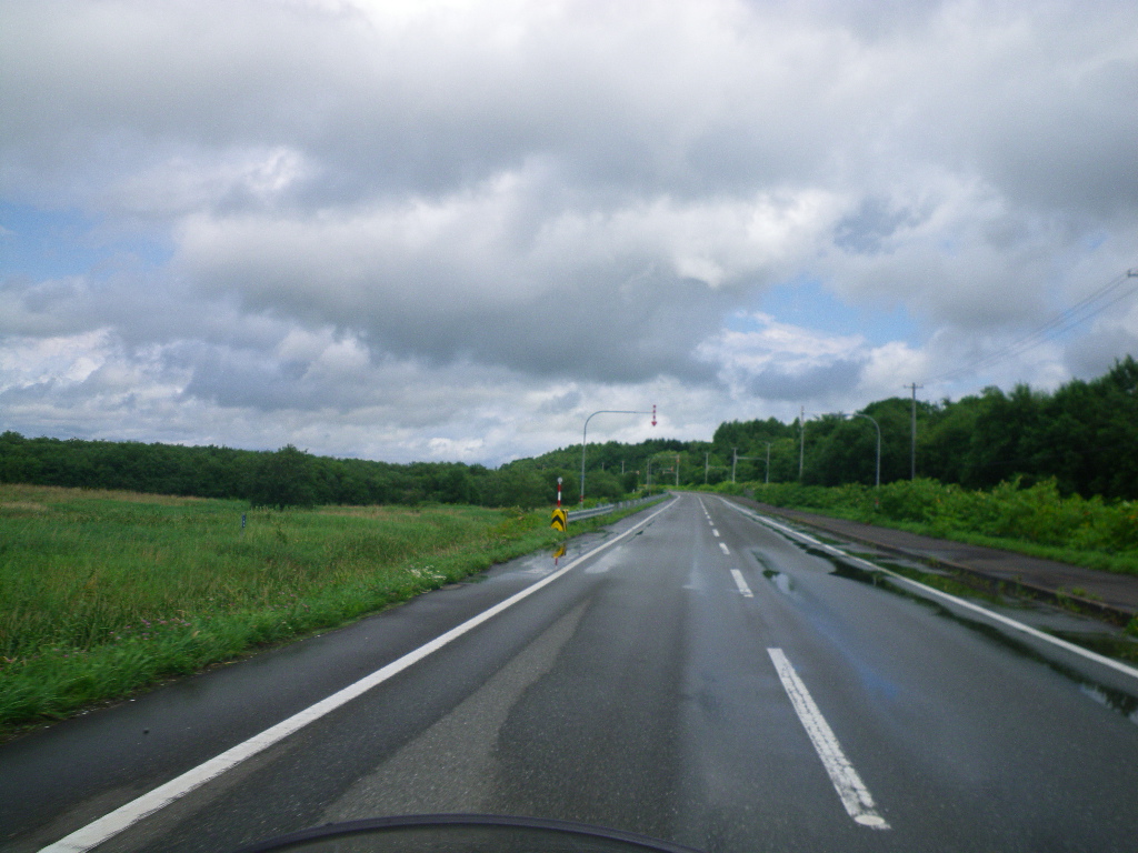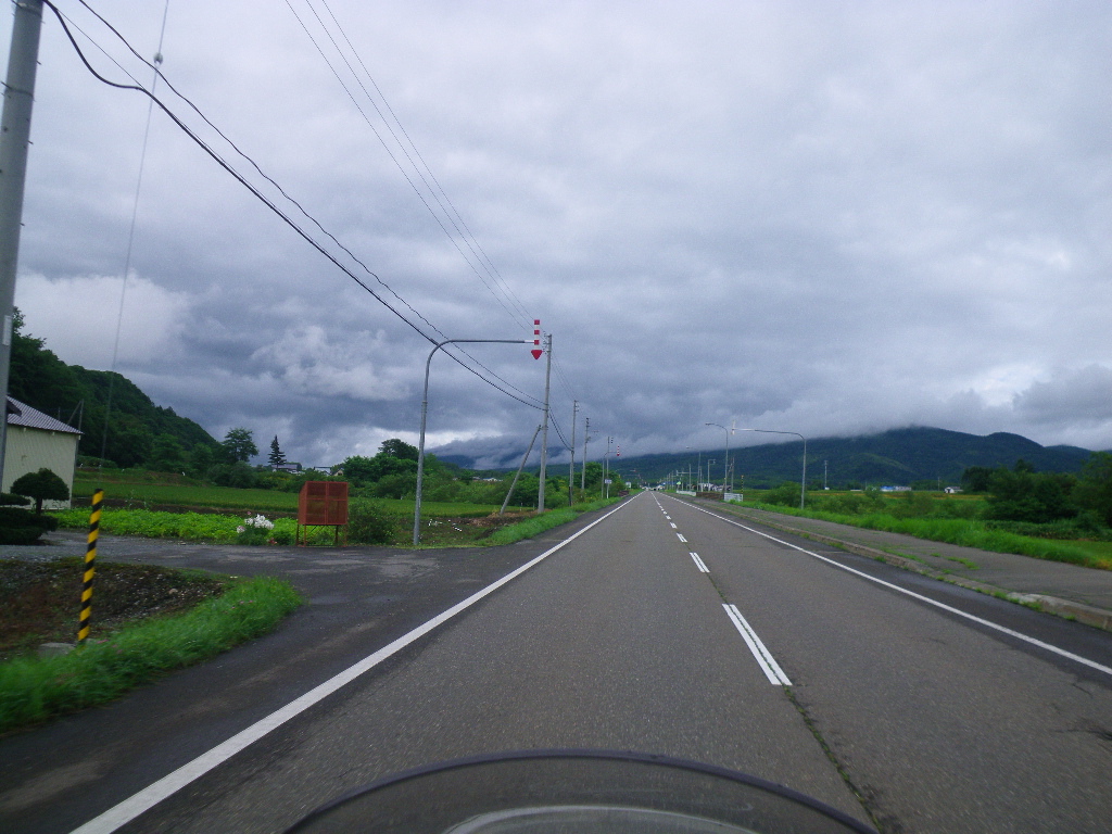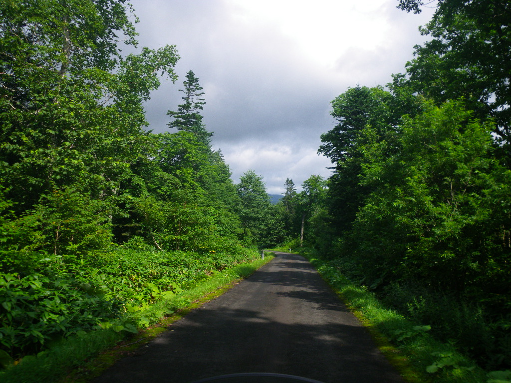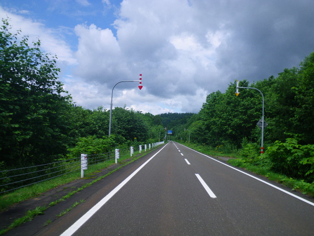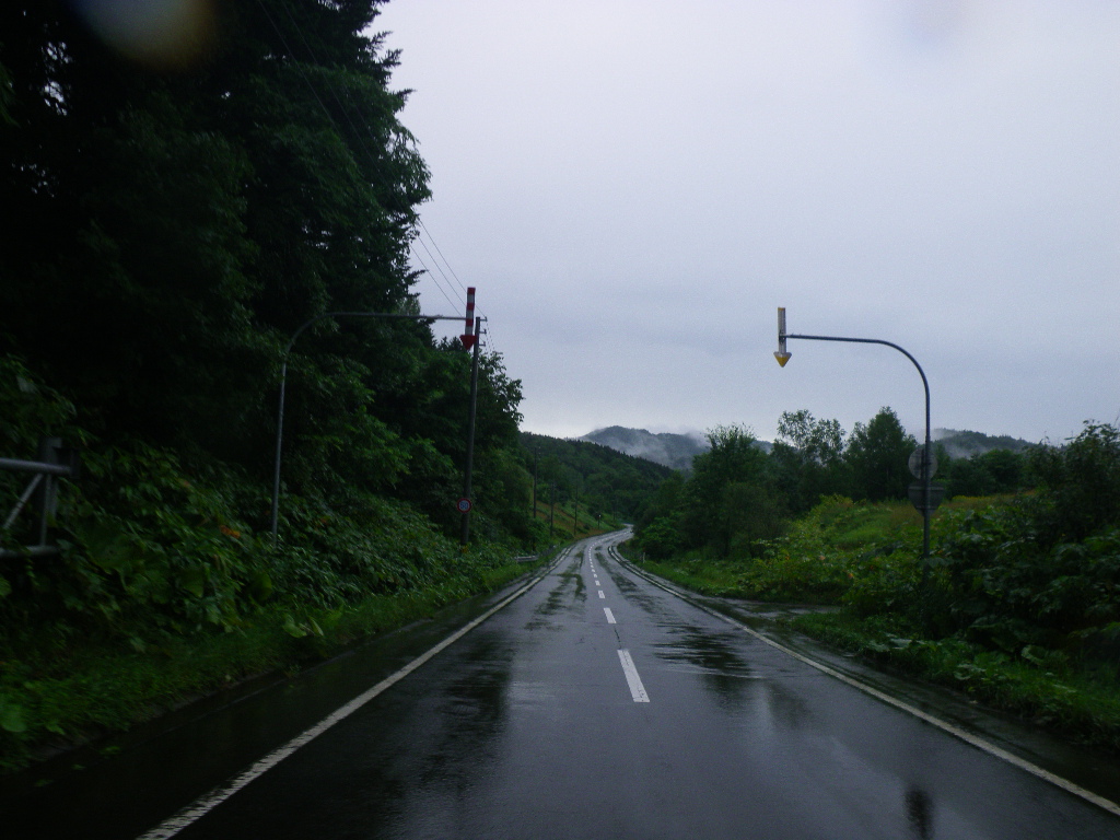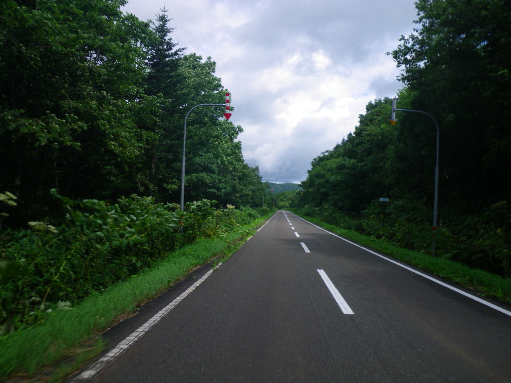 ![]() 内陸部を北に走る。早すぎると雨雲に追いつくので速すぎないペースで対向車の来ない道を下川に向かう。 |