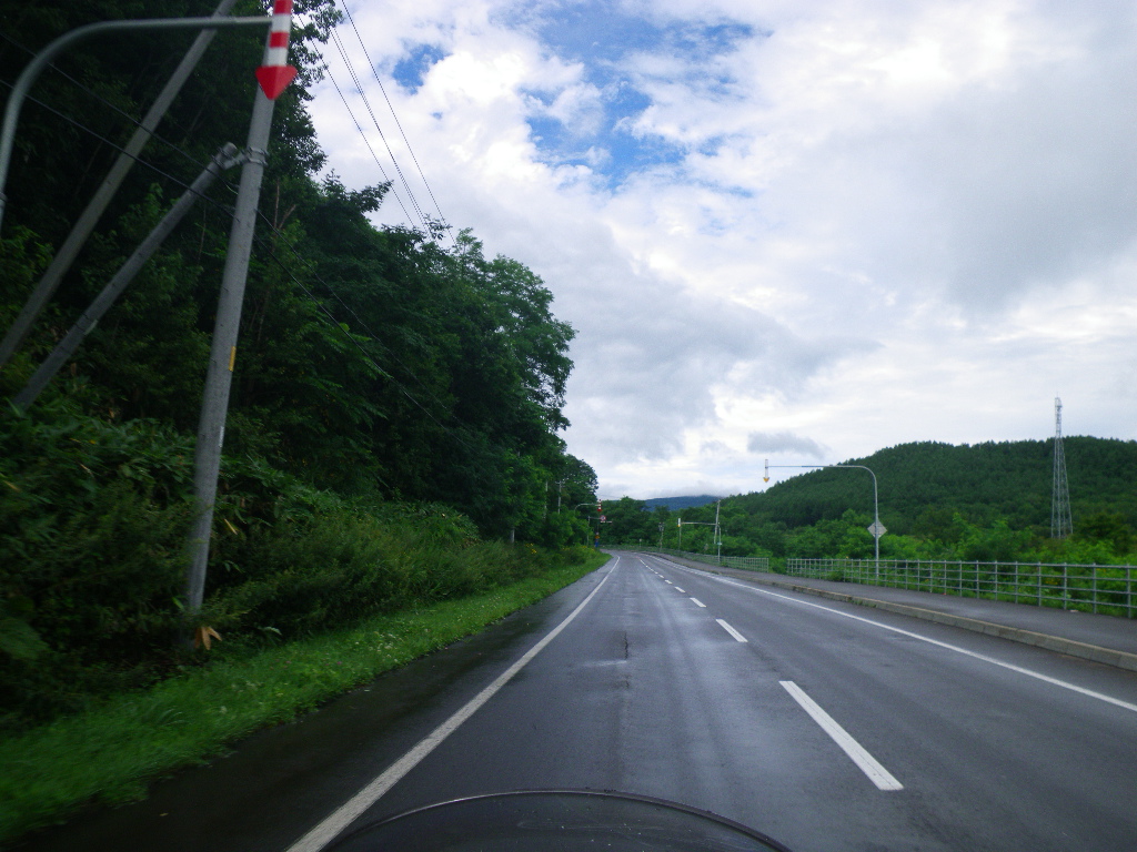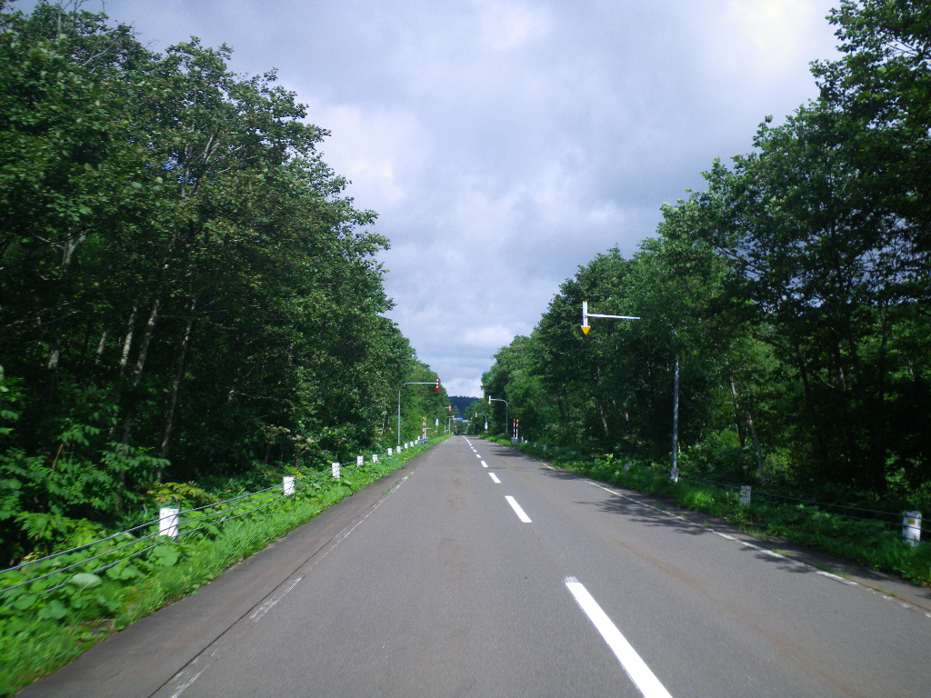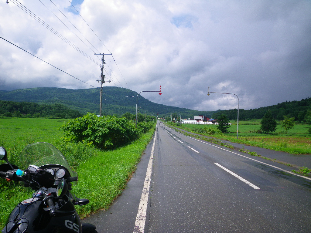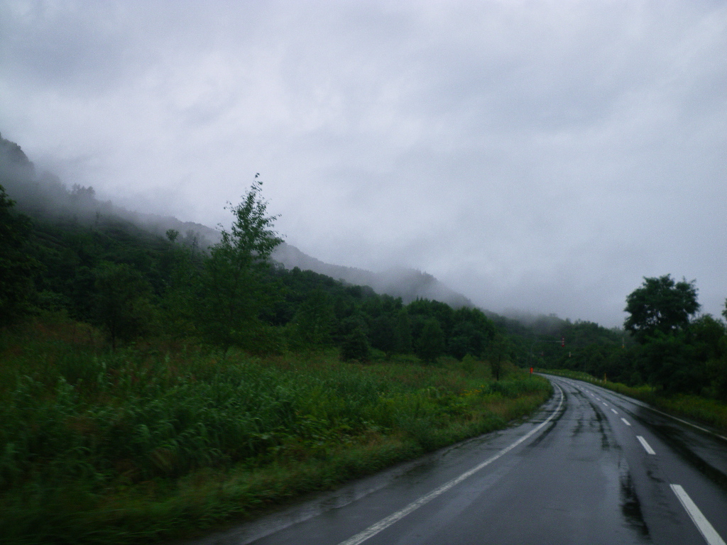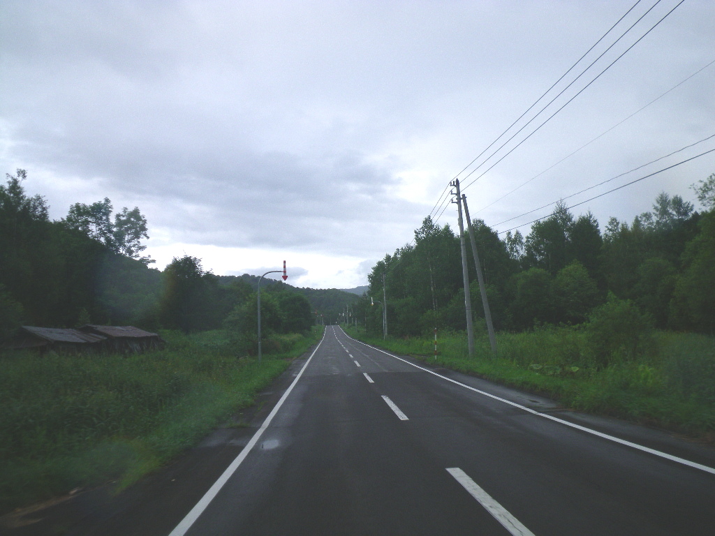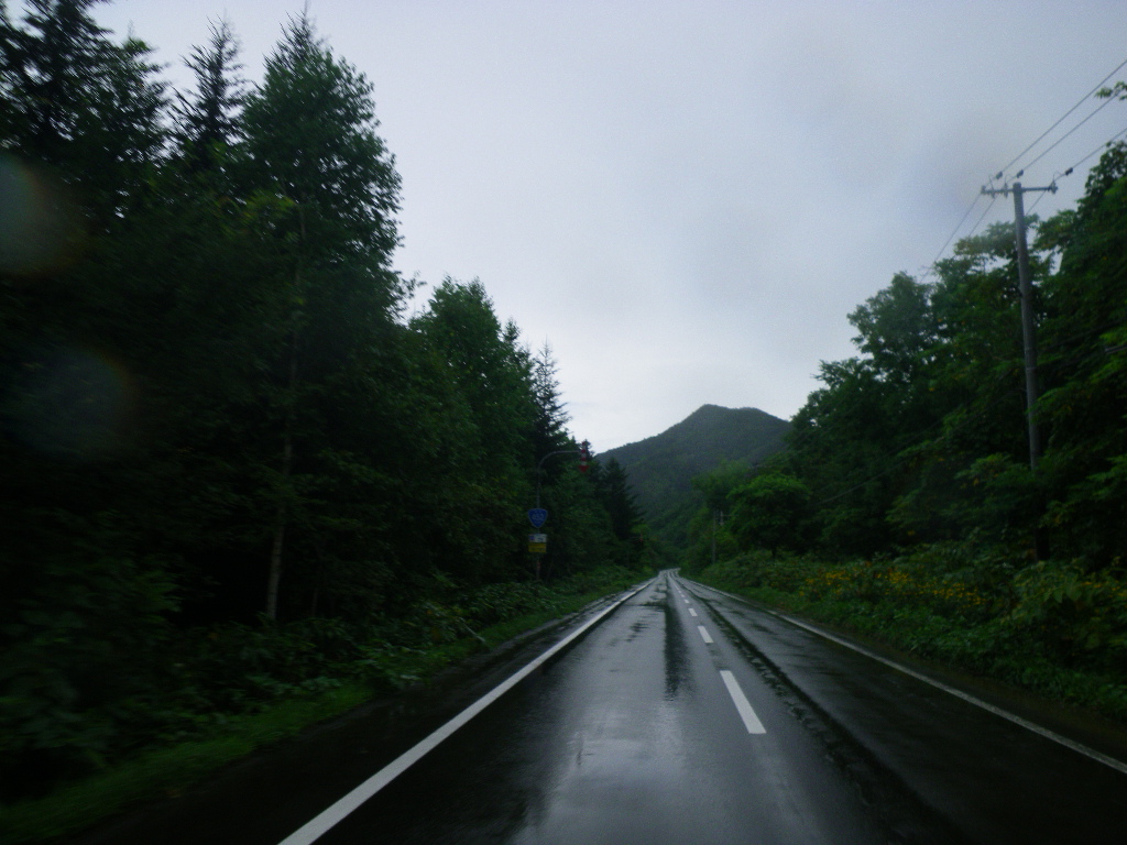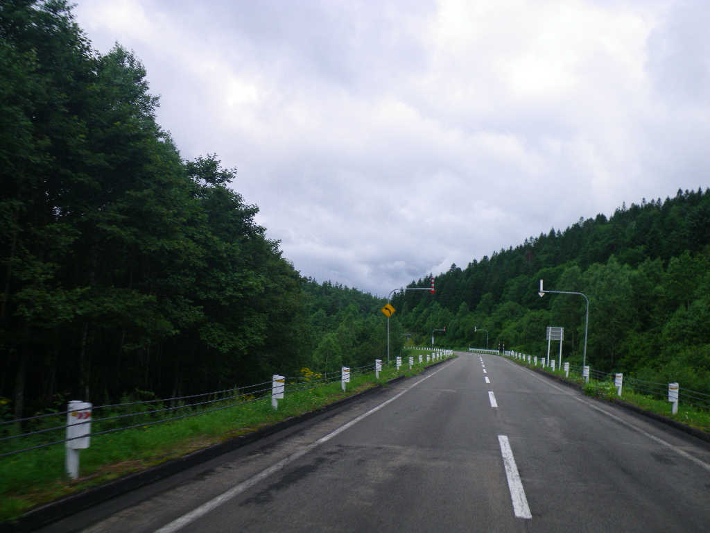 ![]() 内陸部を北に走る。早すぎると雨雲に追いつくので速すぎないペースで対向車の来ない道を下川に向かう。 |