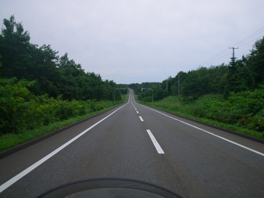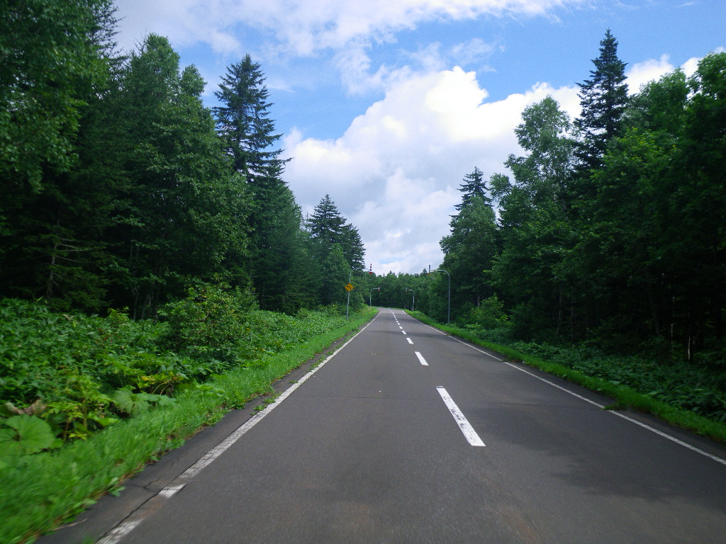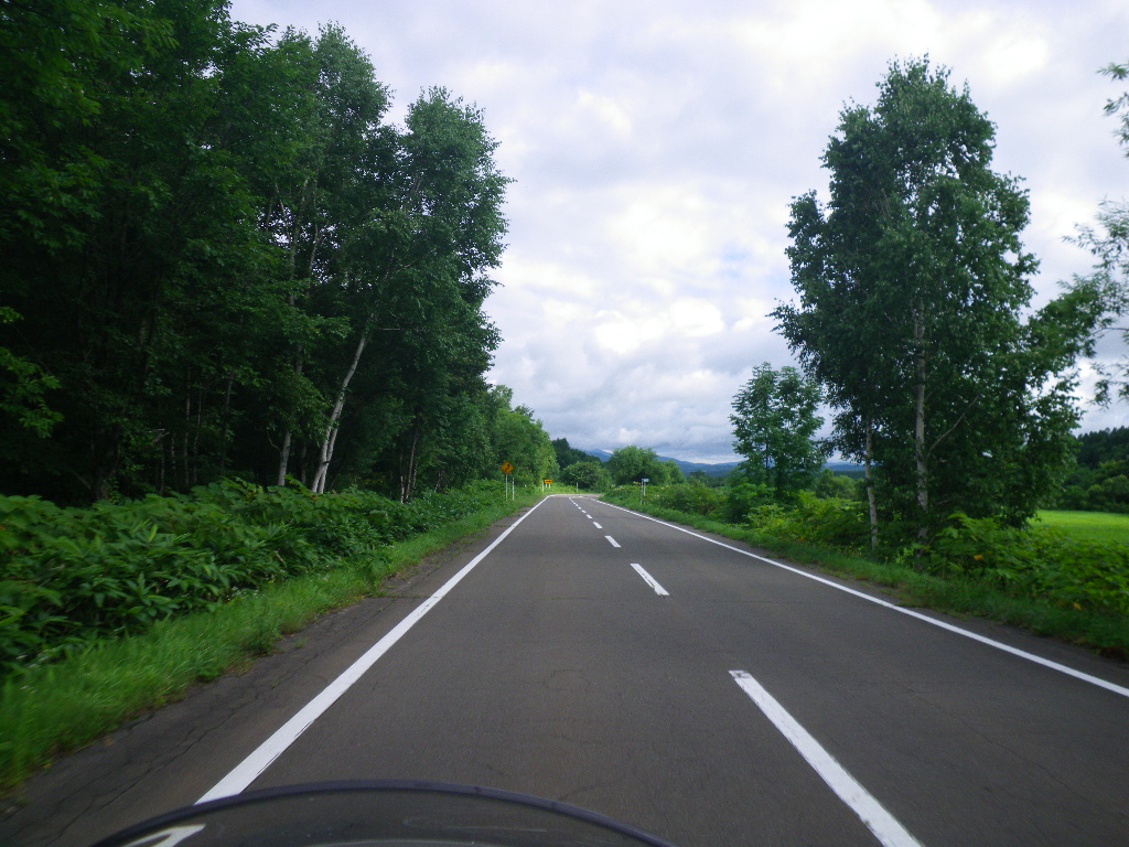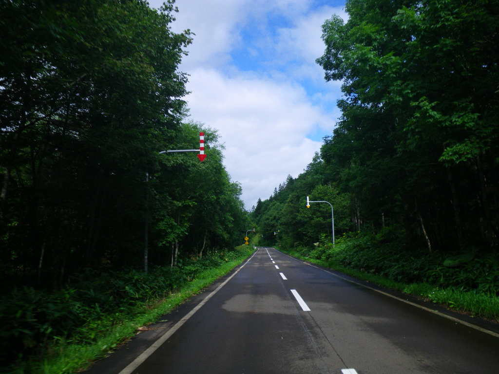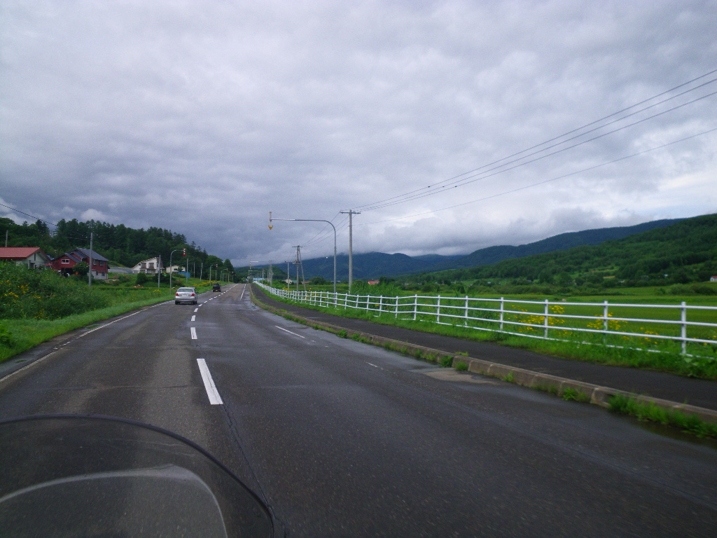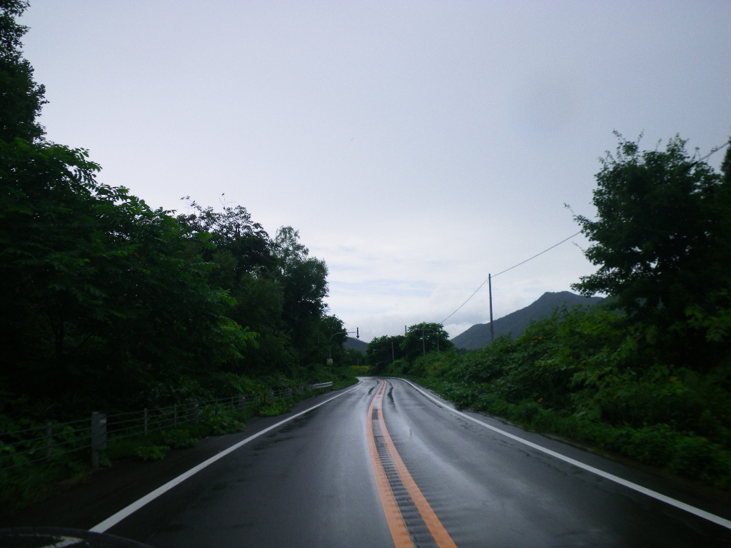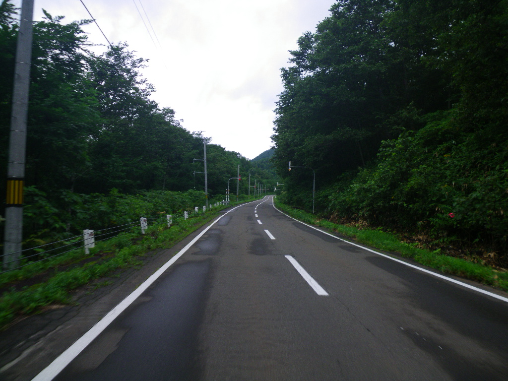 ![]() 内陸部を北に走る。早すぎると雨雲に追いつくので速すぎないペースで対向車の来ない道を下川に向かう。 |