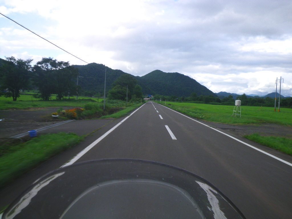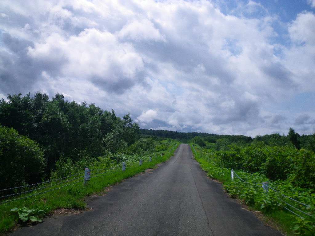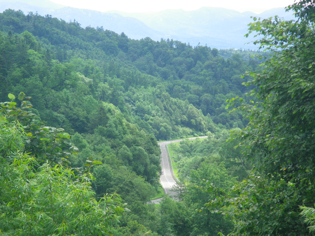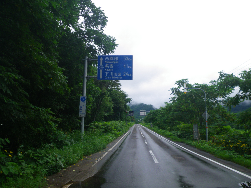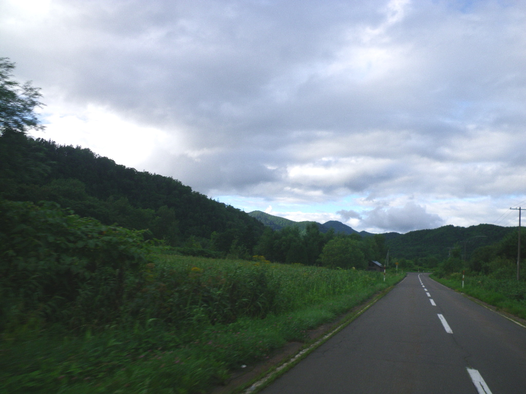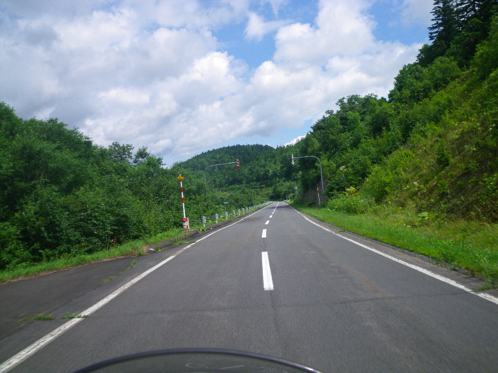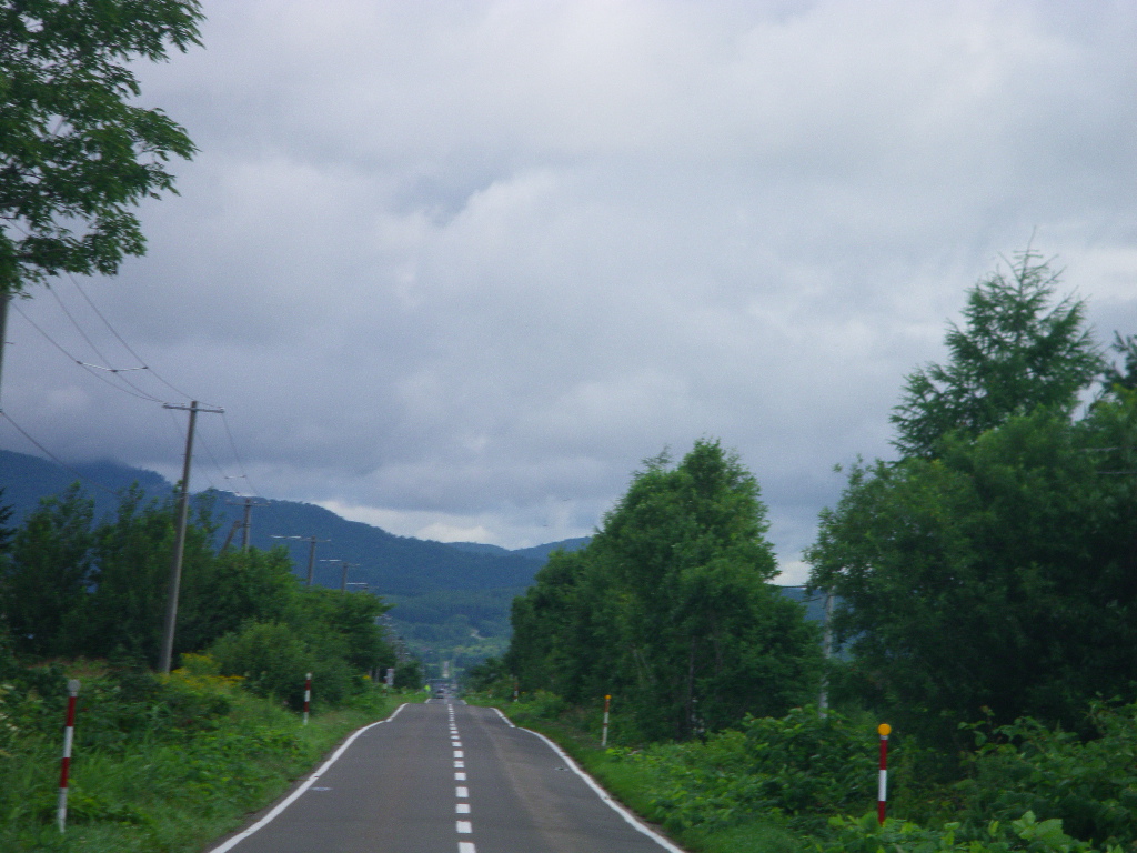 ![]() 内陸部を北に走る。早すぎると雨雲に追いつくので速すぎないペースで対向車の来ない道を下川に向かう。 |