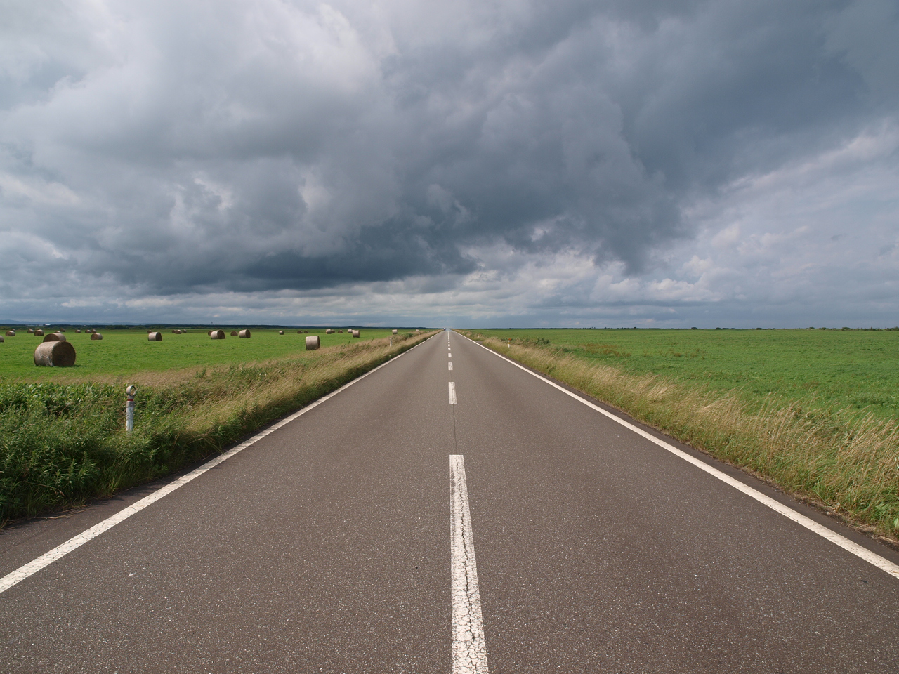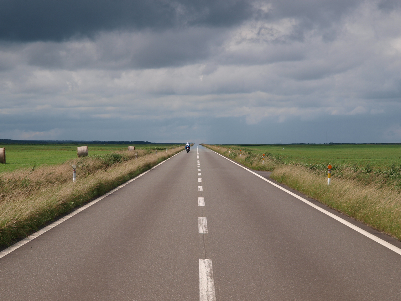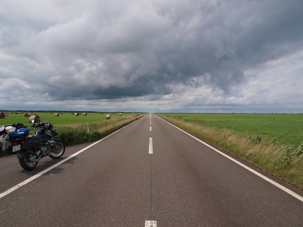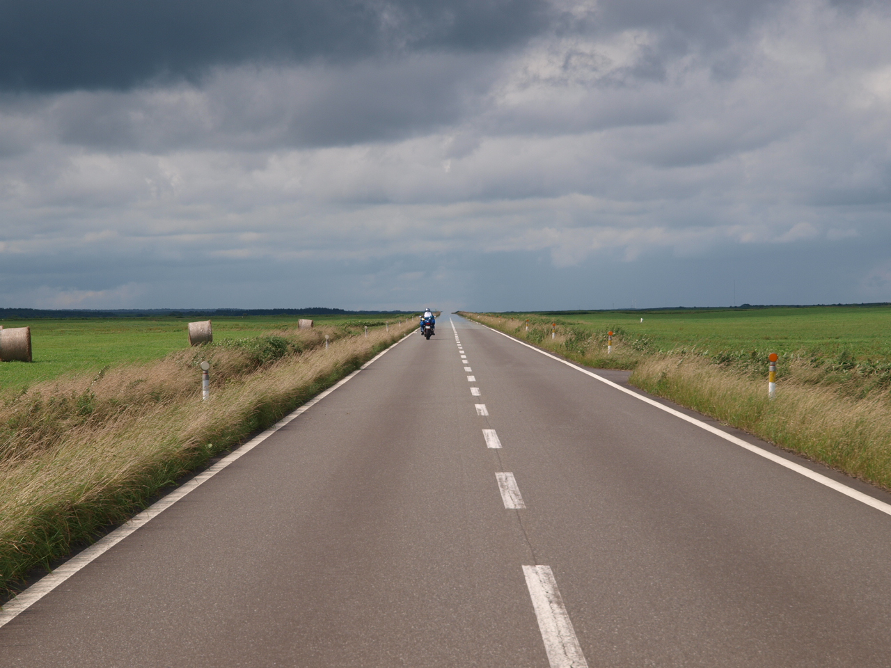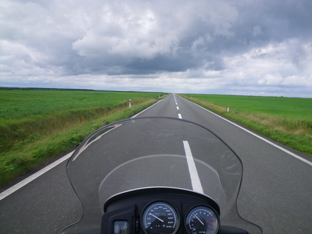 ![]() 内陸部を北に走る。早すぎると雨雲に追いつくので速すぎないペースで対向車の来ない道を下川に向かう。 |