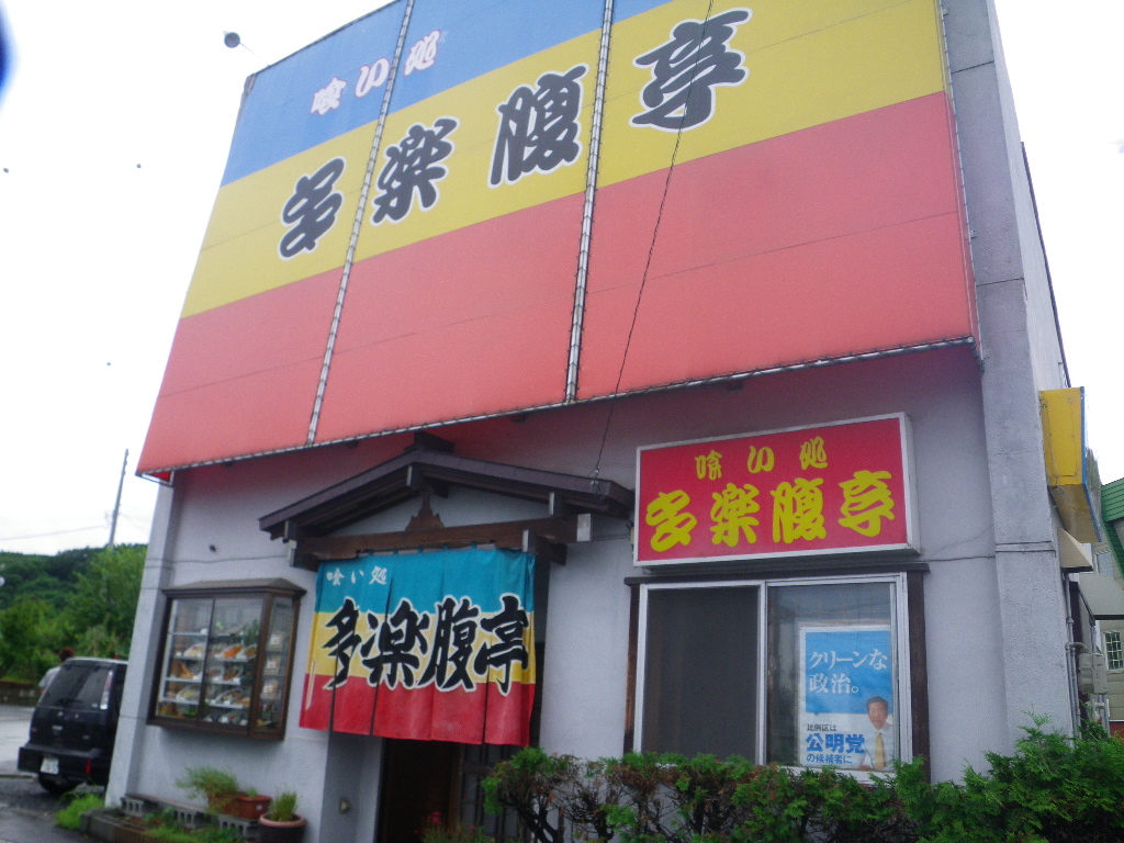 | 炭鉱の町なのか共同住宅にはそれぞれ煙突が、さくらんぼを売っていた奥さんに聞いてやってきた多楽腹亭。広東麺だけでもたらふくに。 |