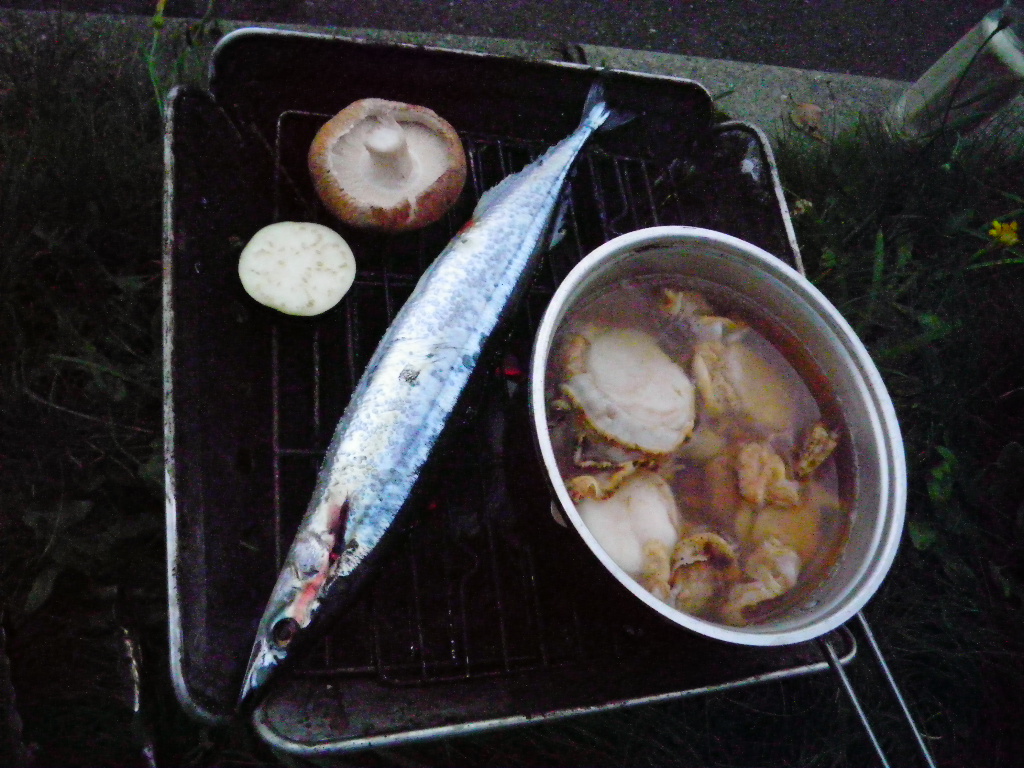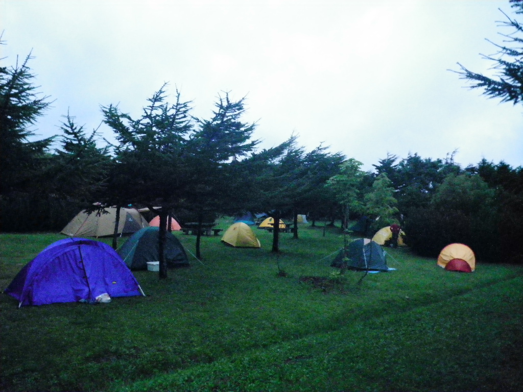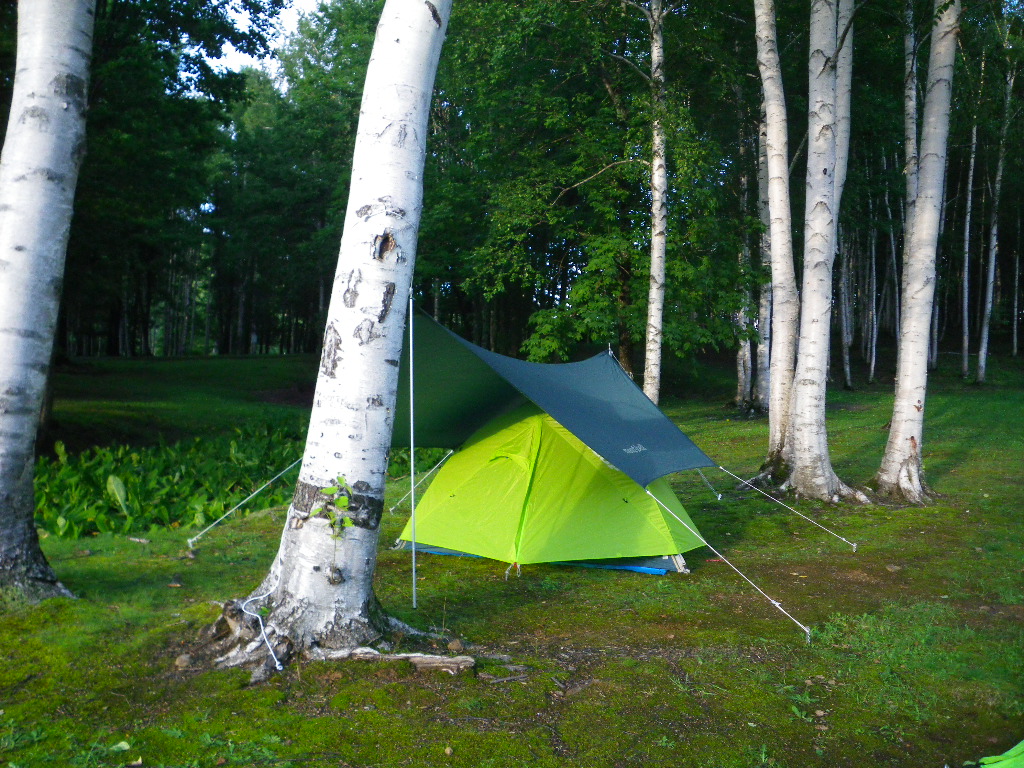 | 白樺の綺麗な林間のサイトだが、管理棟の横に集まるように設営する。モンベルのタープ初出陣。夕食は秋刀魚の塩焼きとホタテの炊き込みご飯、デザートはさくらんぼ。秋刀魚が旨かった、さくらんぼの黒いのはブルーベリーと掛け合わせてあるそうだ。 |