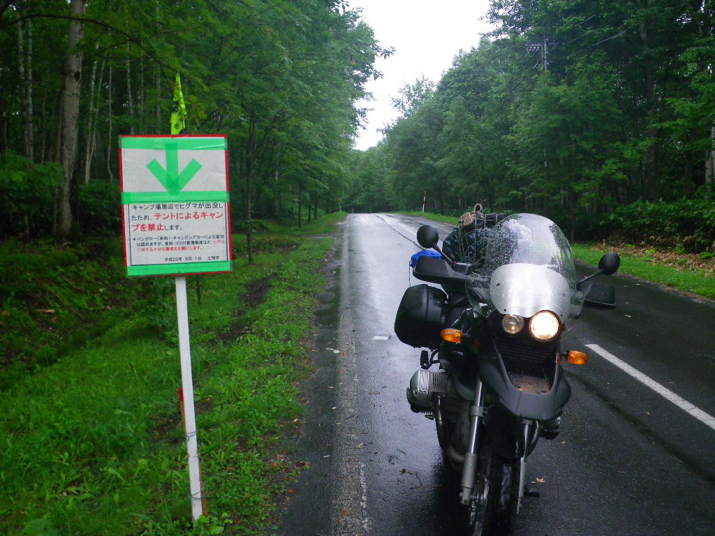 | 朝方雨が降ったものの天気は回復してきている。北海道限定のどん兵衛(こぶが効いている)を食べキャンプ禁止の看板で写真を撮り出発。 |