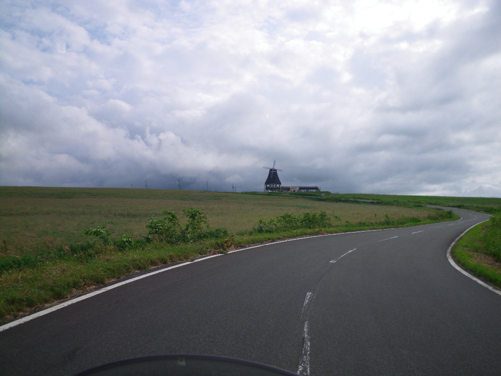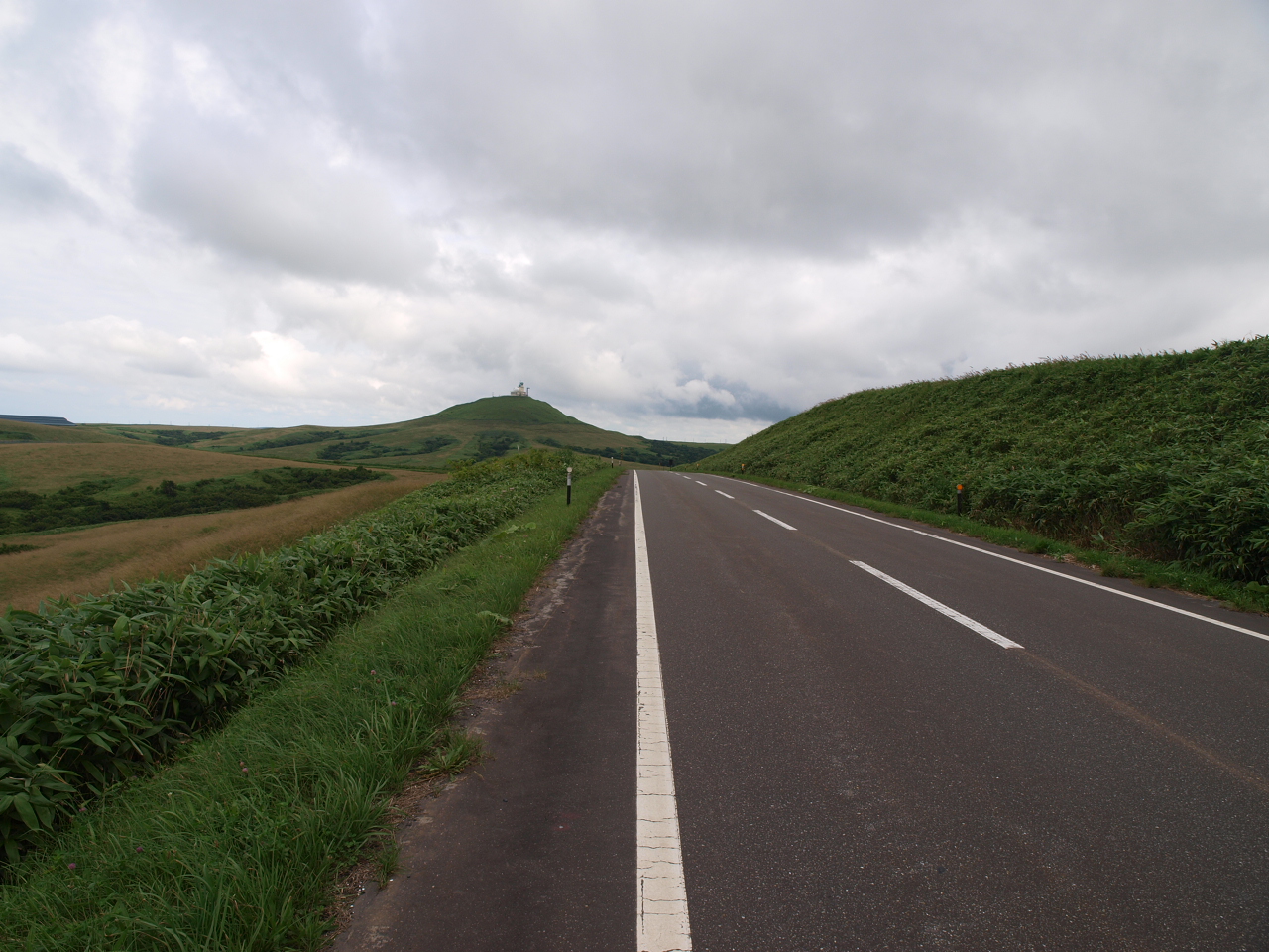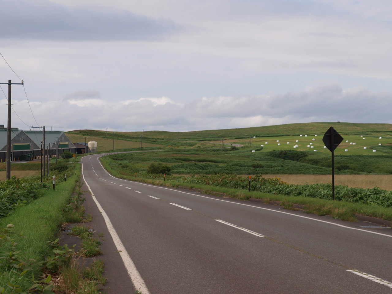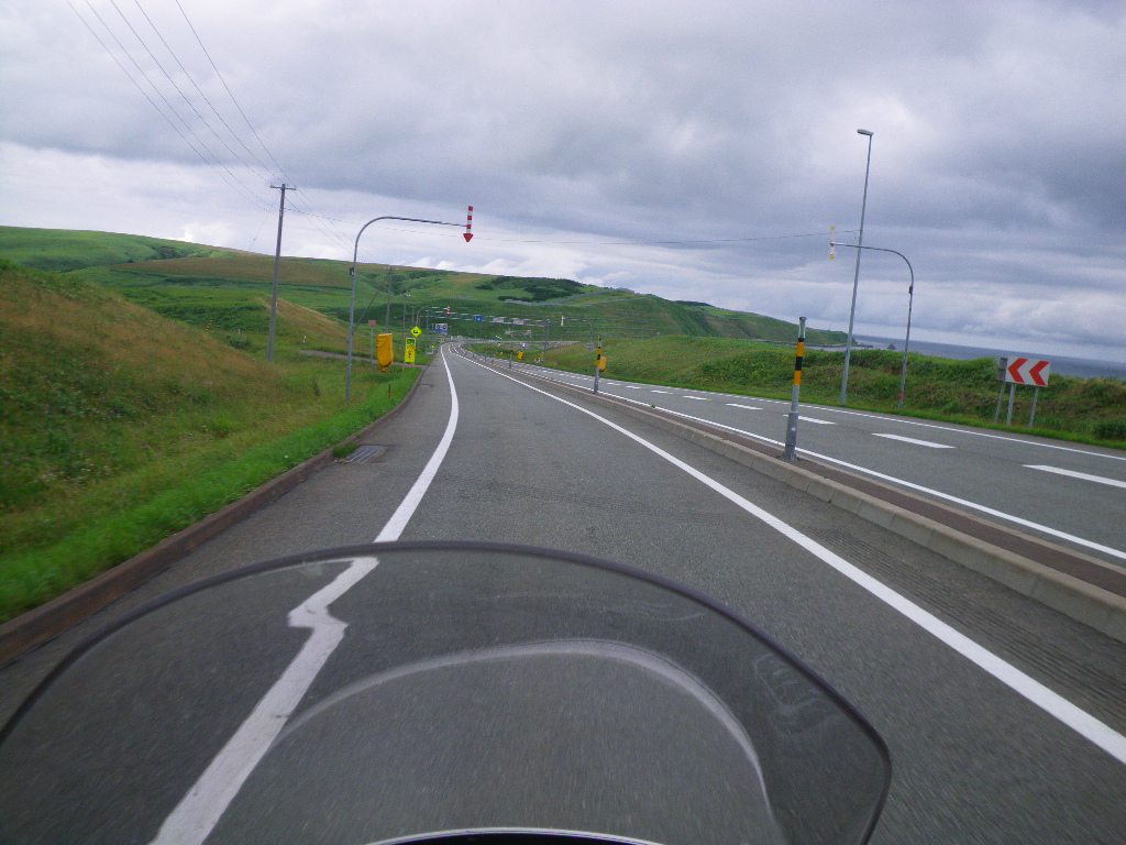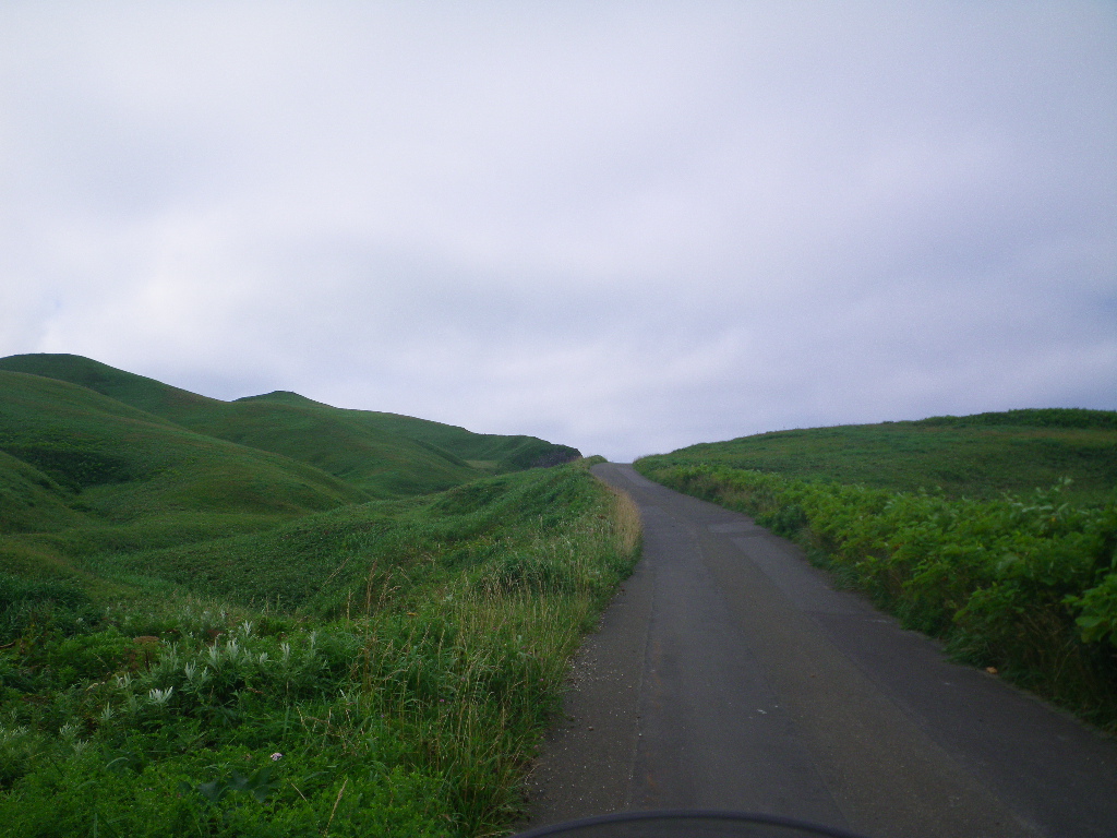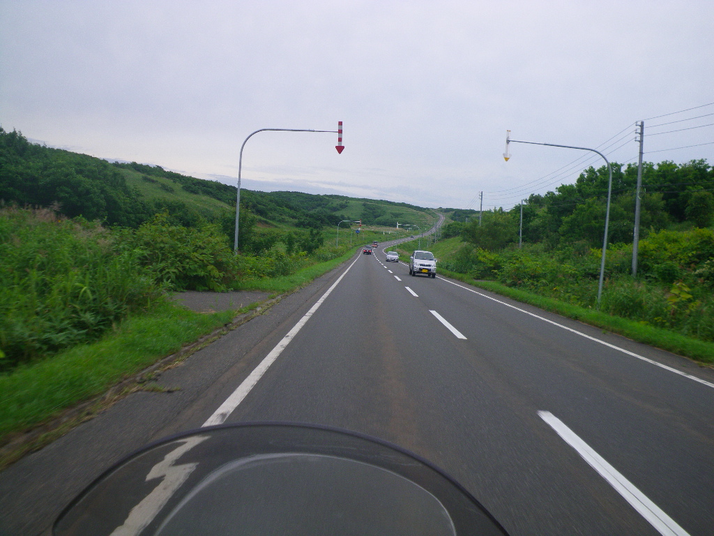 | 宗谷国道は、ほとんどが変化の無い道だがここ宗谷丘陵の辺りだけ変化にとんだうねりのある道となっている。浜頓別からサロマ湖辺りまでは本当に変化が無く飽きる。今回はそれを避けて山中を走ったのだ。 |