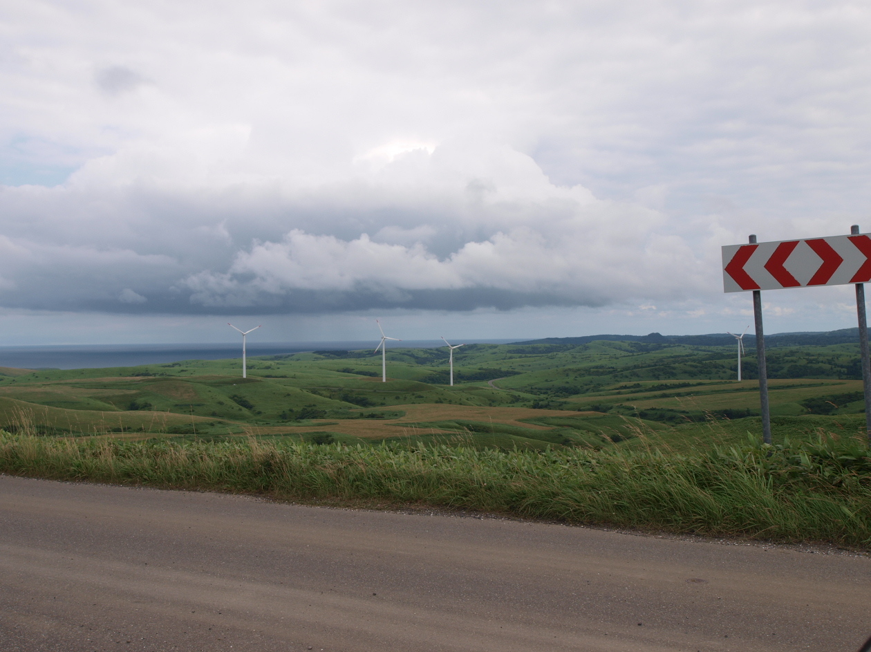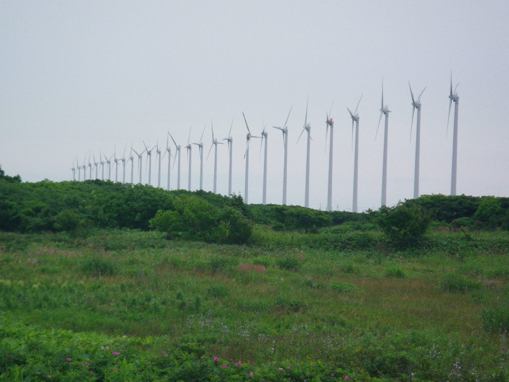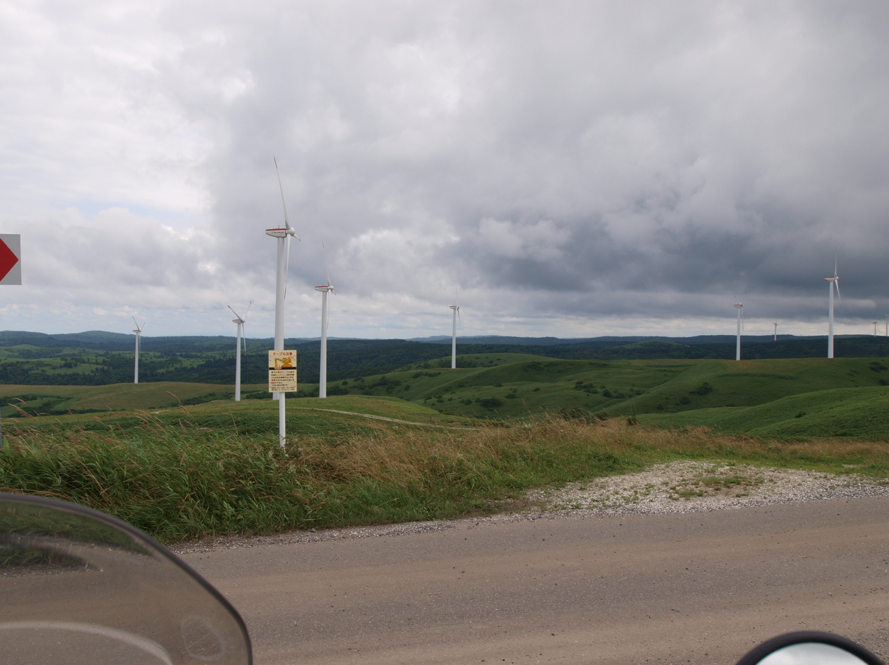 | 一般的にこのまま宗谷丘陵を通過してしまうのだが、ここはちょっと寄り道。宗谷岬から上がると突き当りを右へ行くのだがここは左の天文台のほうへ向かう。天文台の小道に入ると目の前に風車がいっぱい。 |