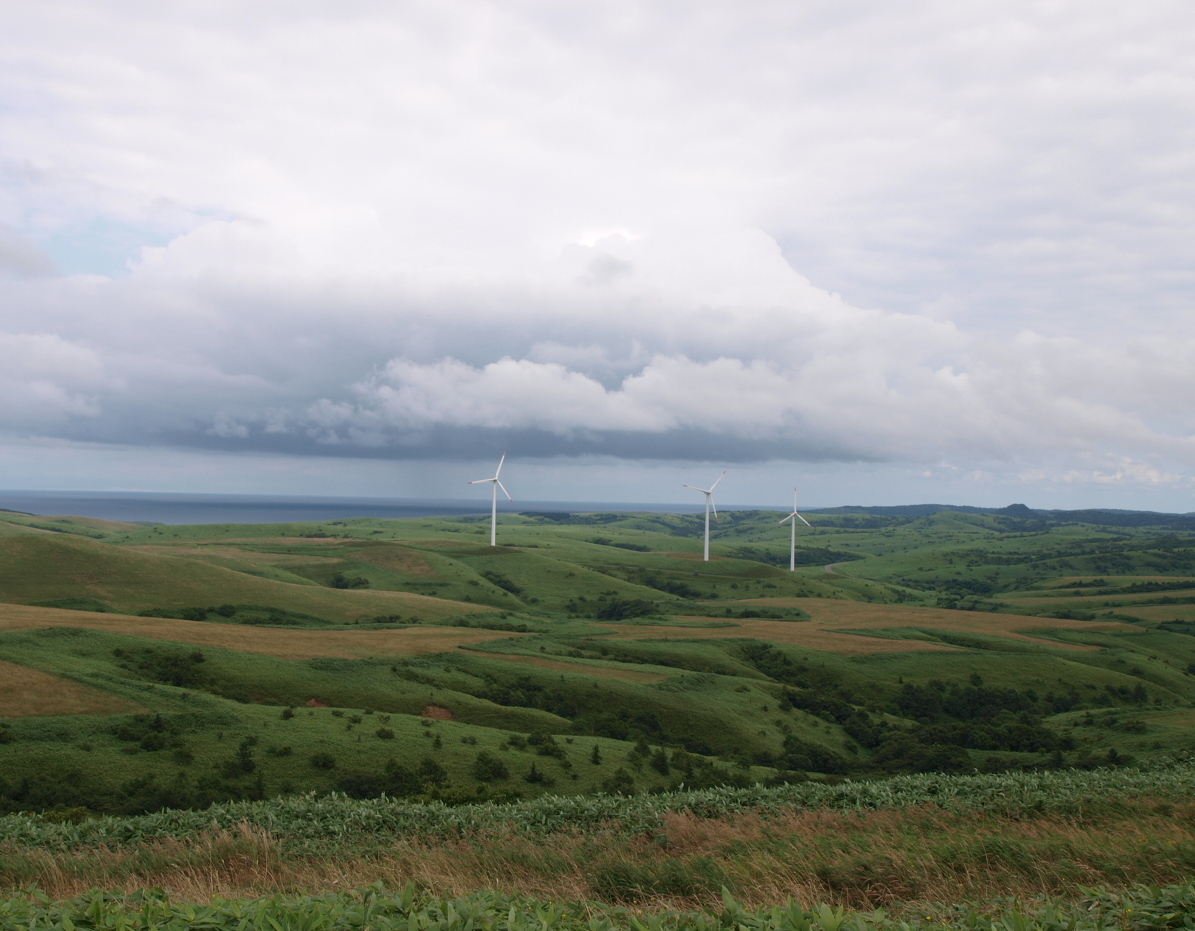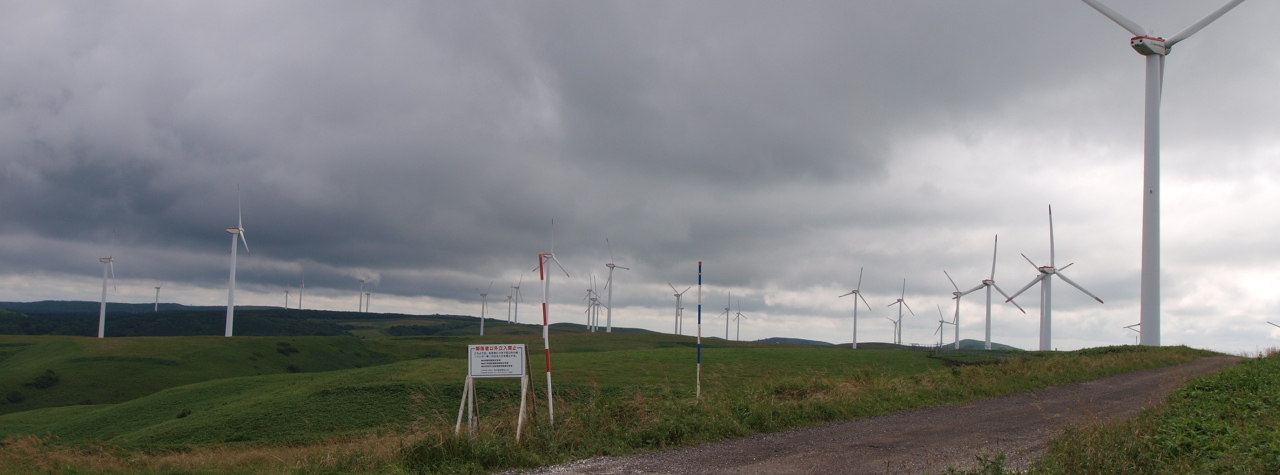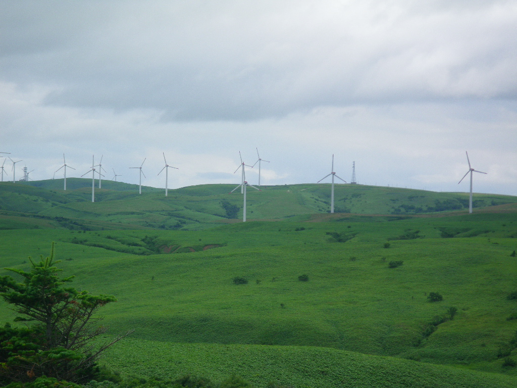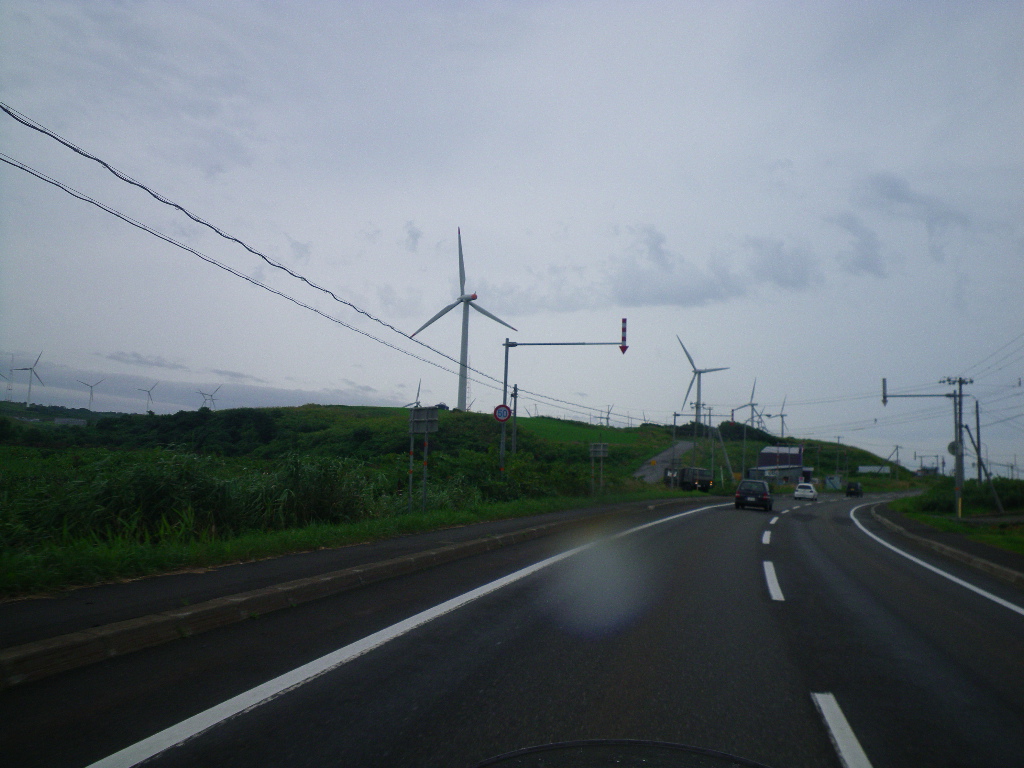 | 一般的にこのまま宗谷丘陵を通過してしまうのだが、ここはちょっと寄り道。宗谷岬から上がると突き当りを右へ行くのだがここは左の天文台のほうへ向かう。天文台の小道に入ると目の前に風車がいっぱい。 |