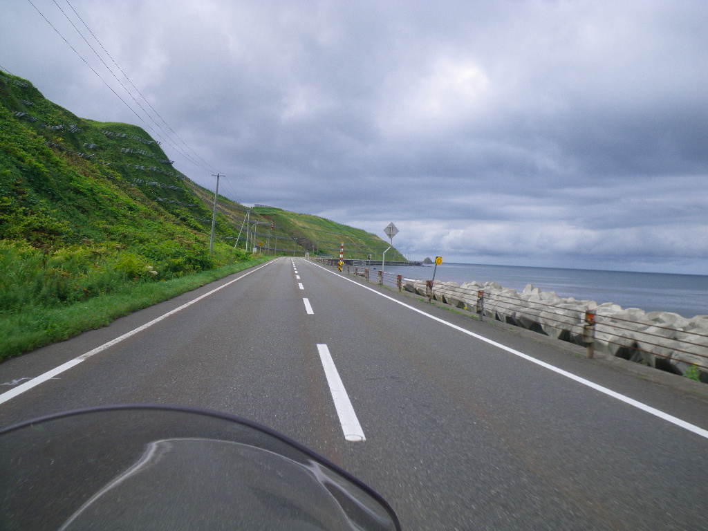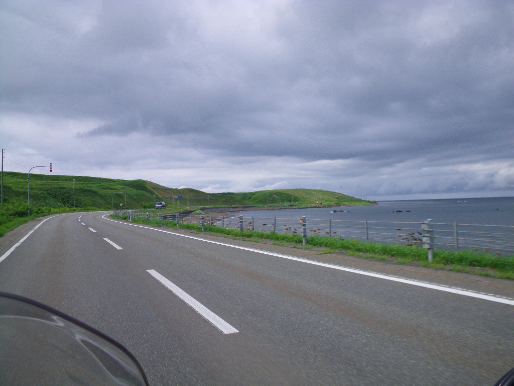 | 曇りだが利尻島を見ながらオロロンラインを走る。思ったより車が多いのが残念だが何も無いのがすごい。 |