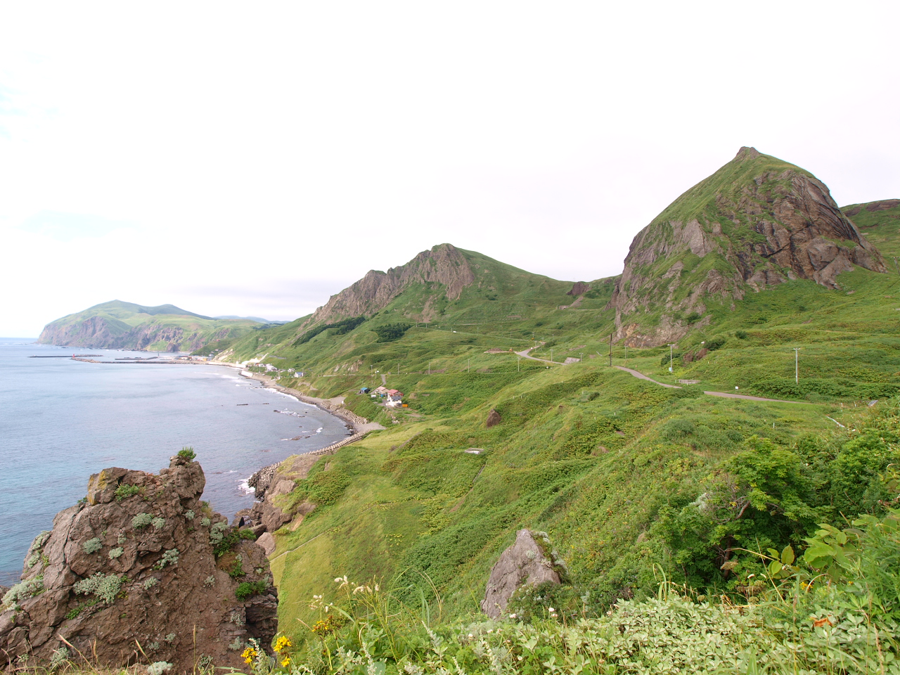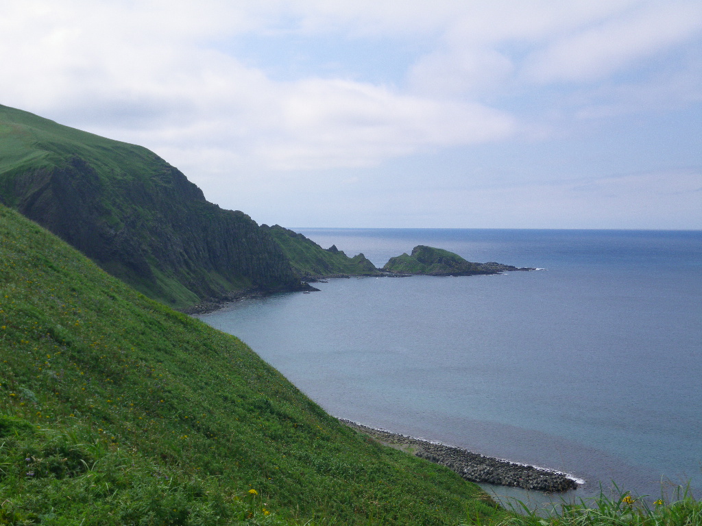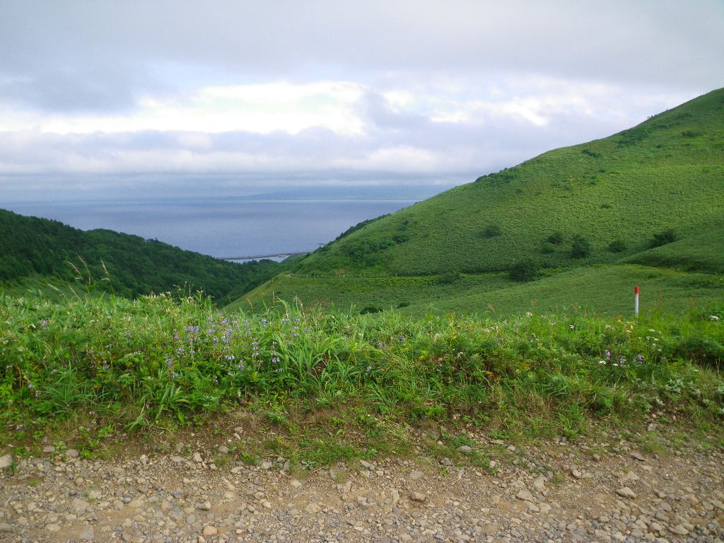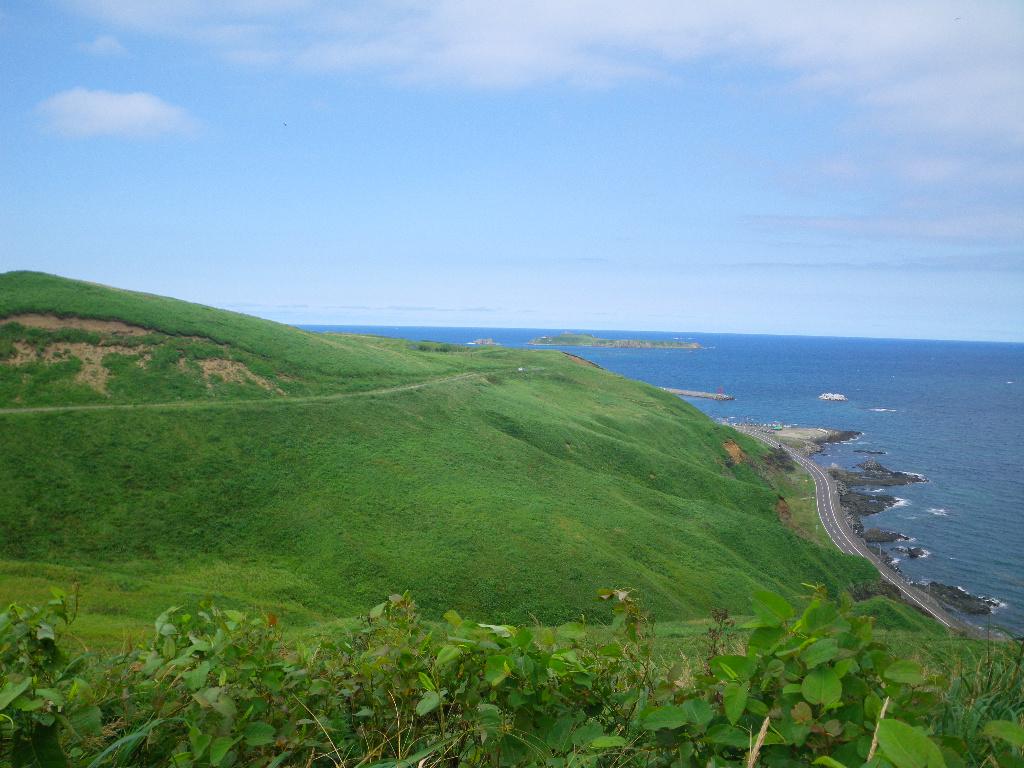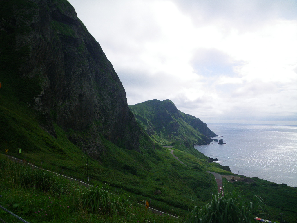 トンネルを抜け桃台猫台展望台へ![]() 綺麗な海岸線が見える展望台。島の西側は、海岸線が複雑で集落も少なく海岸にへばりつくようにある、その分景観はこちら側のほうが断然いいのだが、これが礼文島の特徴だ。 |