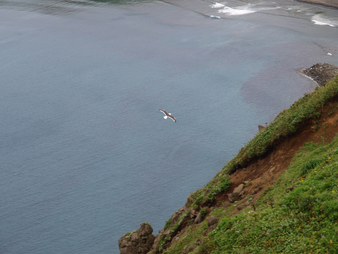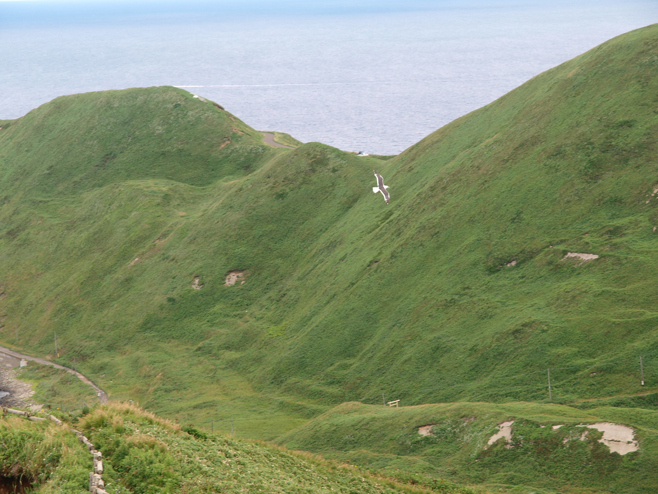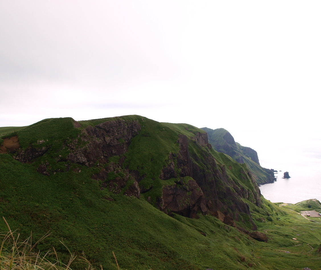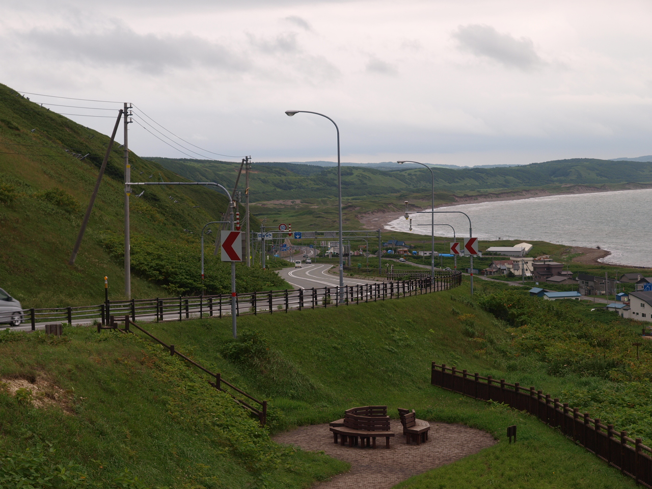 トンネルを抜け桃台猫台展望台へ![]() 綺麗な海岸線が見える展望台。島の西側は、海岸線が複雑で集落も少なく海岸にへばりつくようにある、その分景観はこちら側のほうが断然いいのだが、これが礼文島の特徴だ。 |