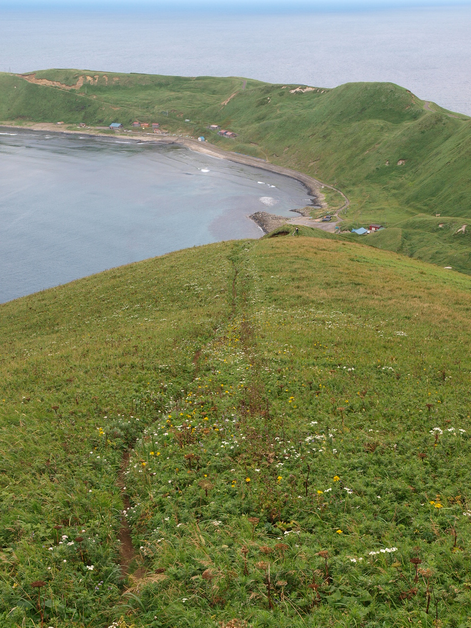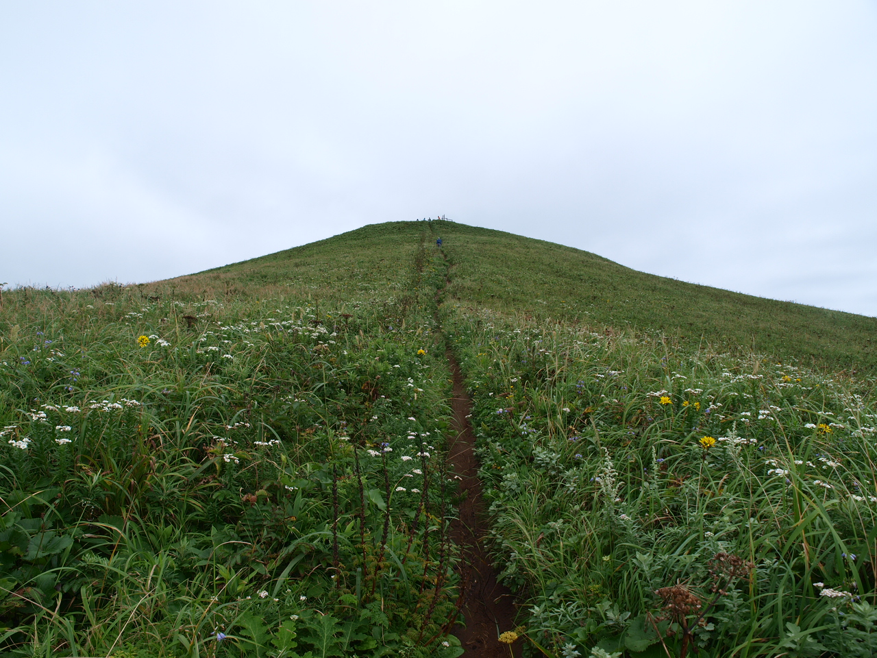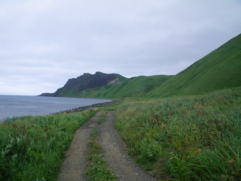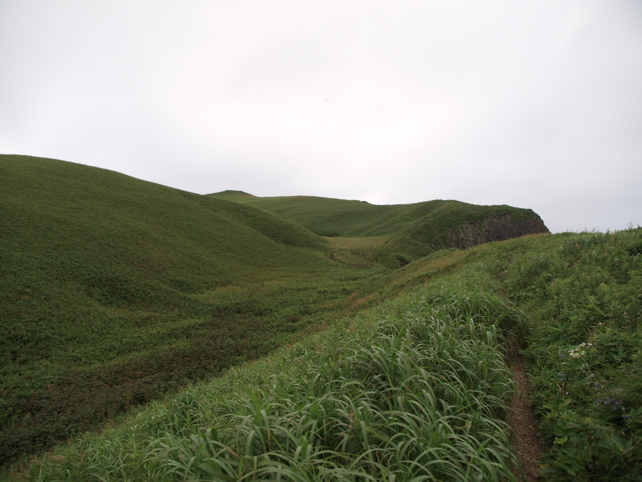 上に見えるのが元地灯台 桃岩展望台から1時間ぐらいでいけそうなのだが残念ながら時間切れ。 ![]() 元地をあとにして礼文の目的の一つ礼文林道に向かう。ガレ場が少なければいいのにと願う。 |