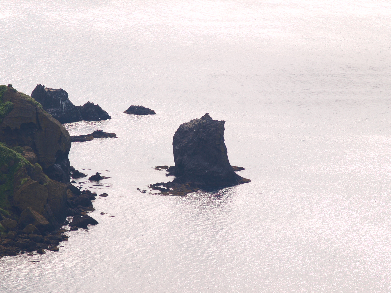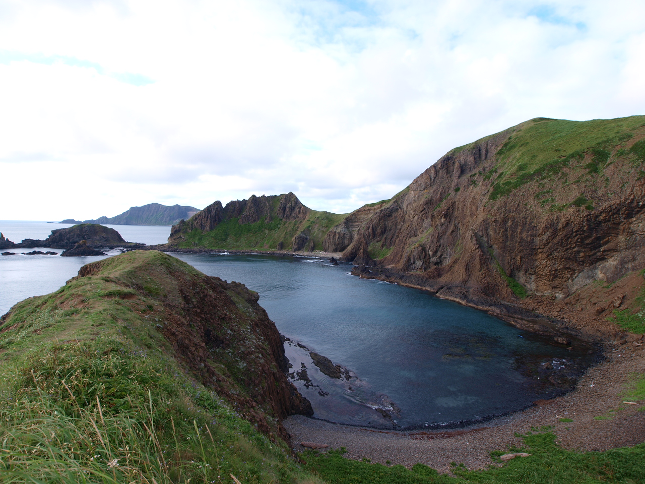 | ゴロタ岬から見るゴロタノ浜・稲穂ノ崎・岡田ノ崎。礼文岳には雲がかかっている。 |