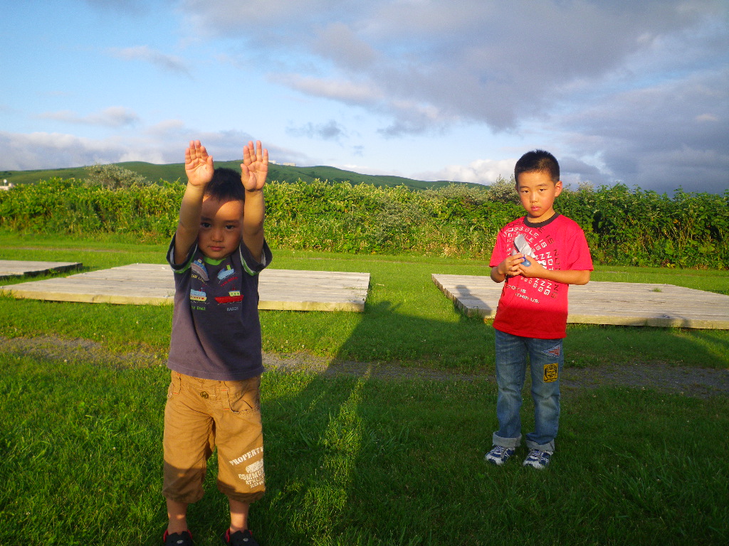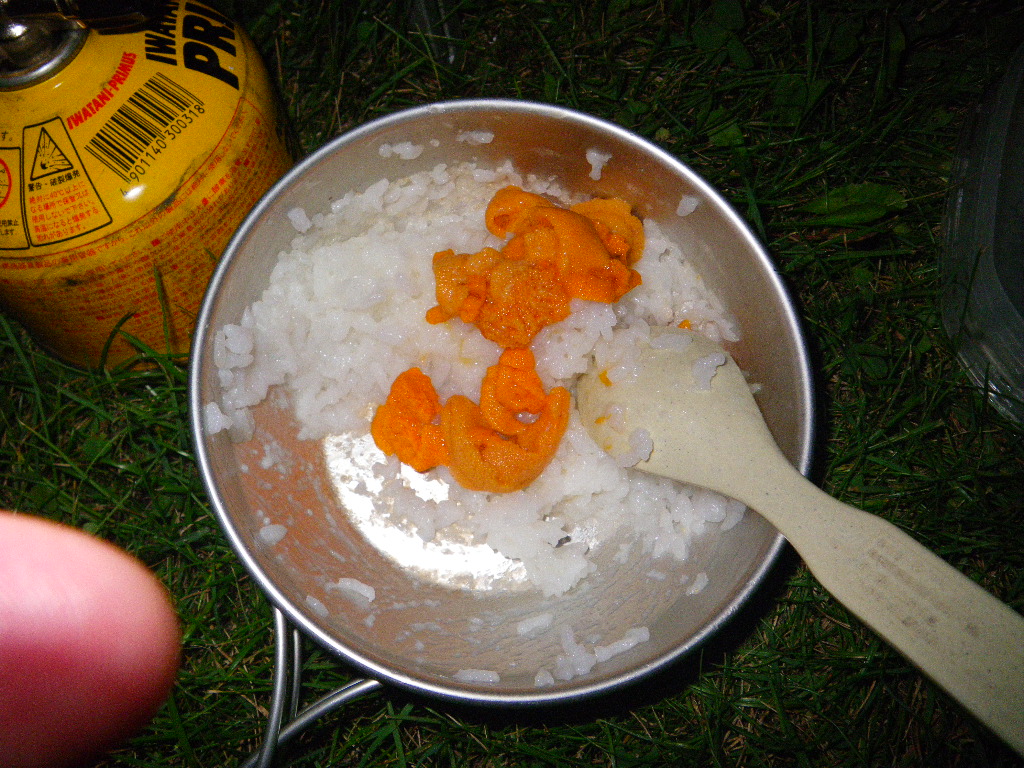 | 久種湖畔キャンプ場は、芝生の綺麗な広々としたキャンプ場だった。ファミリーキャンプ場らしく子供が遊びに来たり、食事はバイク乗りの彼と歩きの彼らを誘い振舞いご飯してしまった。今日は、礼文のエゾバフンウニ丼と、烏賊の胆炒めとバイクのりが買ってきた重ね巻き、これが絶品お土産に買ってしまった。今回も物量で圧倒、感謝?びっくりされたぞ。 |