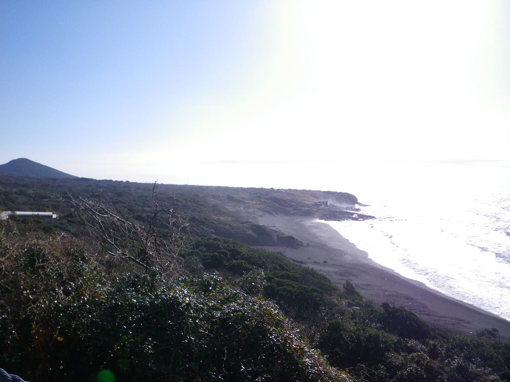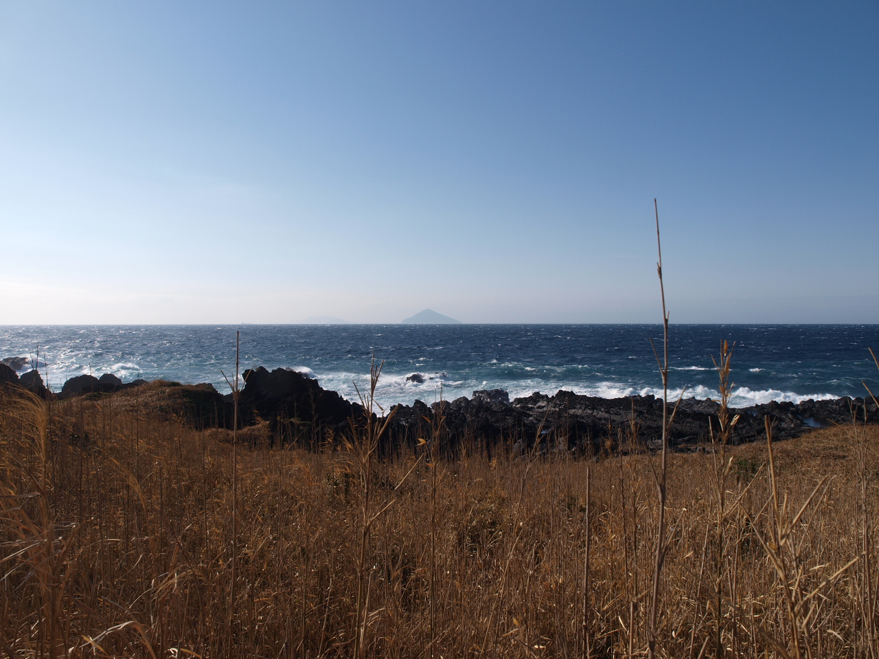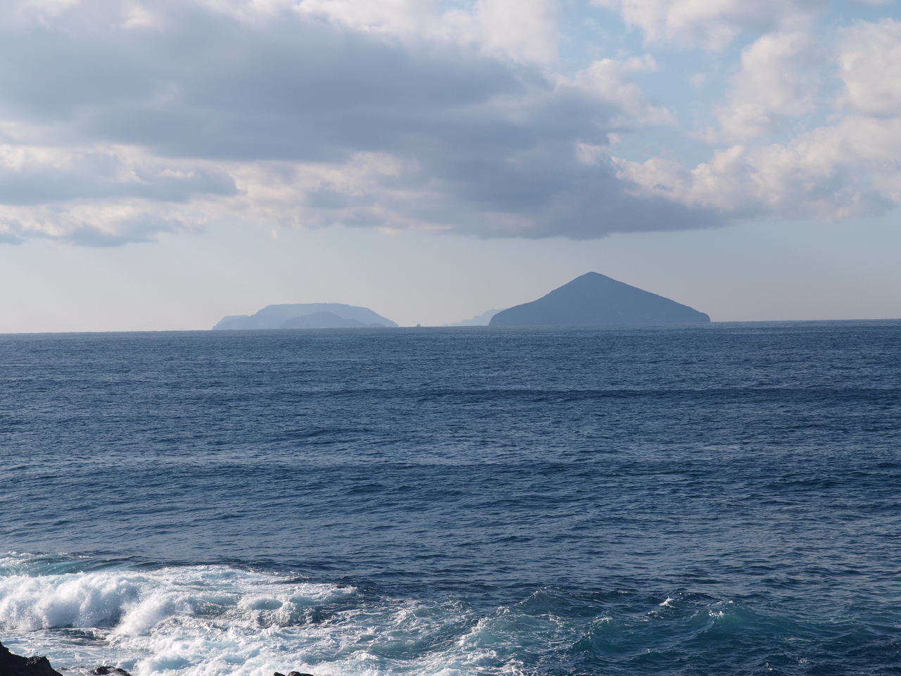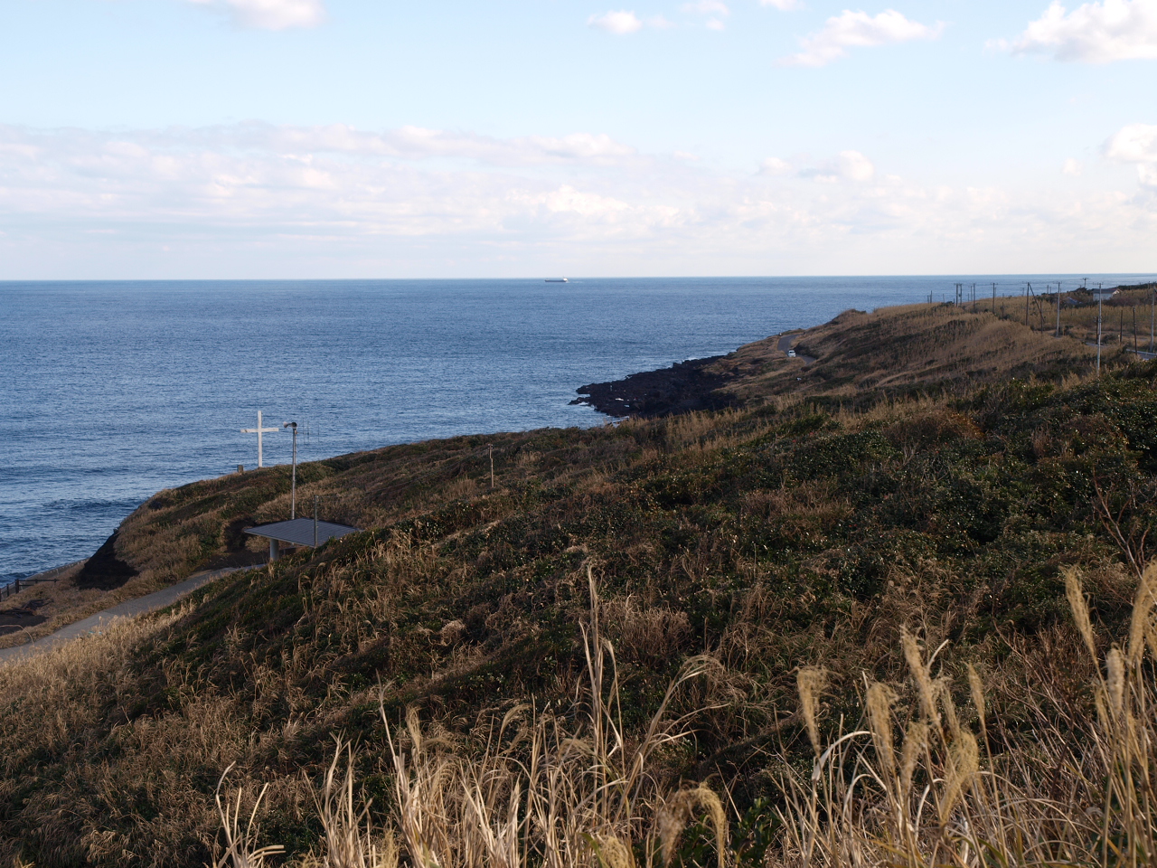 ここが伊豆諸島展望台なのだろうか塩を作る巨大な装置のある岬からは利島・新島・神津島の島影が見える。