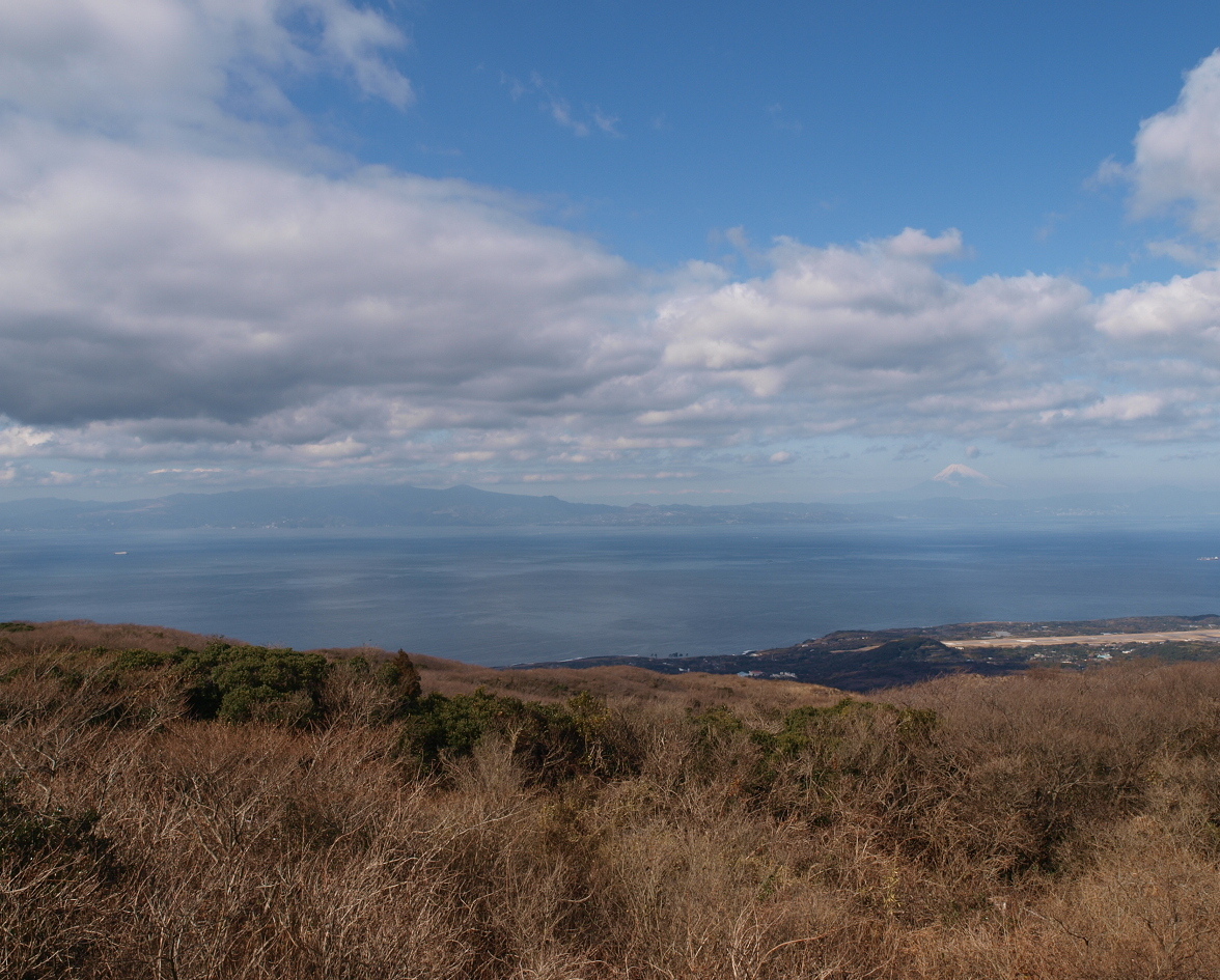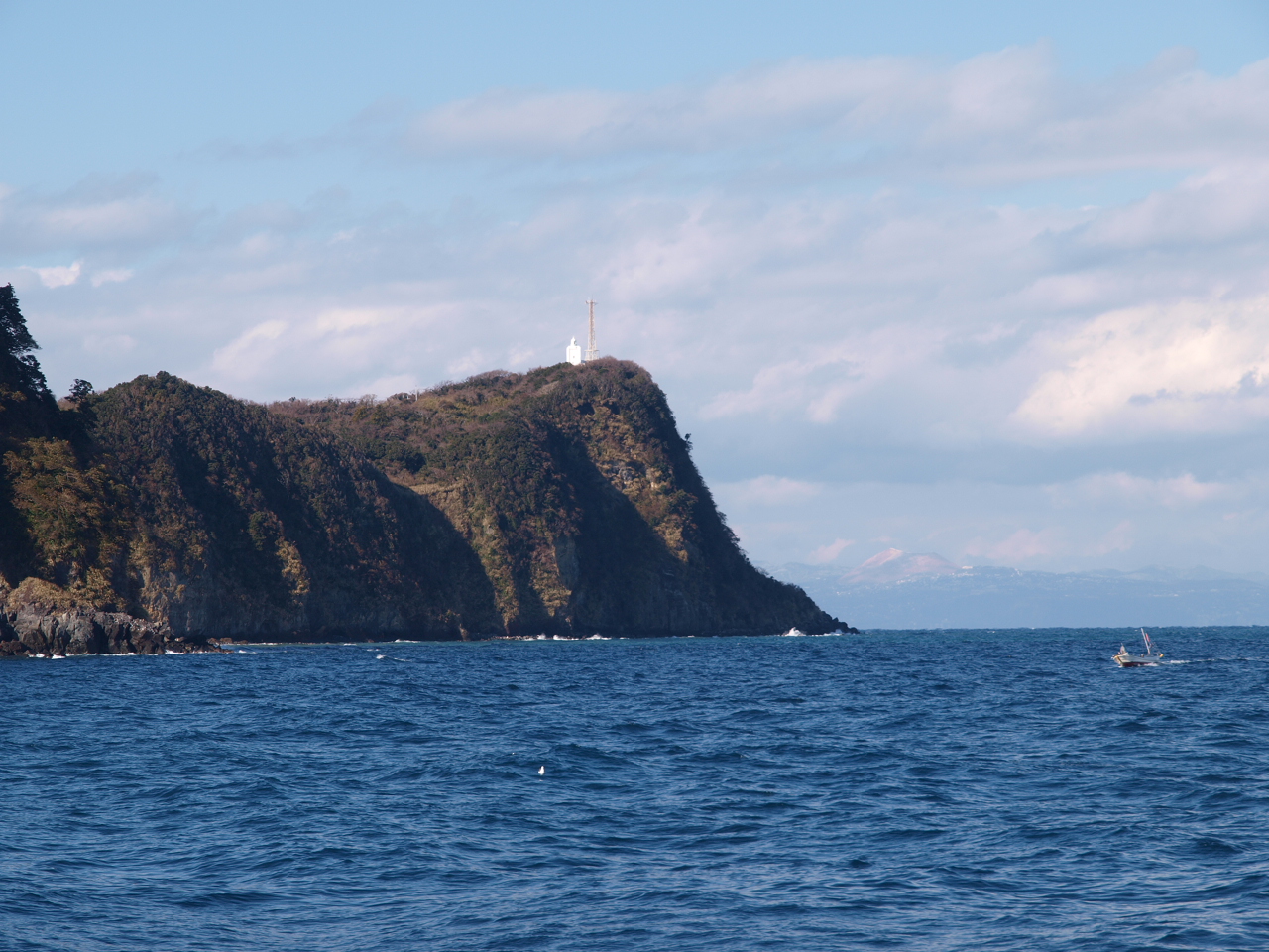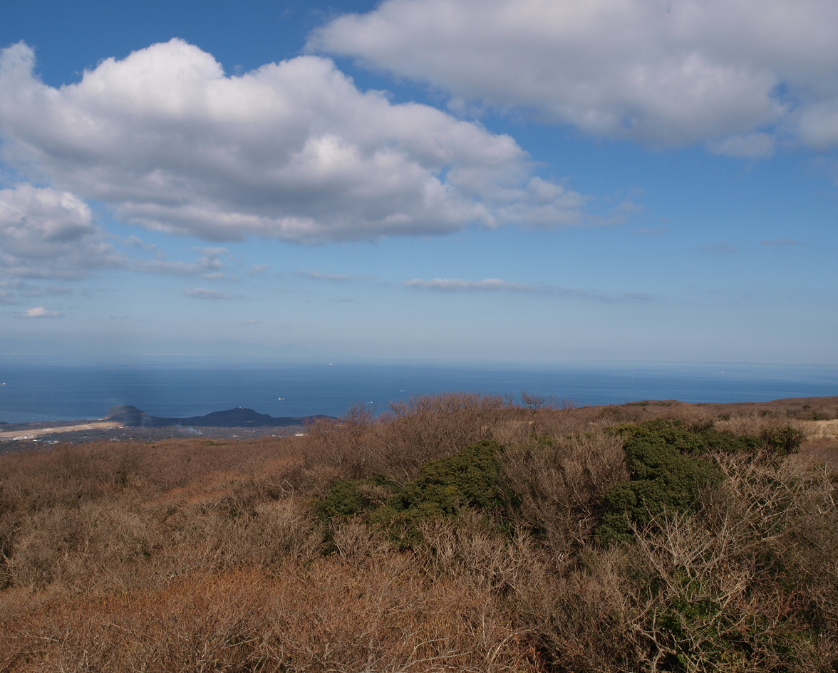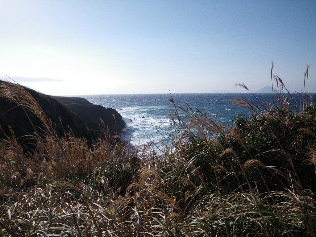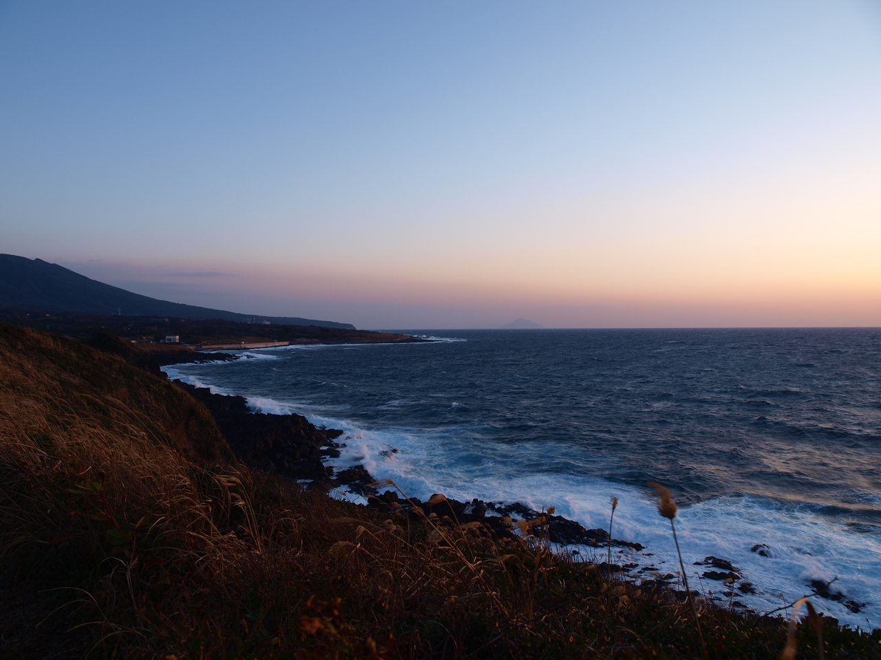 ここが伊豆諸島展望台なのだろうか塩を作る巨大な装置のある岬からは利島・新島・神津島の島影が見える。