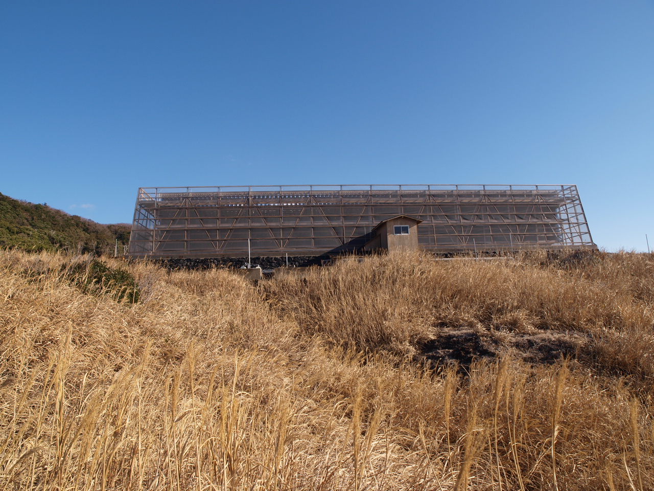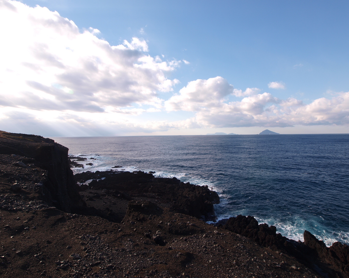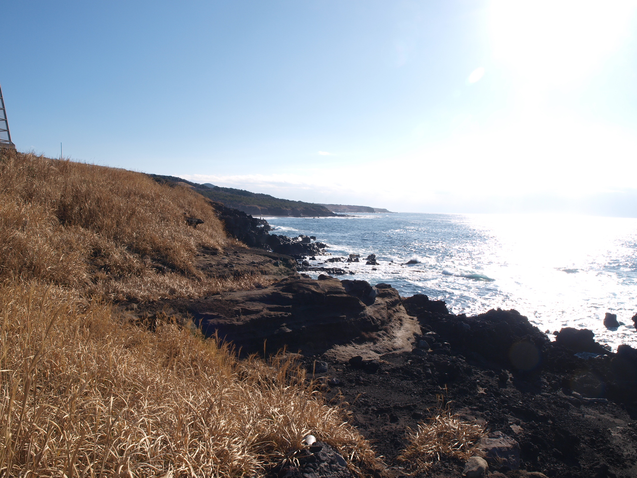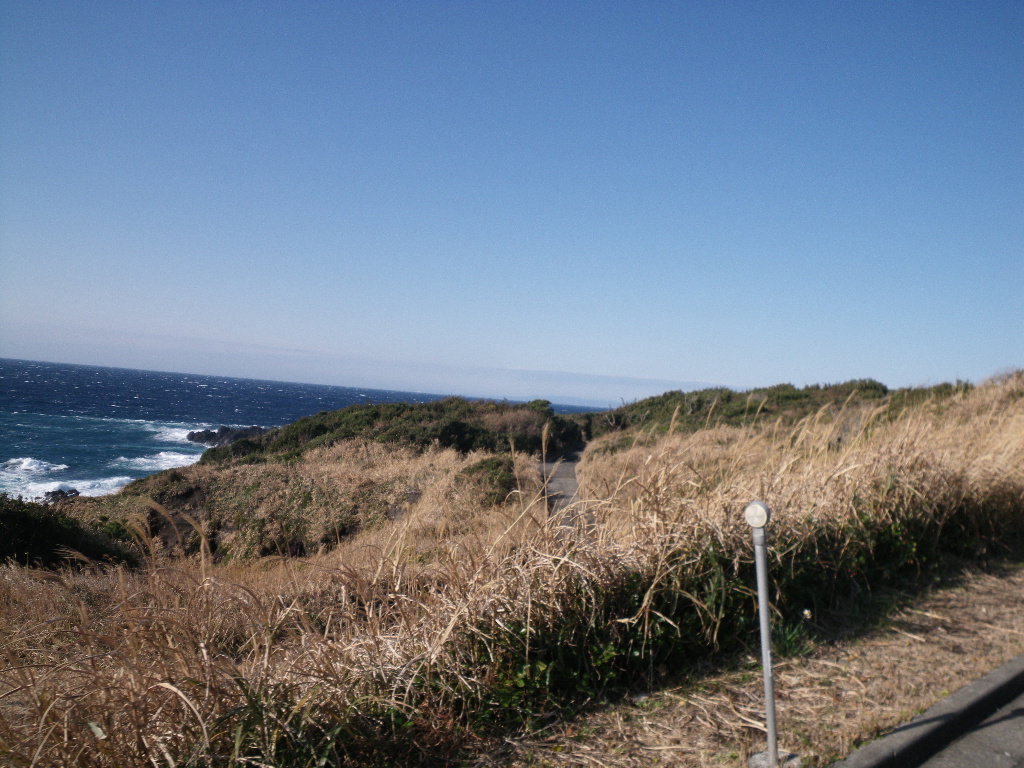 ここが伊豆諸島展望台なのだろうか塩を作る巨大な装置のある岬からは利島・新島・神津島の島影が見える。