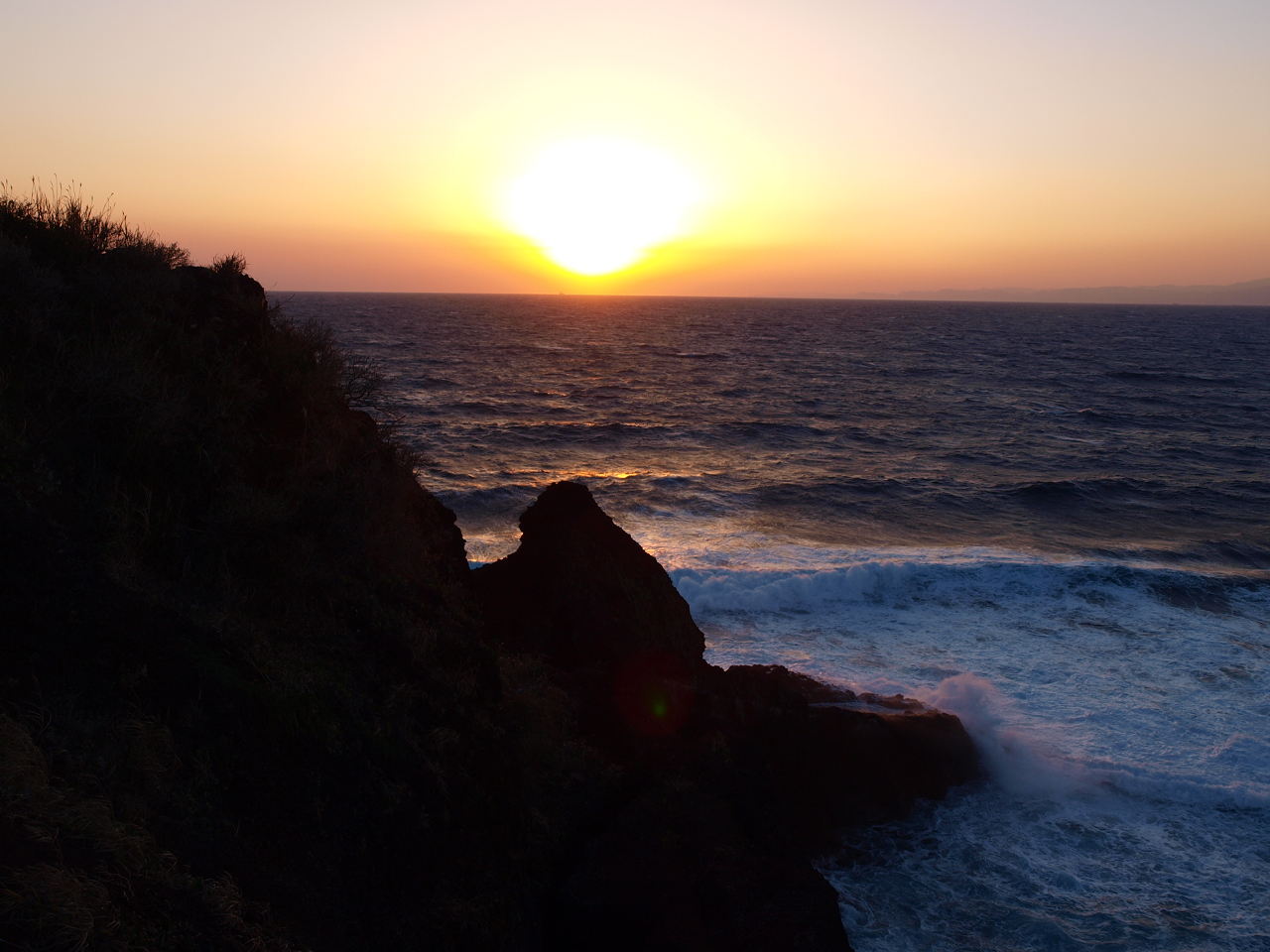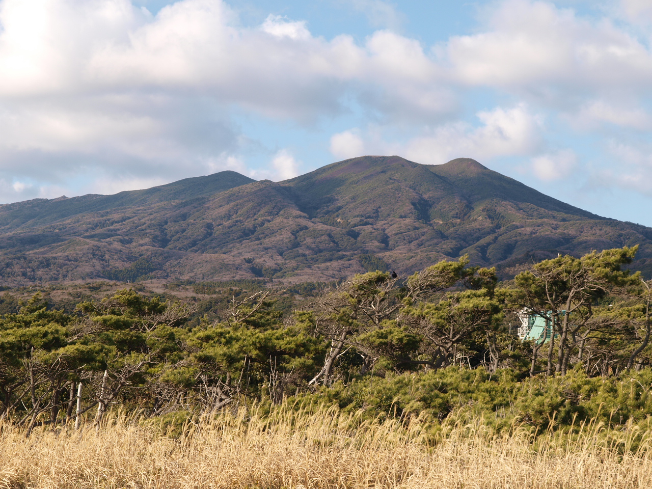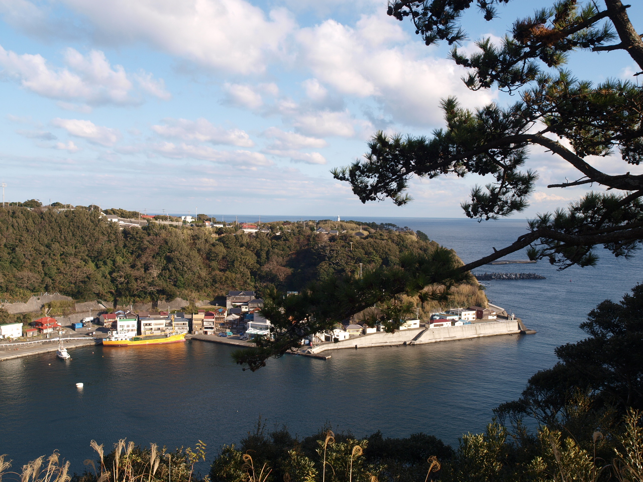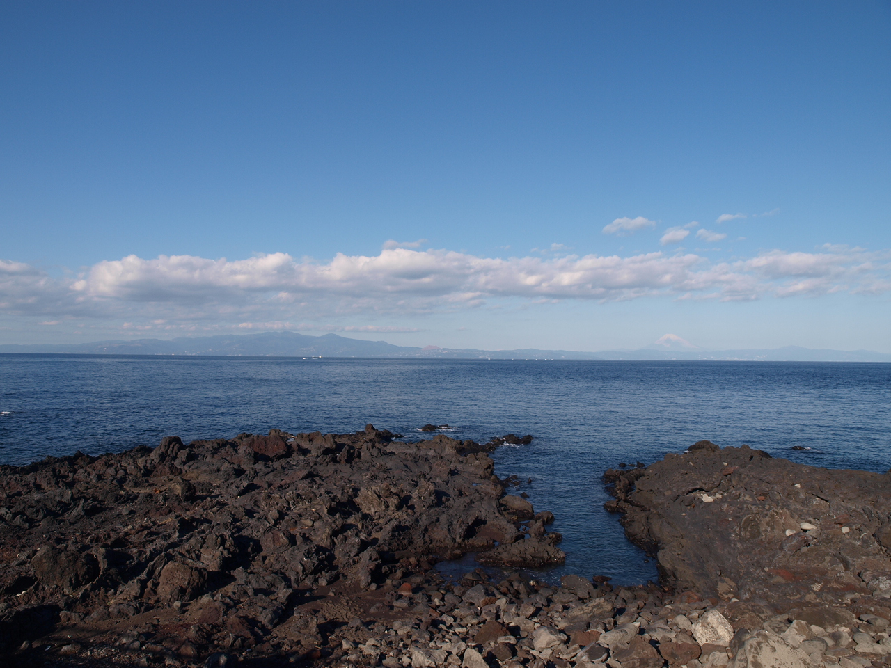 ここが伊豆諸島展望台なのだろうか塩を作る巨大な装置のある岬からは利島・新島・神津島の島影が見える。