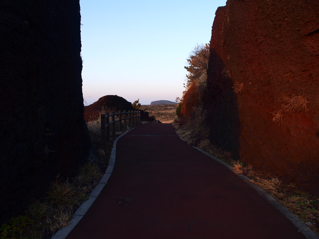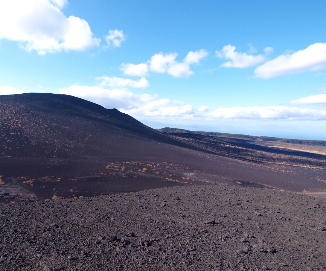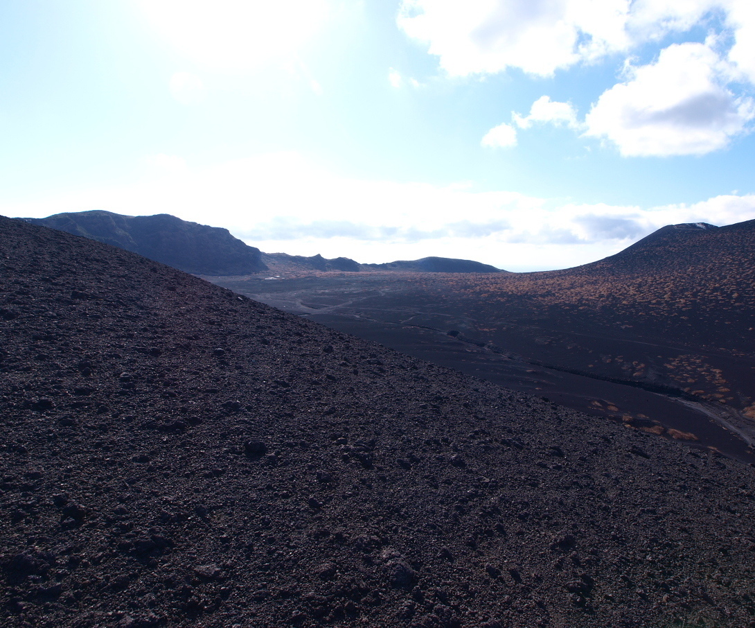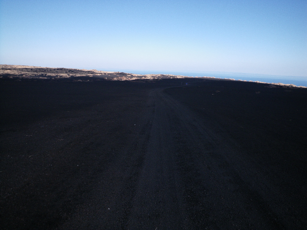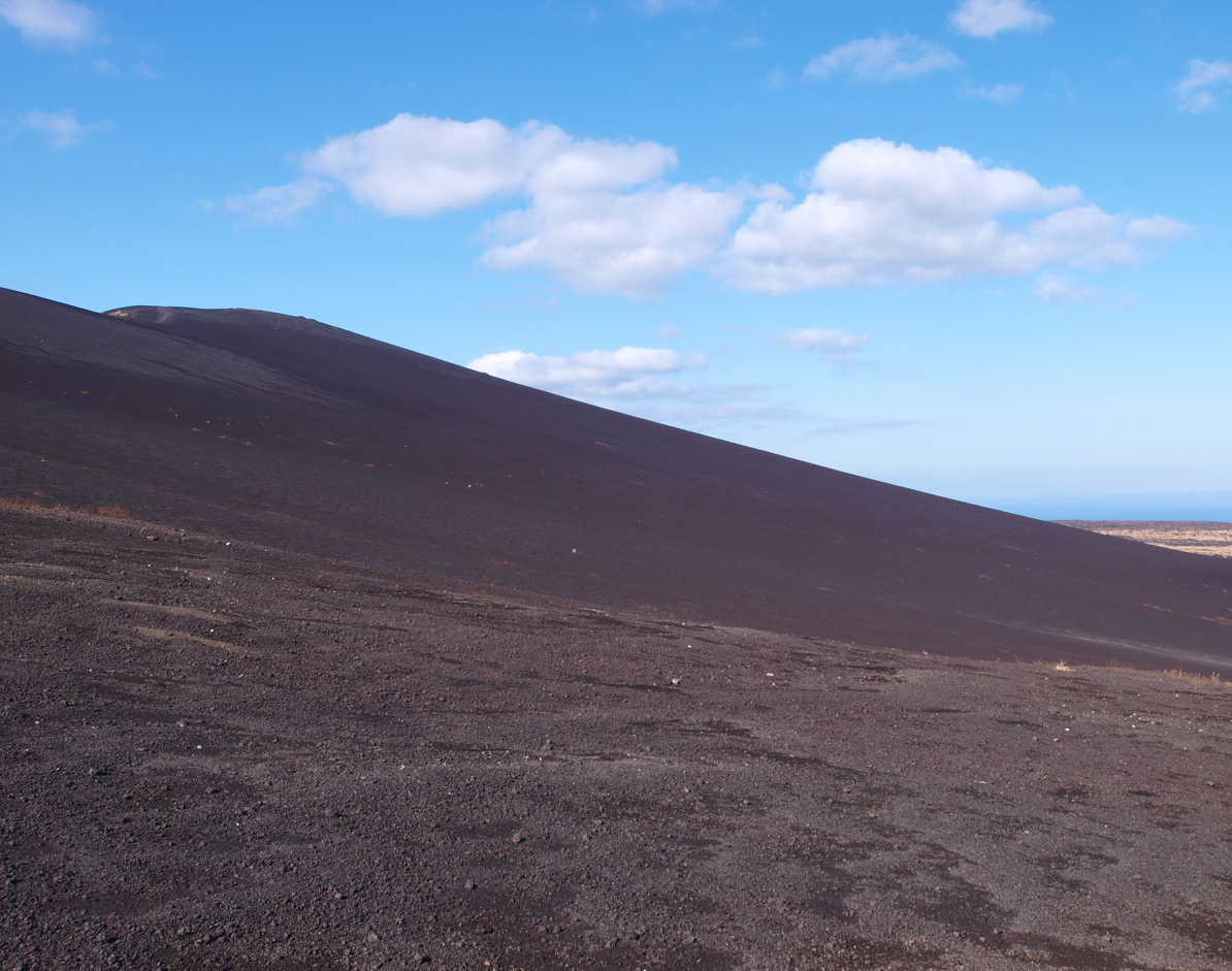 登山口からは溶岩が流れ出た様子がよくわかる、赤く塗ればそのまま溶岩流のようだ。昨日見た砂漠側とは様子が相当違うカルデラの中を火口に向かう。