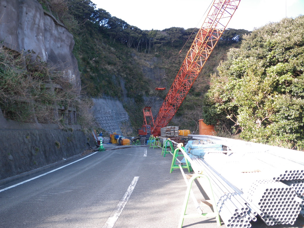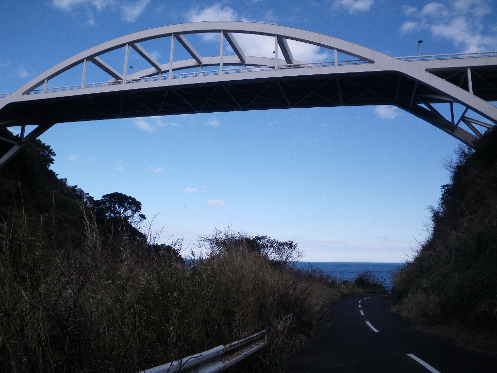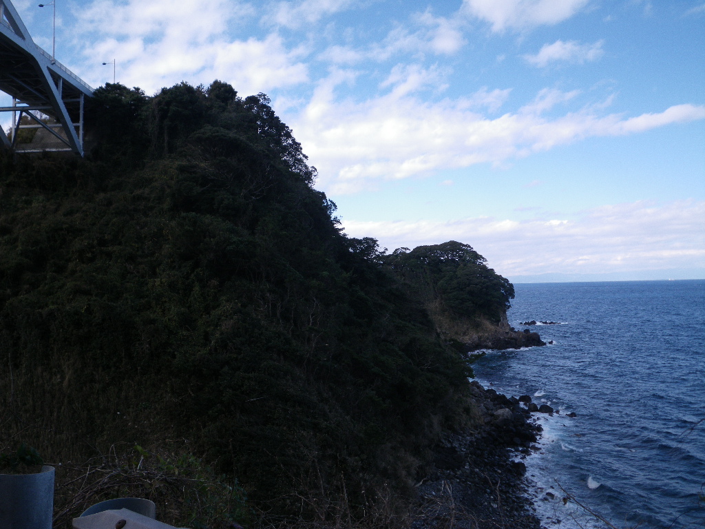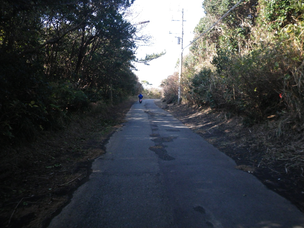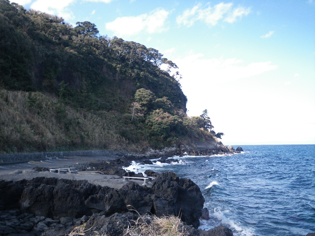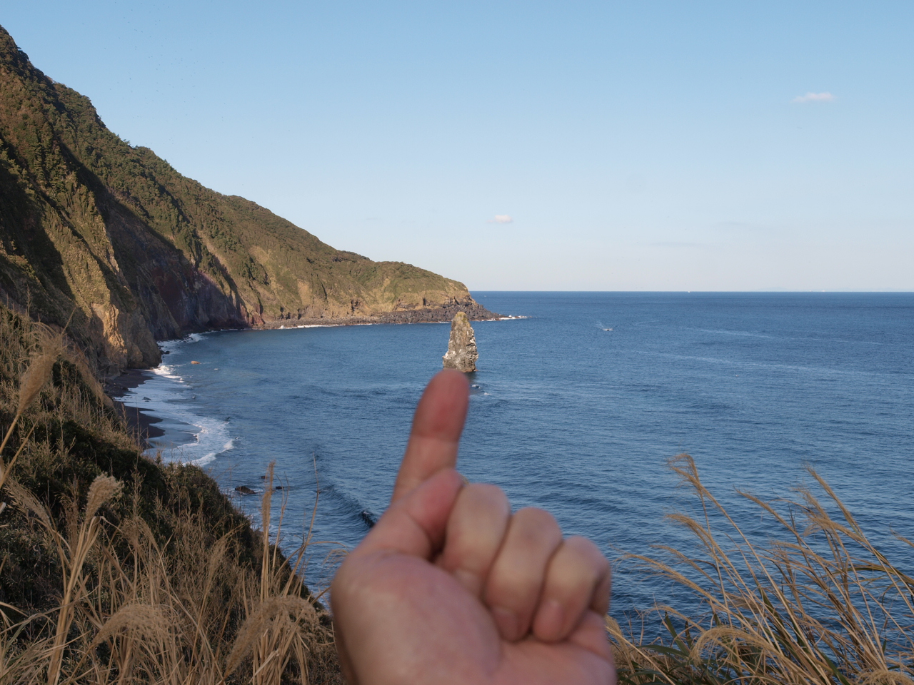 外輪山を後にして大島一周道路で筆島へ向かうが土砂崩れで一部通行止め。観光ポイントになっている筆島は、見た目何の感動も持たないが、火山の火道で溶岩が固まったものらしい。