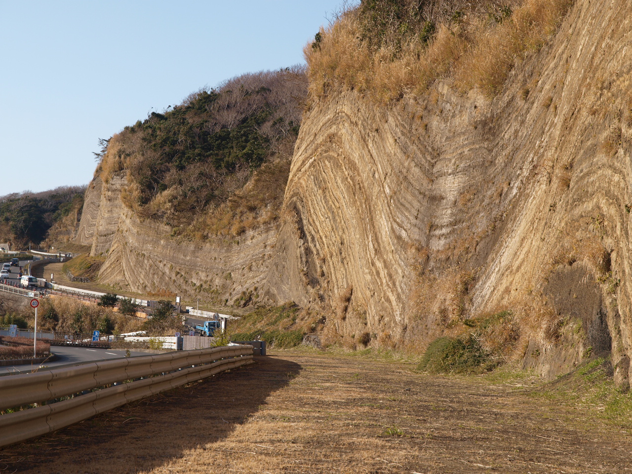 バームクーヘン 道路拡幅で切り取られた地層が見事な縞模様になっていて大島の観光名所に?しかしだんだんと模様の美しさが失われてきているような気がする。
