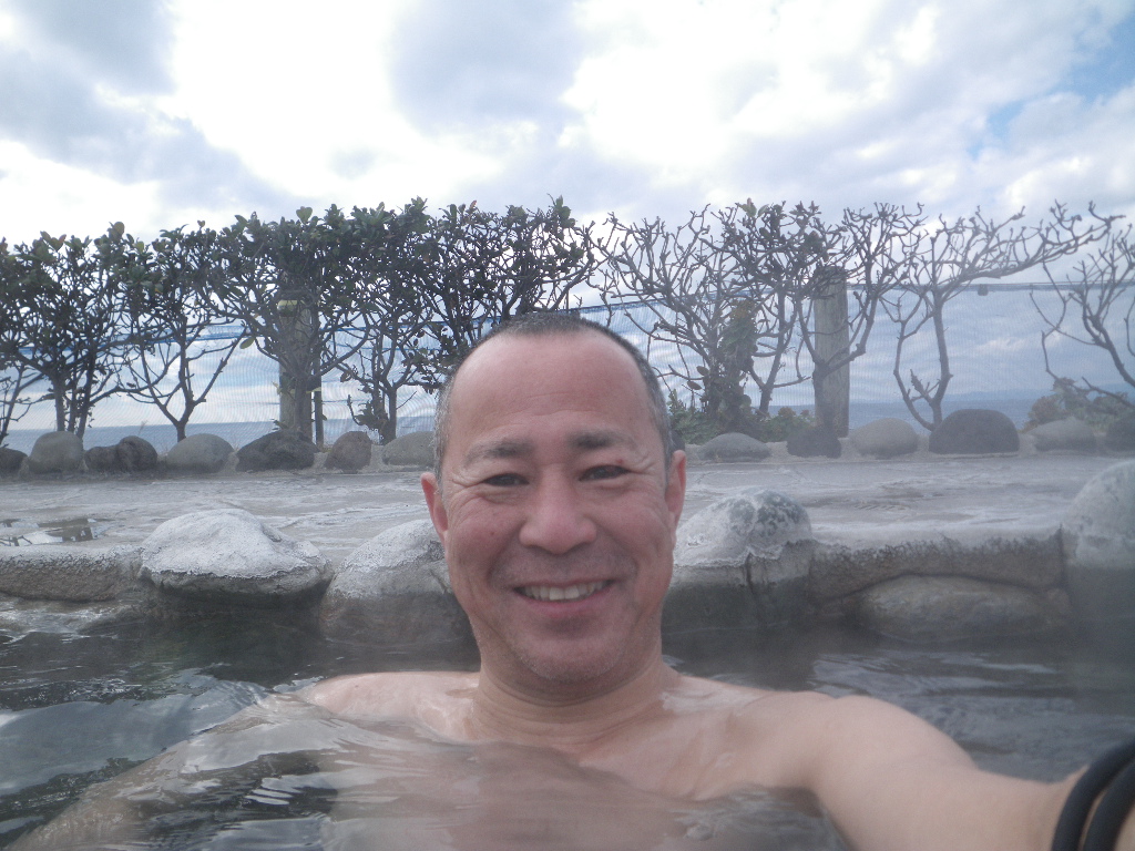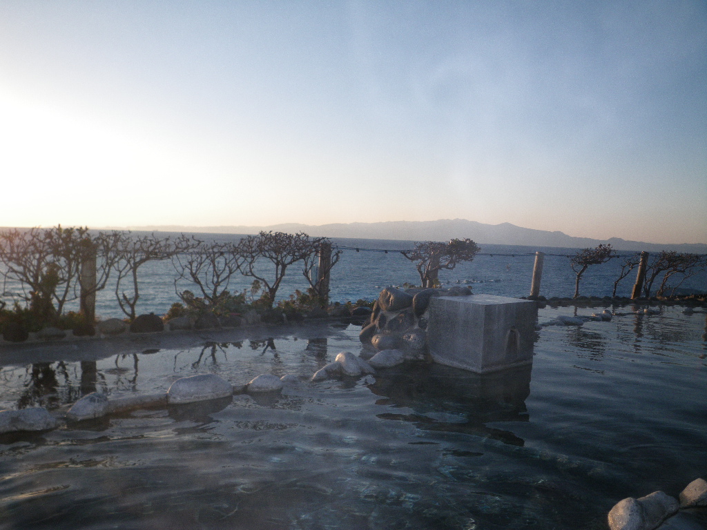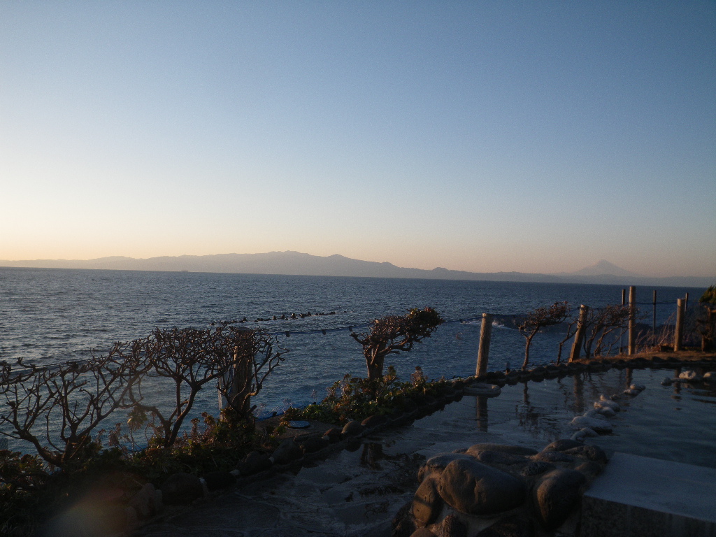大きな温泉施設が隣にあるのだがここの眺めは捨てられない。湯船の正面には伊豆半島が、夕陽が沈むのは伊豆半島の先、夕方夕陽を見ながら入るのが一番贅沢かもしれない。水着着用なのが残念だが温度が低い目なのかいつまでもゆっくり入れるし湯船が大きいので混雑することはないだろう(夏に来た事がないのでわからないが)。