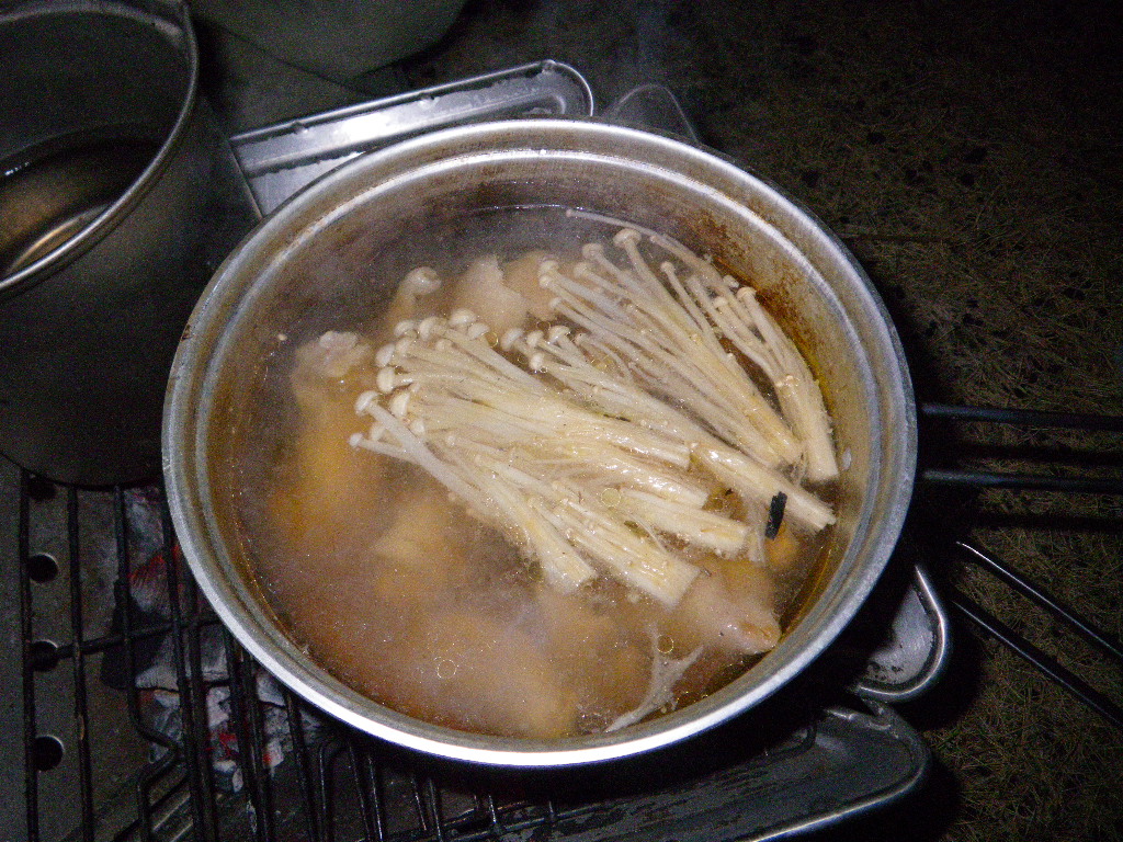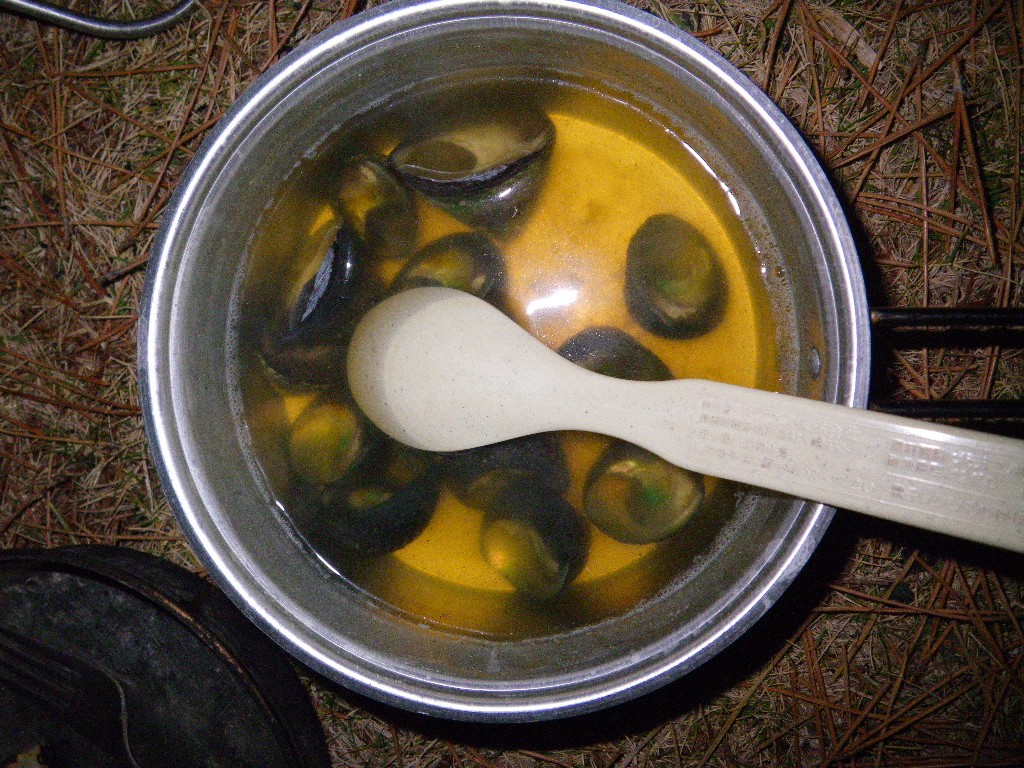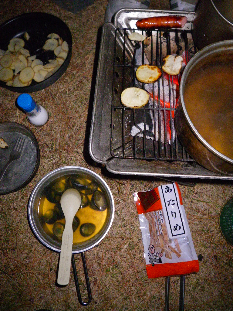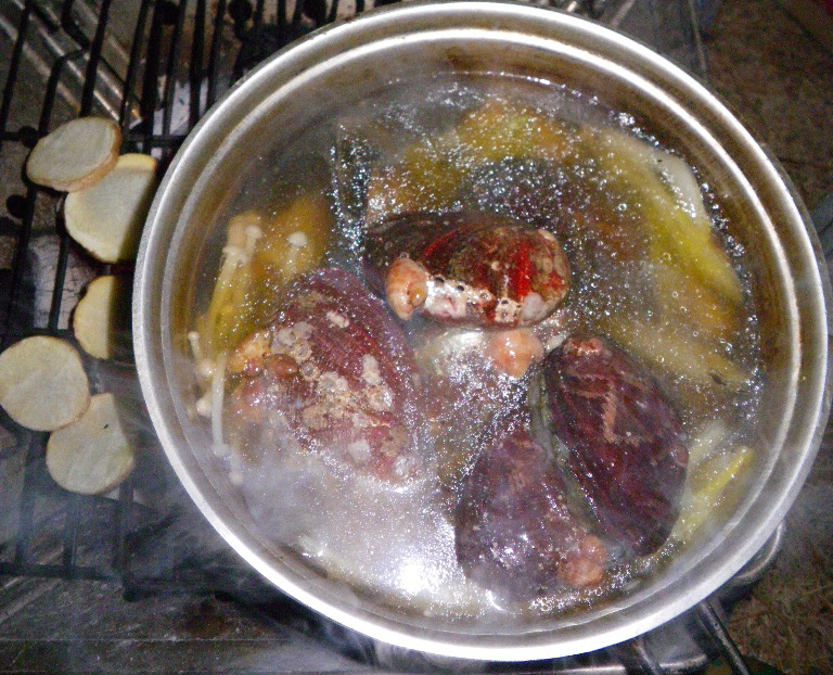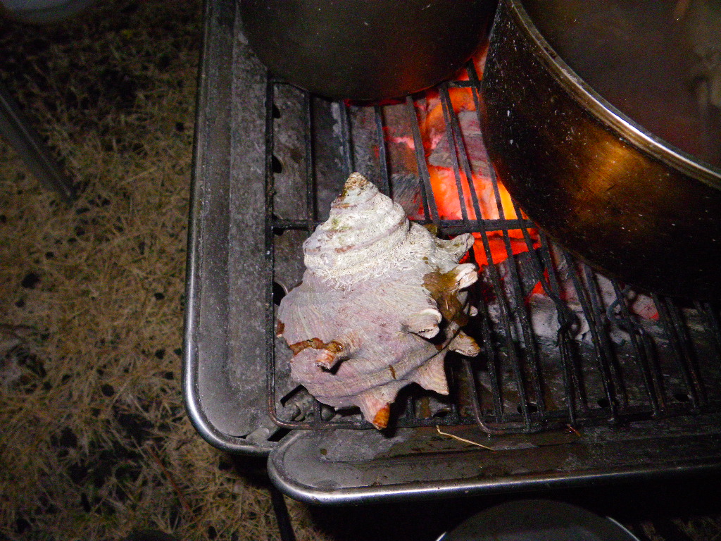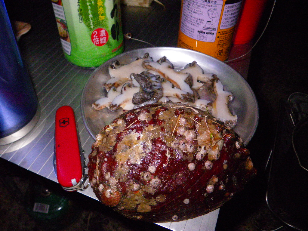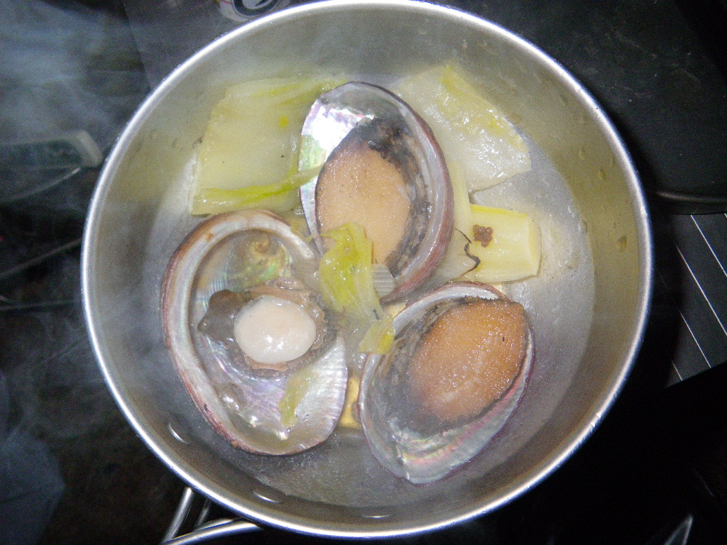 近くでテントを張っていたキャンパーも仲間入りして宴会の開始。今日は海市場でとこぶしを15個仕入れてとこぶし鍋だ。海市場でとこぶし1Kg4000円弱(約25個)だ。つまみにはシッタカを塩茹でして食べる。