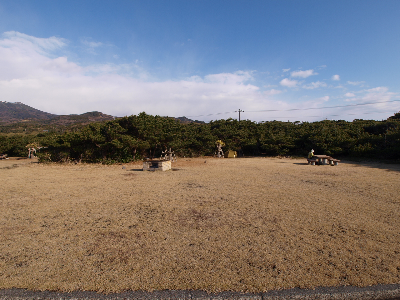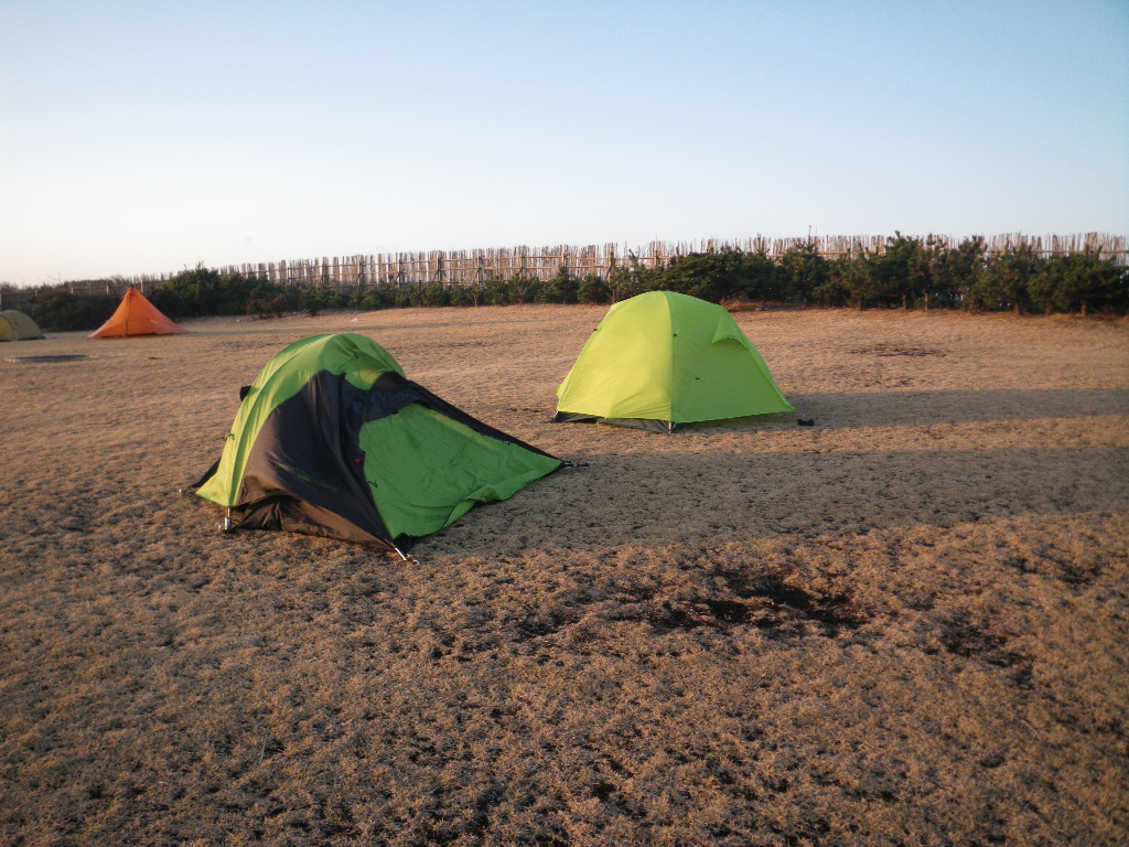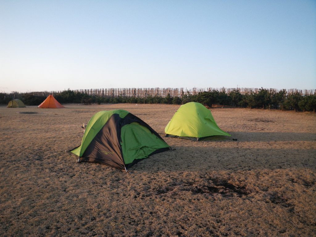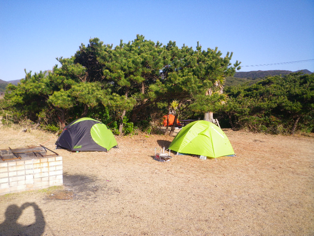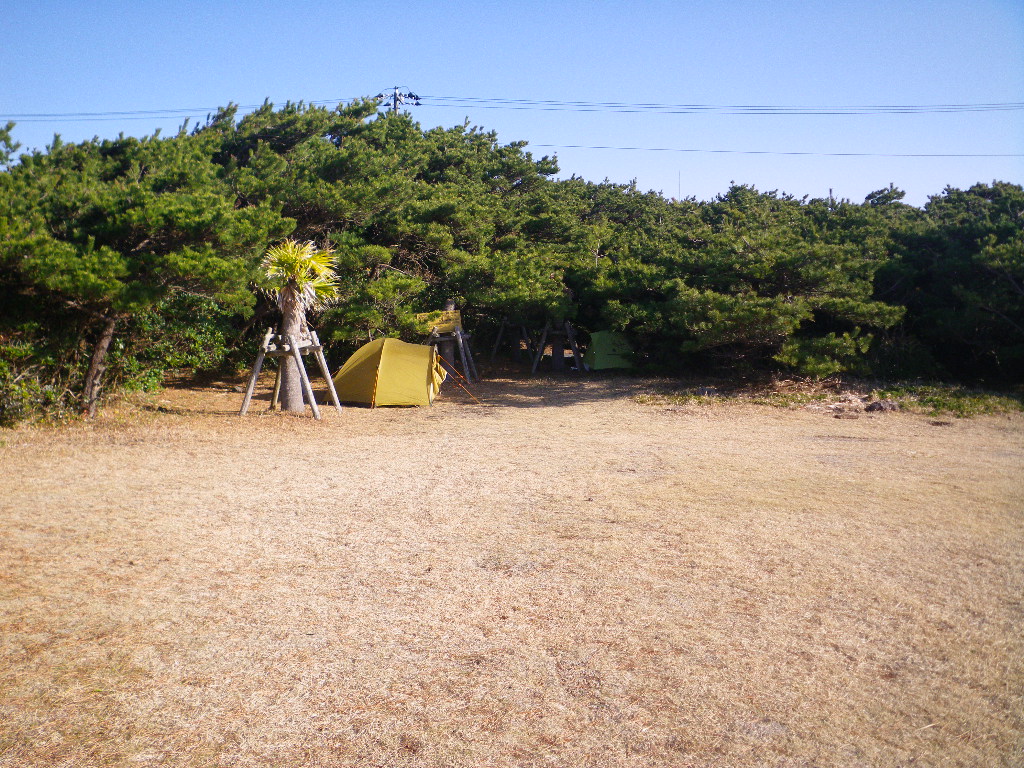 キャンプ場横の海岸は強い風で白波がぴょんぴょん。キャンプ場は、すべてのテントが林間や木の陰に移動しちゃいました。