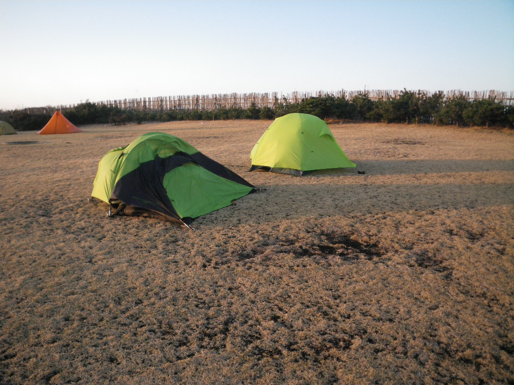 広いゆったりしたキャンプ場だが、夜から恐ろしいほどの強風でテントがペグからはずれ、風の勢いで飛ばされそうのなり仕方なく夜中にテントをペグに引っ掛けたほどだった。朝になってもかぜは吹き止まず風に押されぺったんこになるテントも。中には夜中に引越ししたテントもあるようでした。。