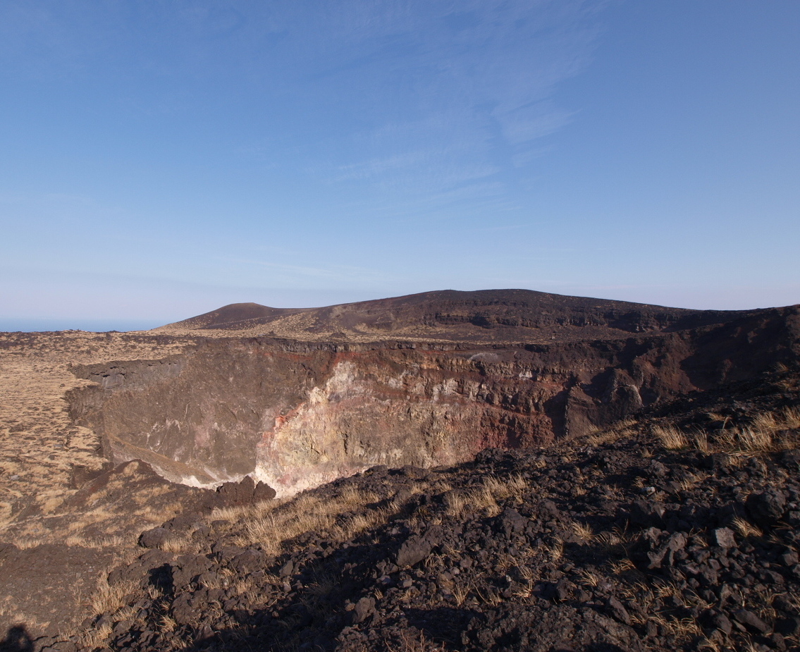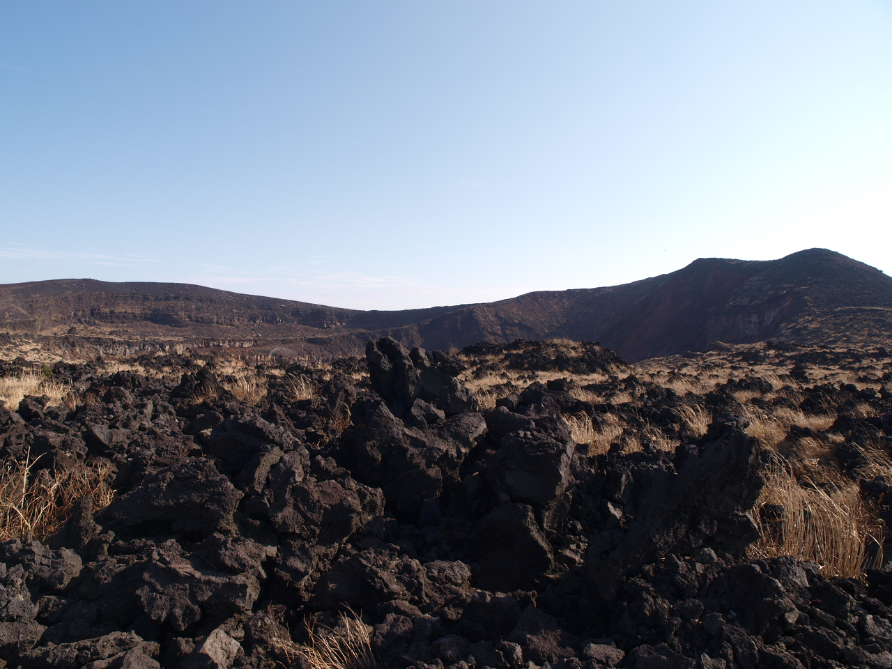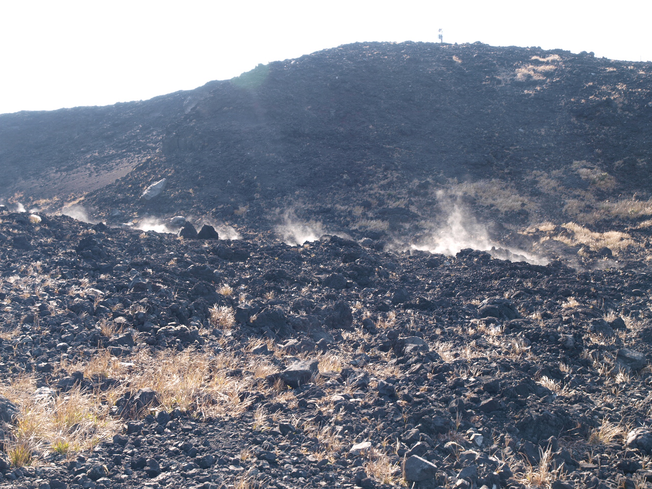 中央火口丘の溶岩がごろごろ。なにやら湯気?煙が出ている部分も