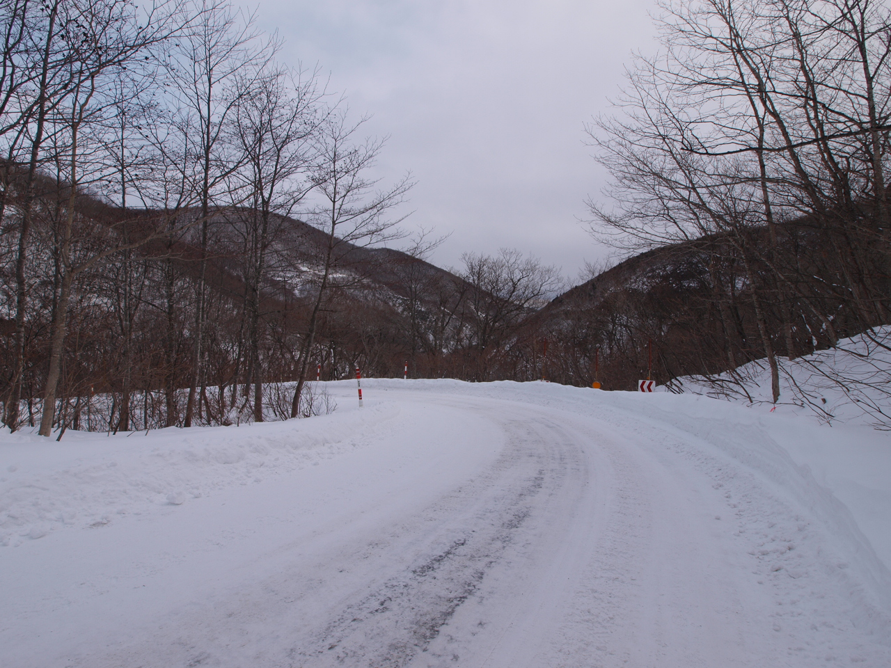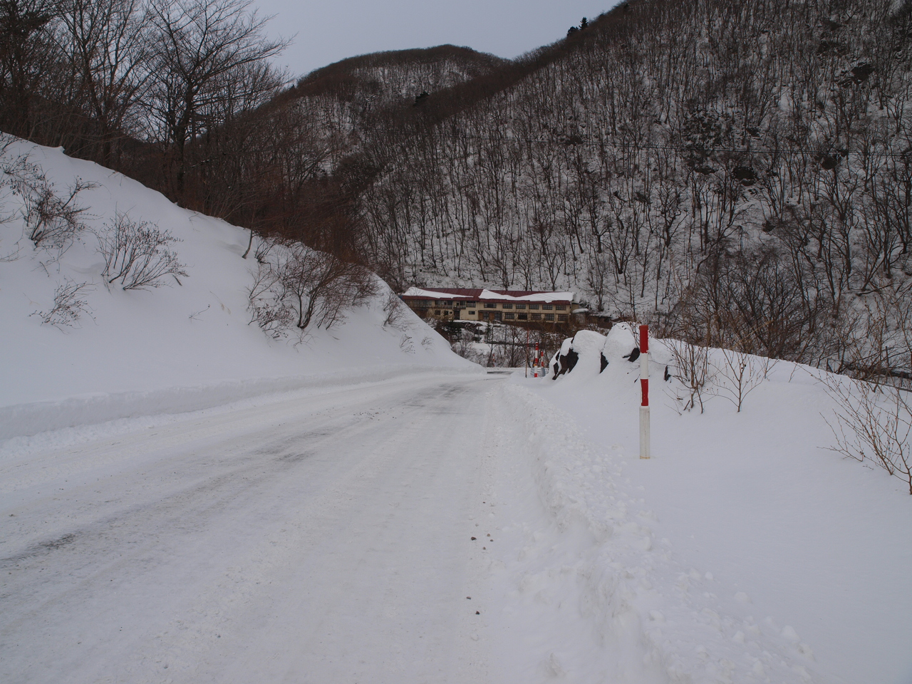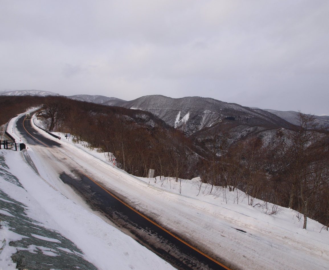 | エコーラインに入るとすぐに雪道となるが、峩々温泉に向かう県道に入ると下りが急なだけに恐ろしい道となる。遠刈田より送迎してもらって正解だ。 |