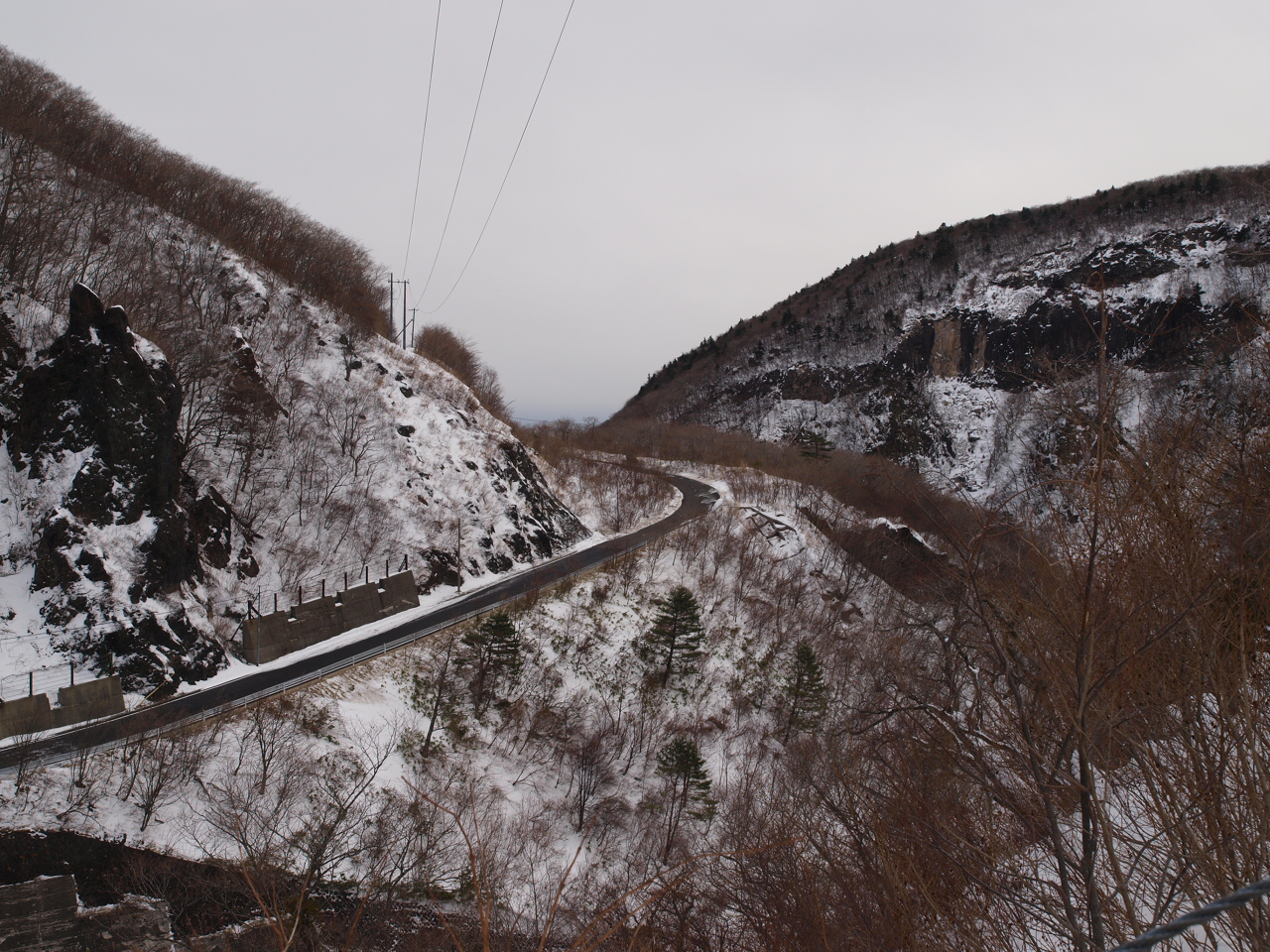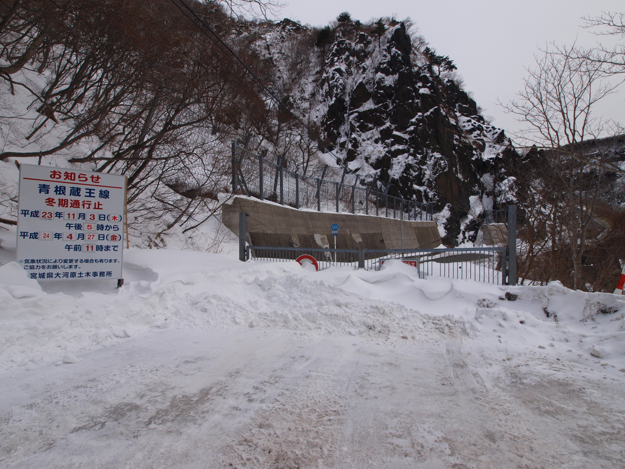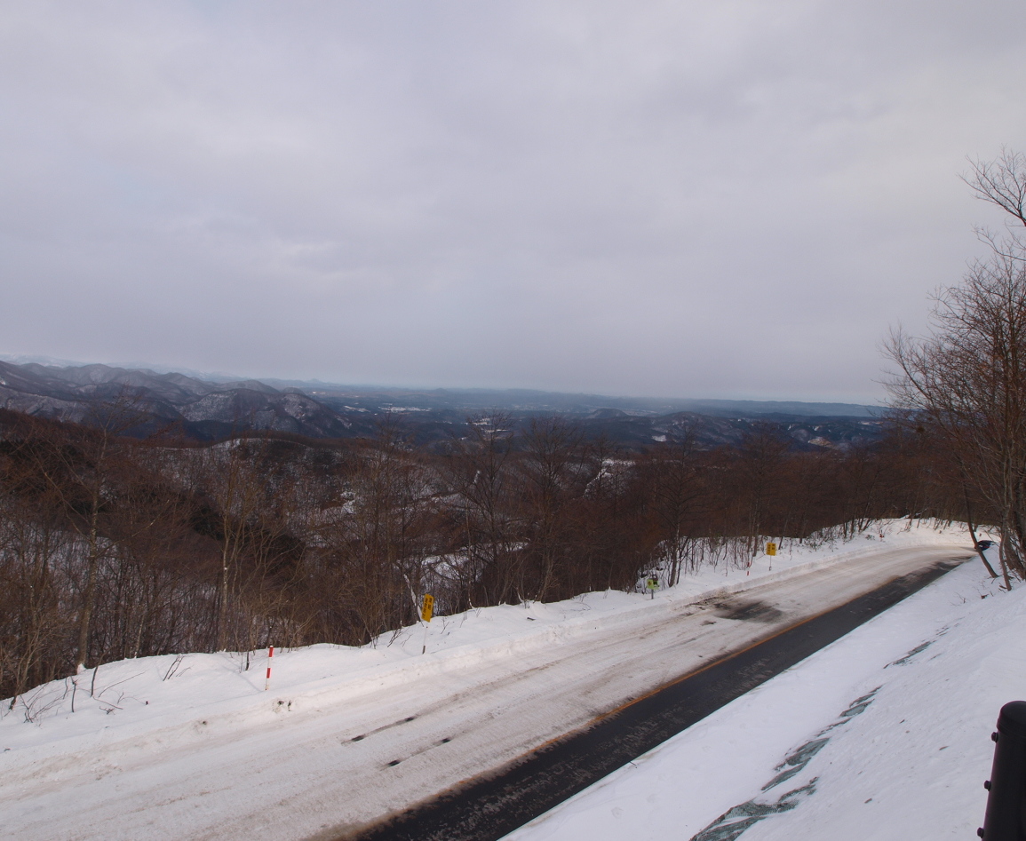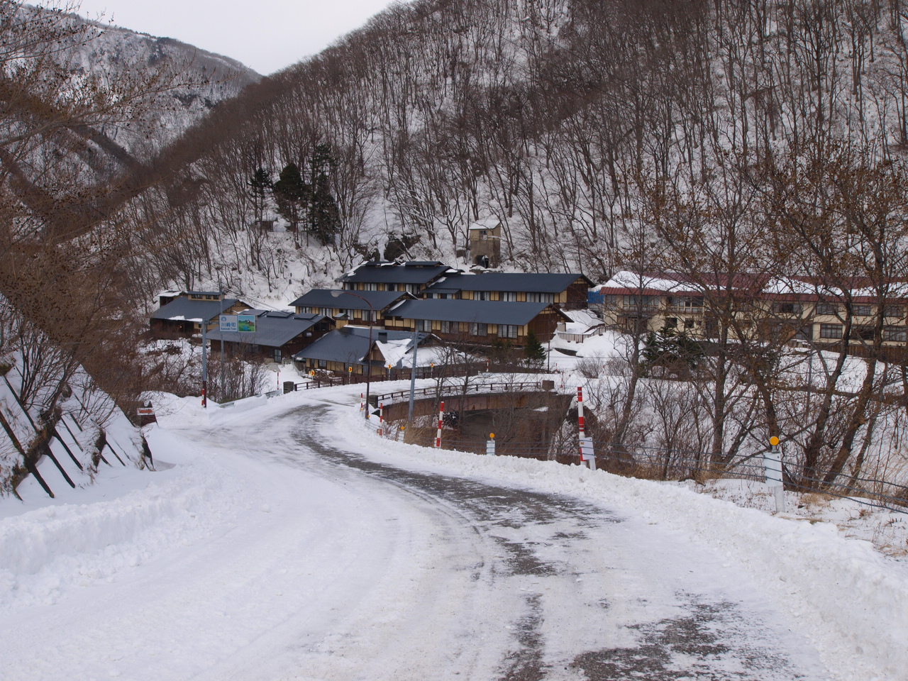 | エコーラインに入るとすぐに雪道となるが、峩々温泉に向かう県道に入ると下りが急なだけに恐ろしい道となる。遠刈田より送迎してもらって正解だ。 |