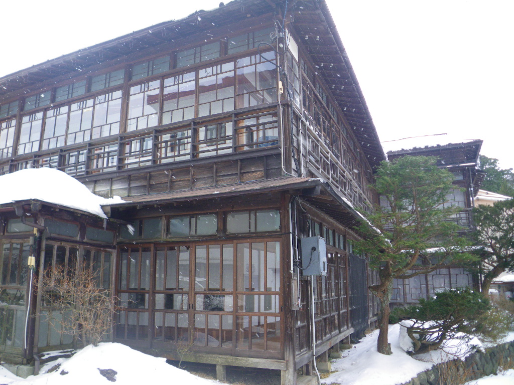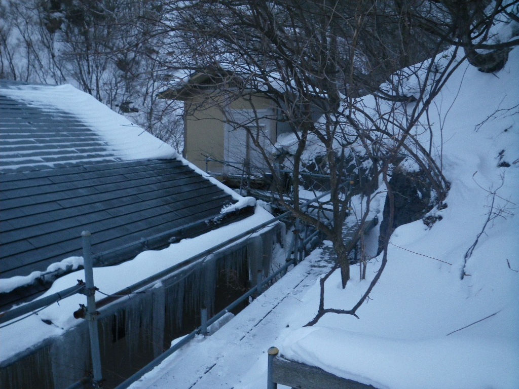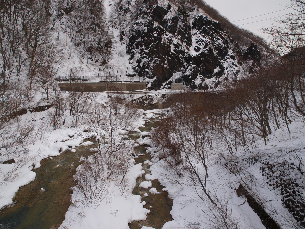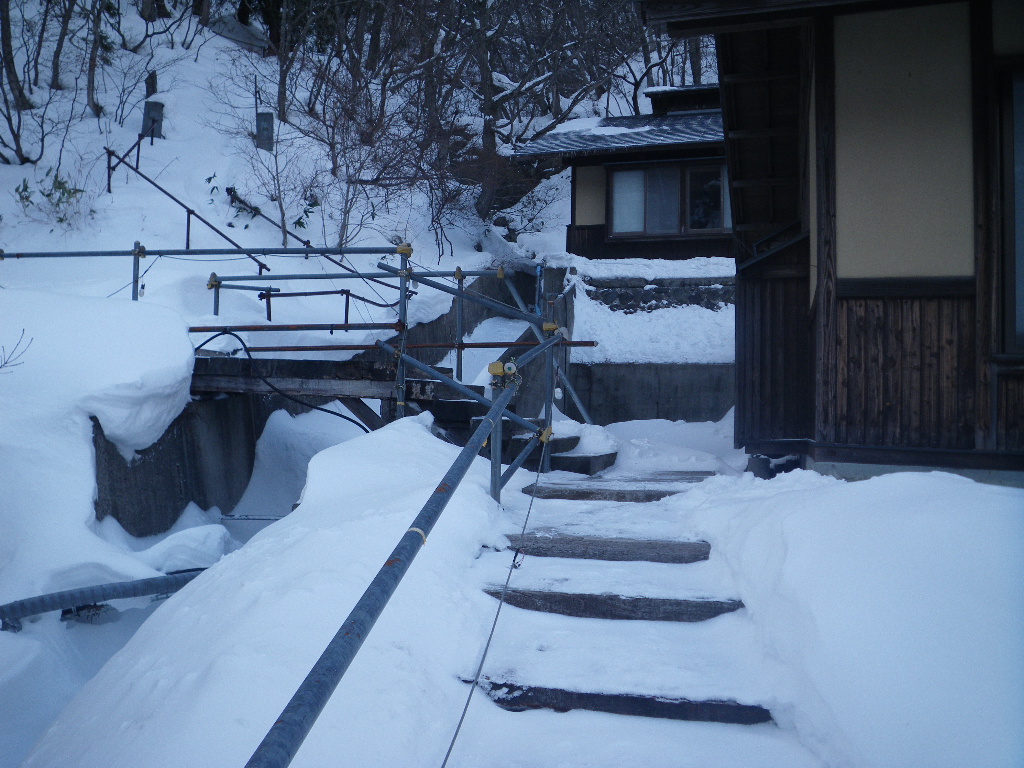 | 山間にある一軒やどの温泉、冬場はここに用のある人しか来ない。湯治場となっている棟と旅館の棟があり温泉も別だ。 |