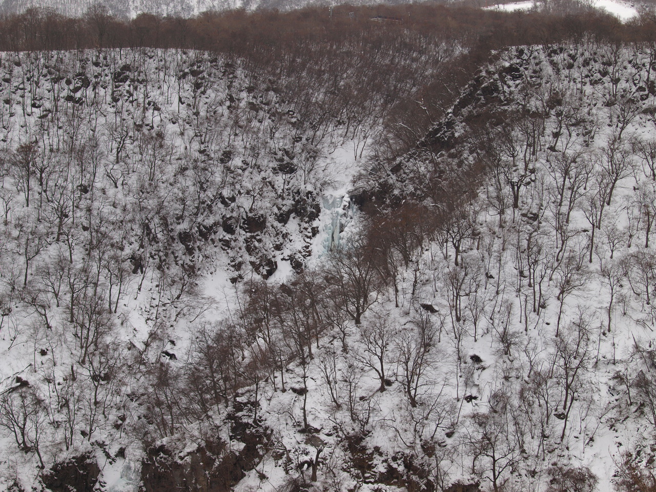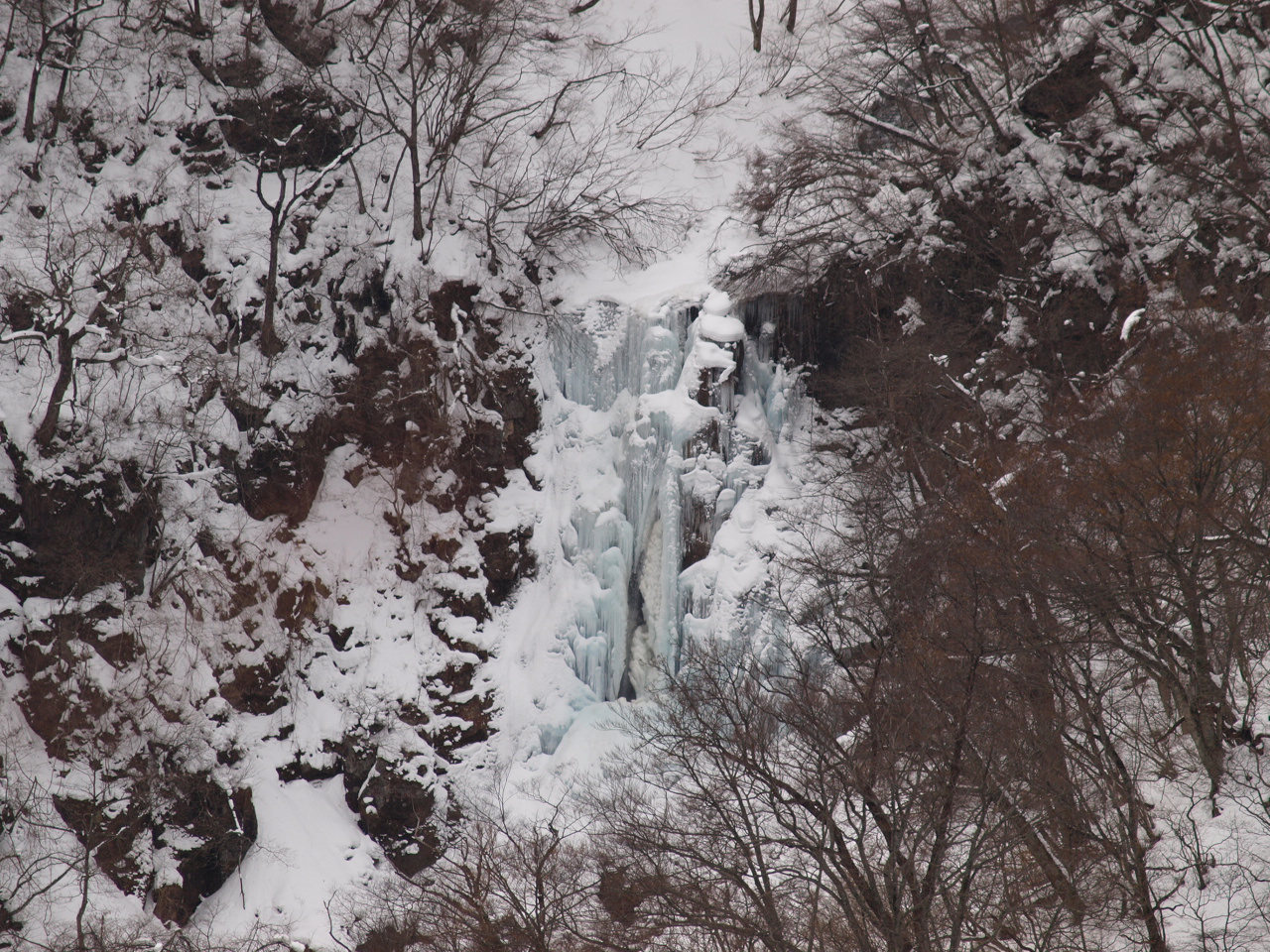 | 三段の滝もこの通り凍結。アイスブルーが綺麗。アイスクライミングができるそうだが近年は温暖化のためか凍りにくくなっているらしい。 |