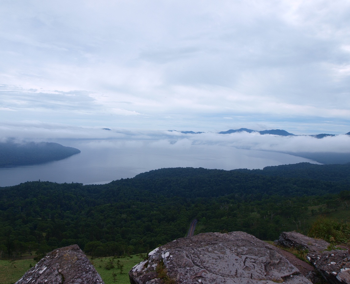 | 雨を覚悟してスタート、霧の美幌峠を登っていると霧が晴れそうな気配も・・・と思っていると峠の到着まもなく霧が荒れて湖面が見えた、これはラッキー。 |