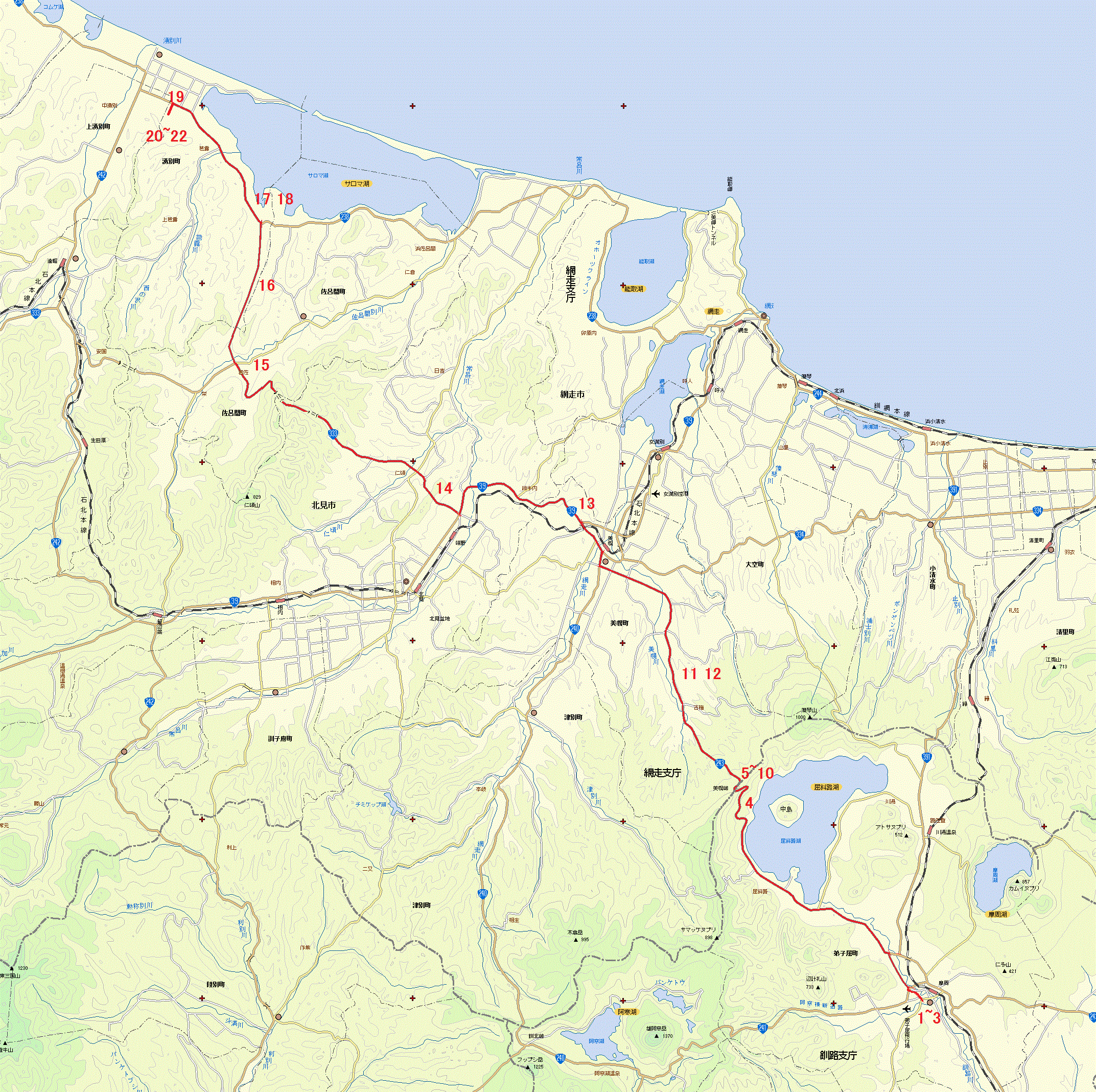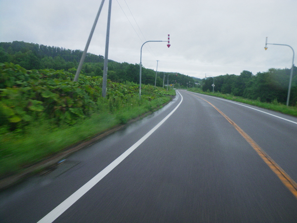 | 予報どおり朝から雨、斜里から能取岬・サロマ湖と海岸線をクッチャロ湖まで走る予定を変更してサロマ湖周辺にキャンプを移すことにする。雨なので景色も期待できないので最も近い道で移動だ。 |