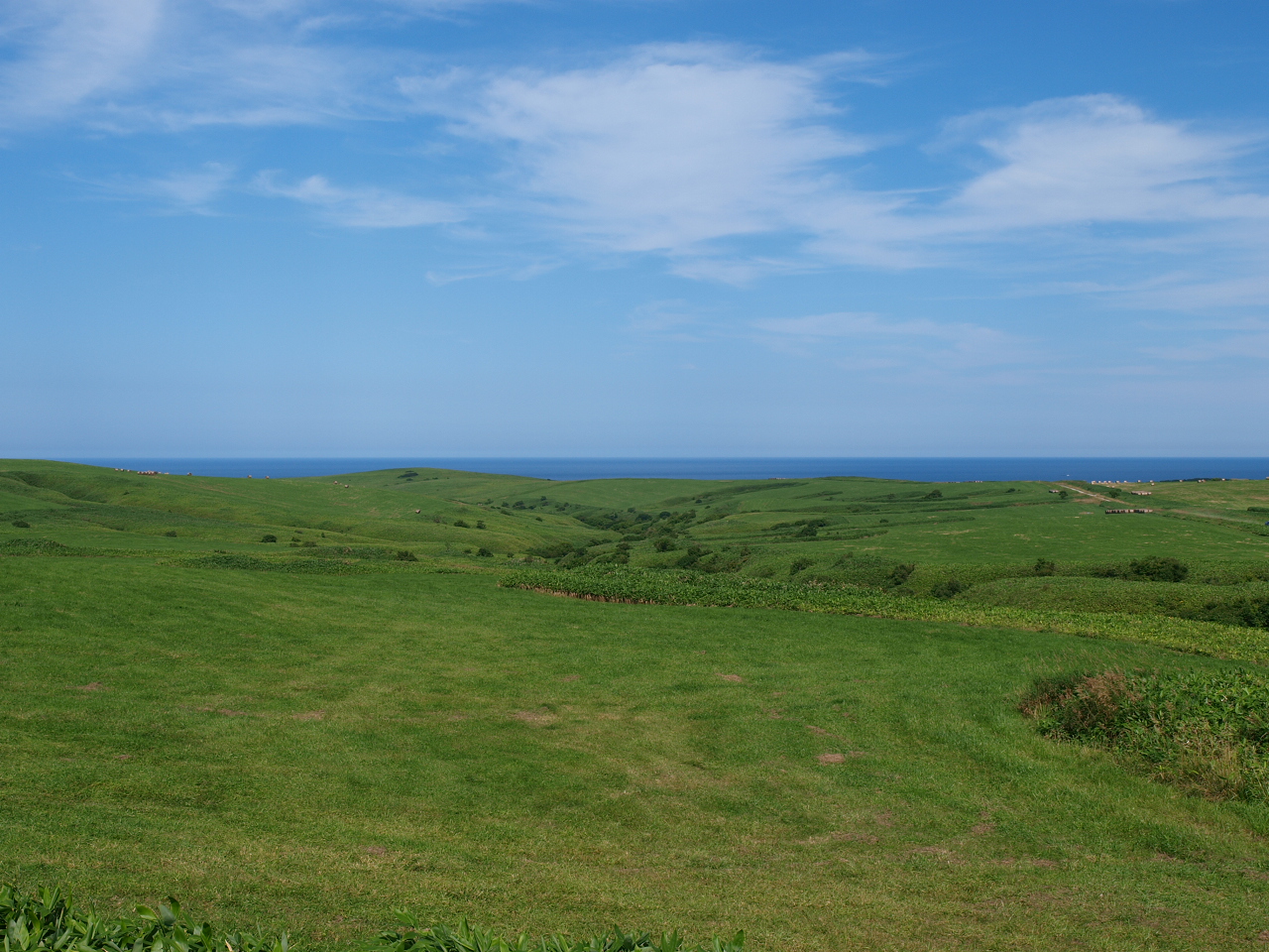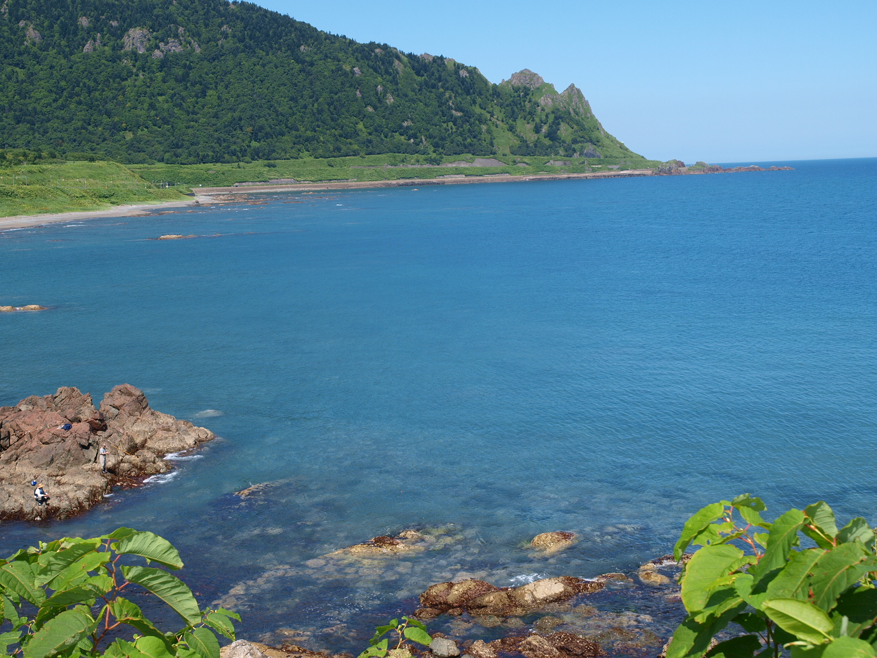 | 神威岬 青い海と芝生がとても綺麗、で暫し休憩。海にいっぱい人が並んでいるのは何を狙っているのか?と釣りの人に聴くと鱒を狙っているらしい。川に上がった魚は取ることができないため河口で遡上する鱒を狙うらしい。どうやら鮭より鱒のほうがいいらしい。 ![]() |