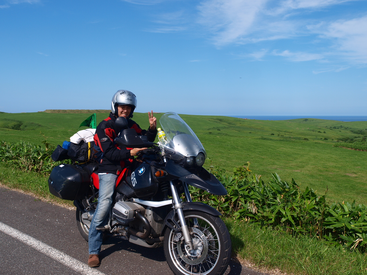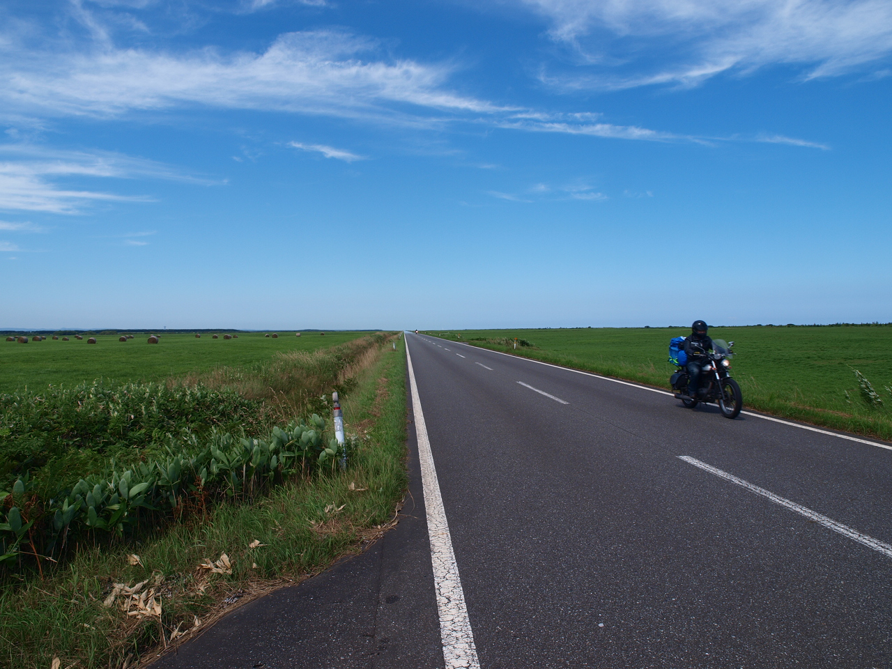 | 宗谷丘陵の駐車場では今朝話をした飛騨のVFR1200君が昼寝をしていた。”エサヌカはすごかった、道が消えてますからね”と非常に喜んでいたので、宗谷丘陵の奥まで走って折り返しても30分程度なので行ったらいいよと教えてやった。僕らも折り返し丸山に向かう。 |