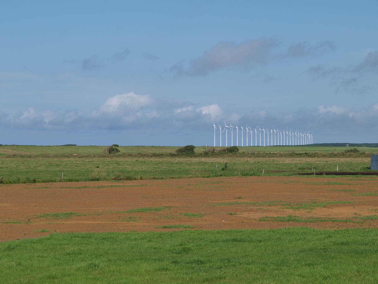 ![]() 直線に並ぶ風力発電所は迫力がある。 |