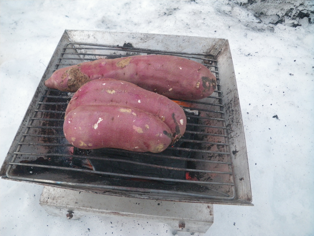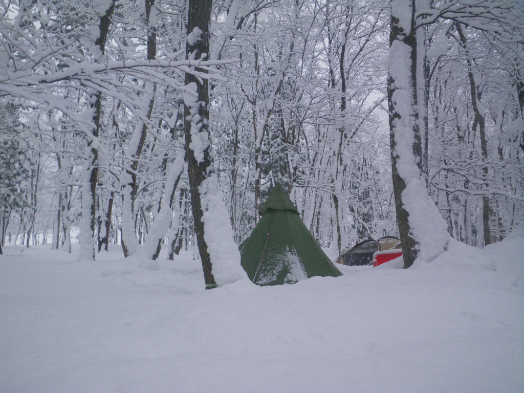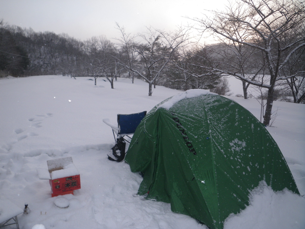夜も雪が降り続きテントサイトもさらに雪深くなっていた。いつもなら大きなテントでは中でストーブが焚けるのがうらやましいのだが今回はバンガローだ、しかし焼き物はなぜか外で炭火、これではいつもと変わらない。![]() |