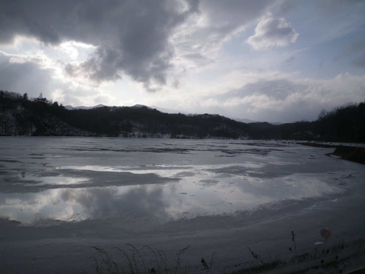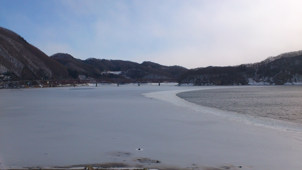![]() 近くなので釜房湖を通って見ると湖面が凍っていた。結構大きな石を投げても割れないのでそこそこの厚さがあるのかもしれない。 |