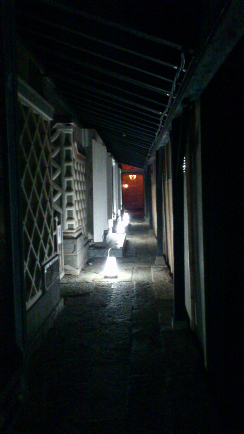 ![]() 日が暮れると御殿にも電気がともりいい雰囲気に。 |