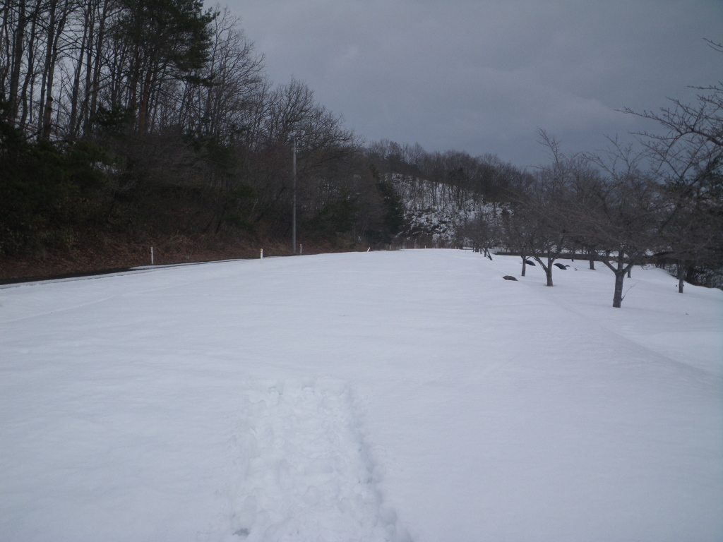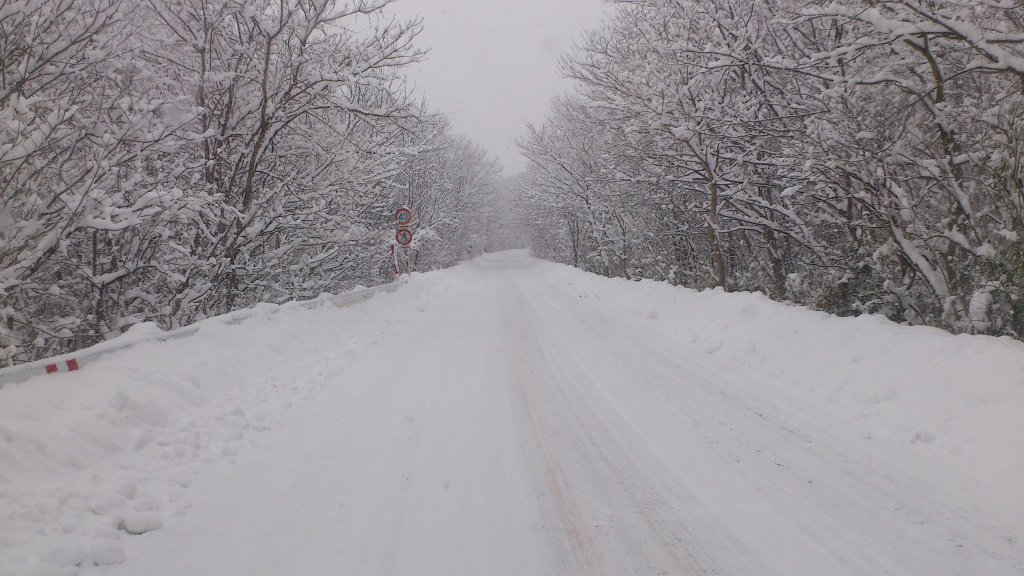 | 桜から降り続く雪で御殿も雪化粧。当然帰り道のこの通りジムニー大活躍でした。 |
