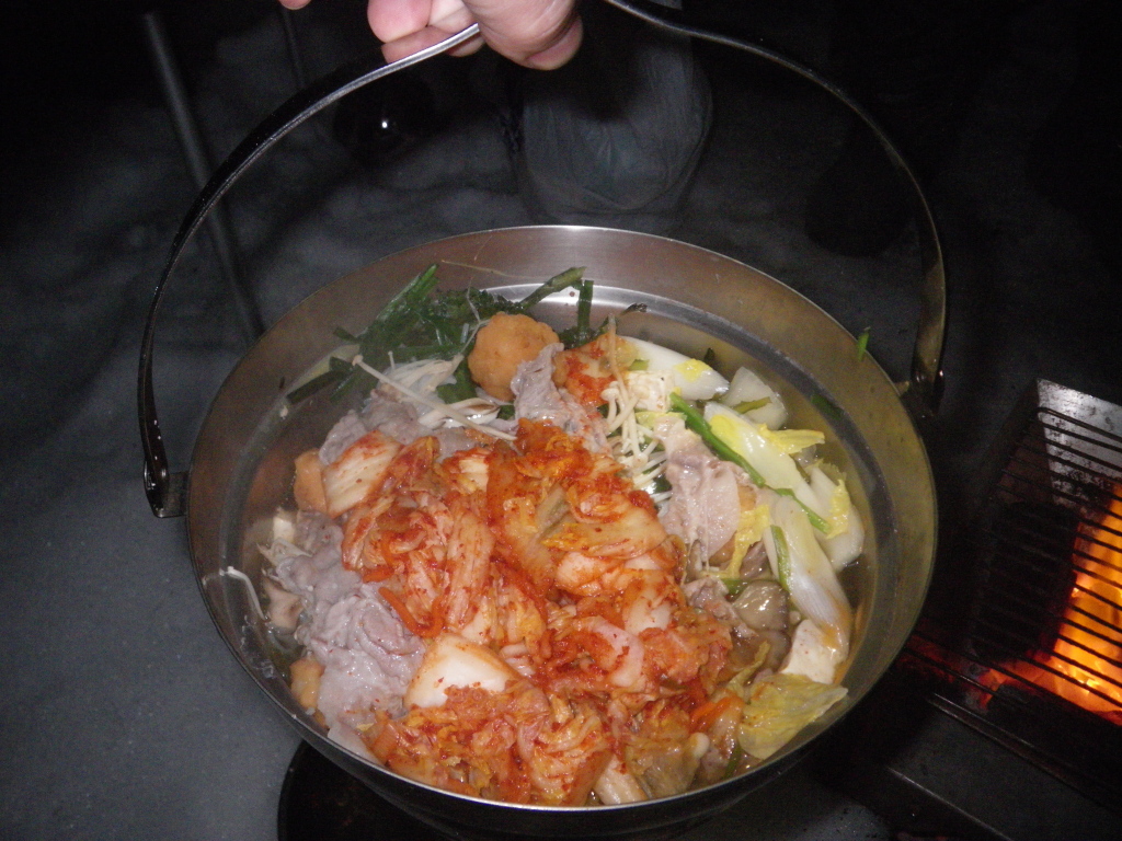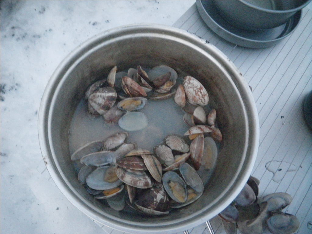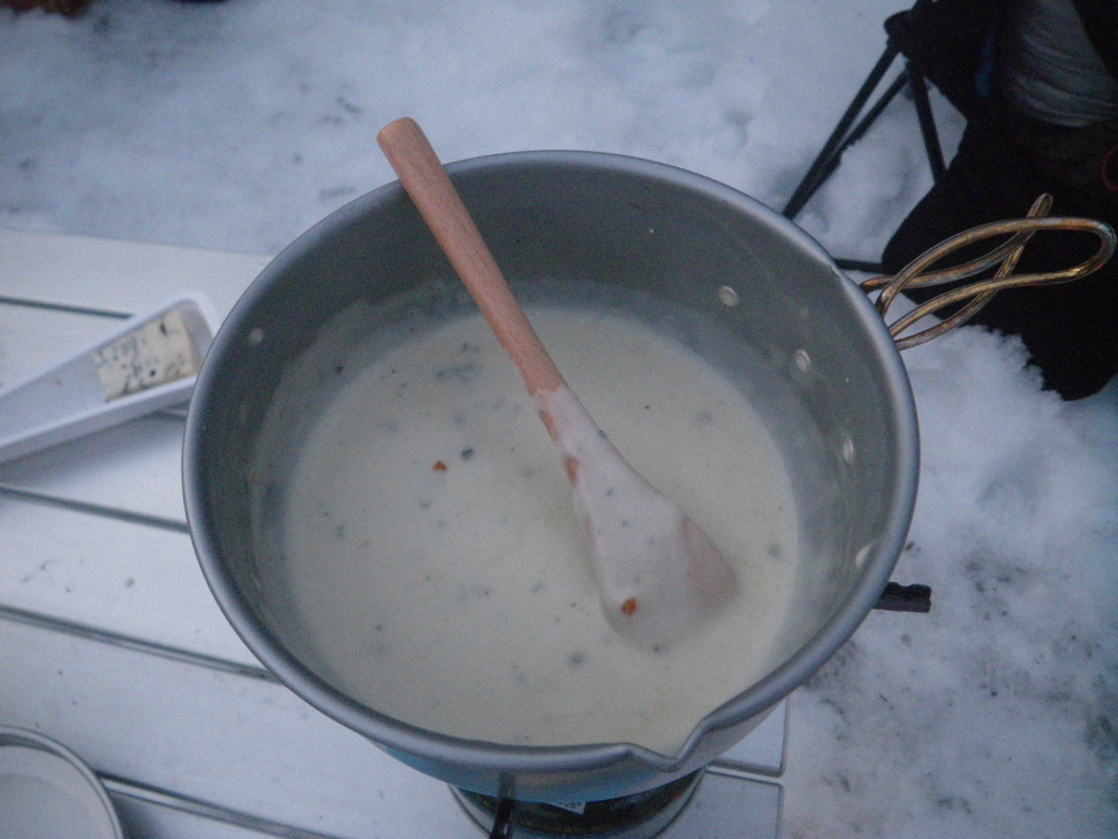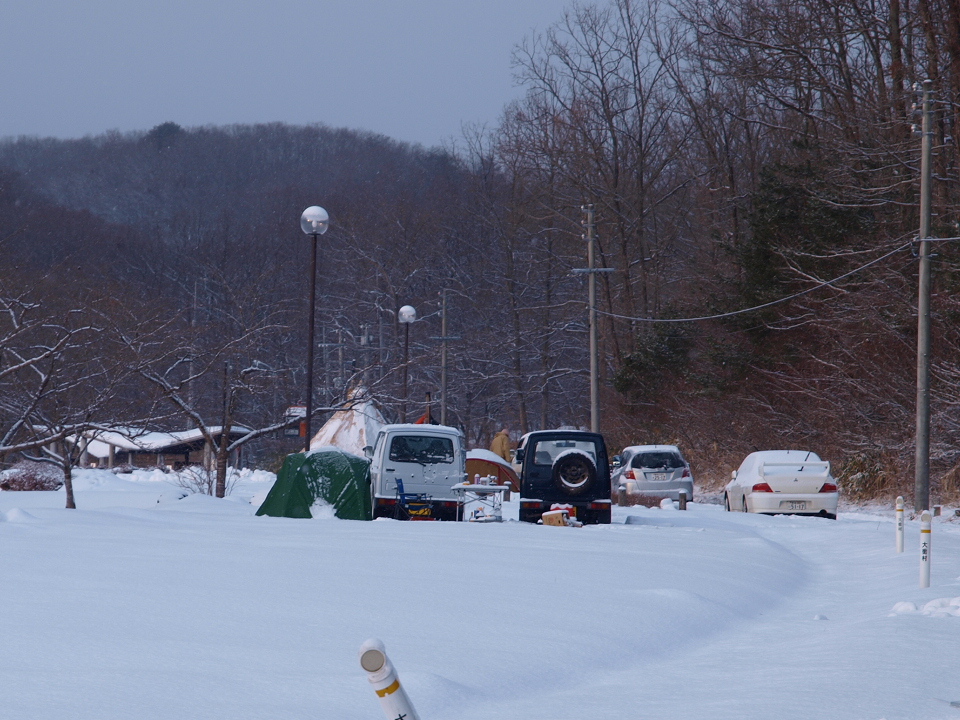 いつもの駐車場で設営場所準備、テントと宴会場所を圧雪します。 焼き芋に始まり、チーズフォンデュ、アサリの酒蒸し、キムチ鍋。 まったりするには冬のキャンプ場が最適。 |