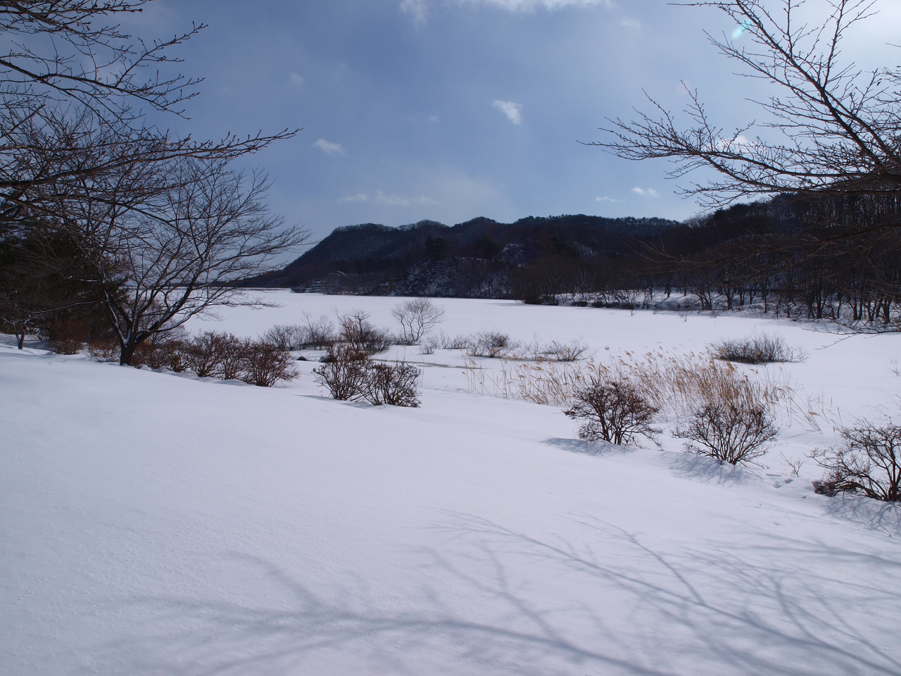![]() ダム湖も半部凍った状態、やはり2月だ。 |