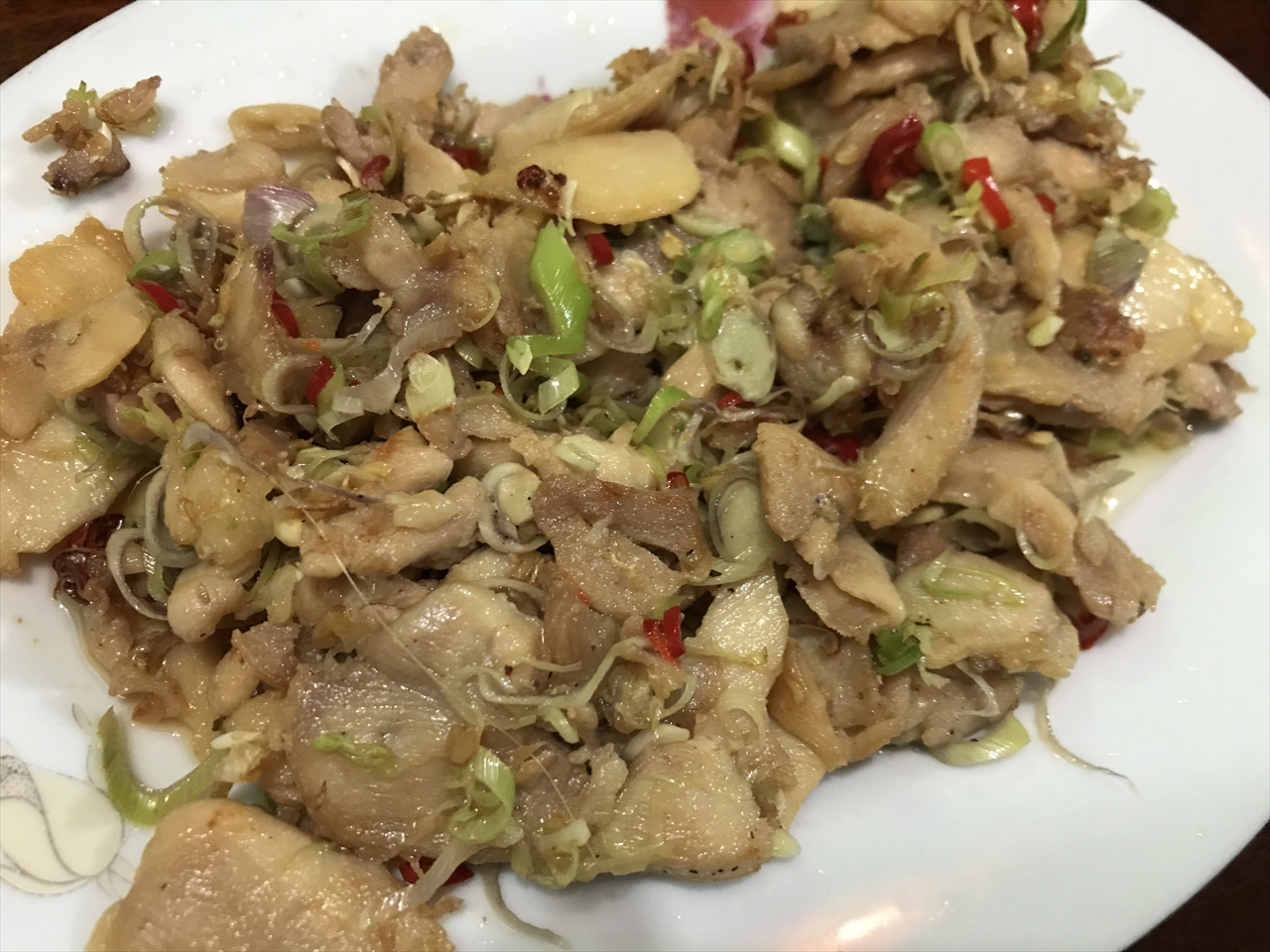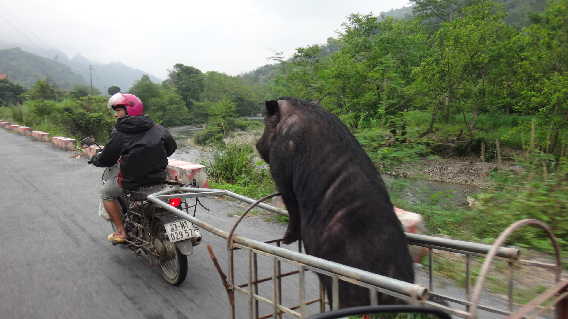 | 町を抜けて川を渡る。いよいよ山岳地帯に入るのだ。と前を見るとバイクに熊を載せている?そんな馬鹿なと近づくと巨大な豚だった。 |
