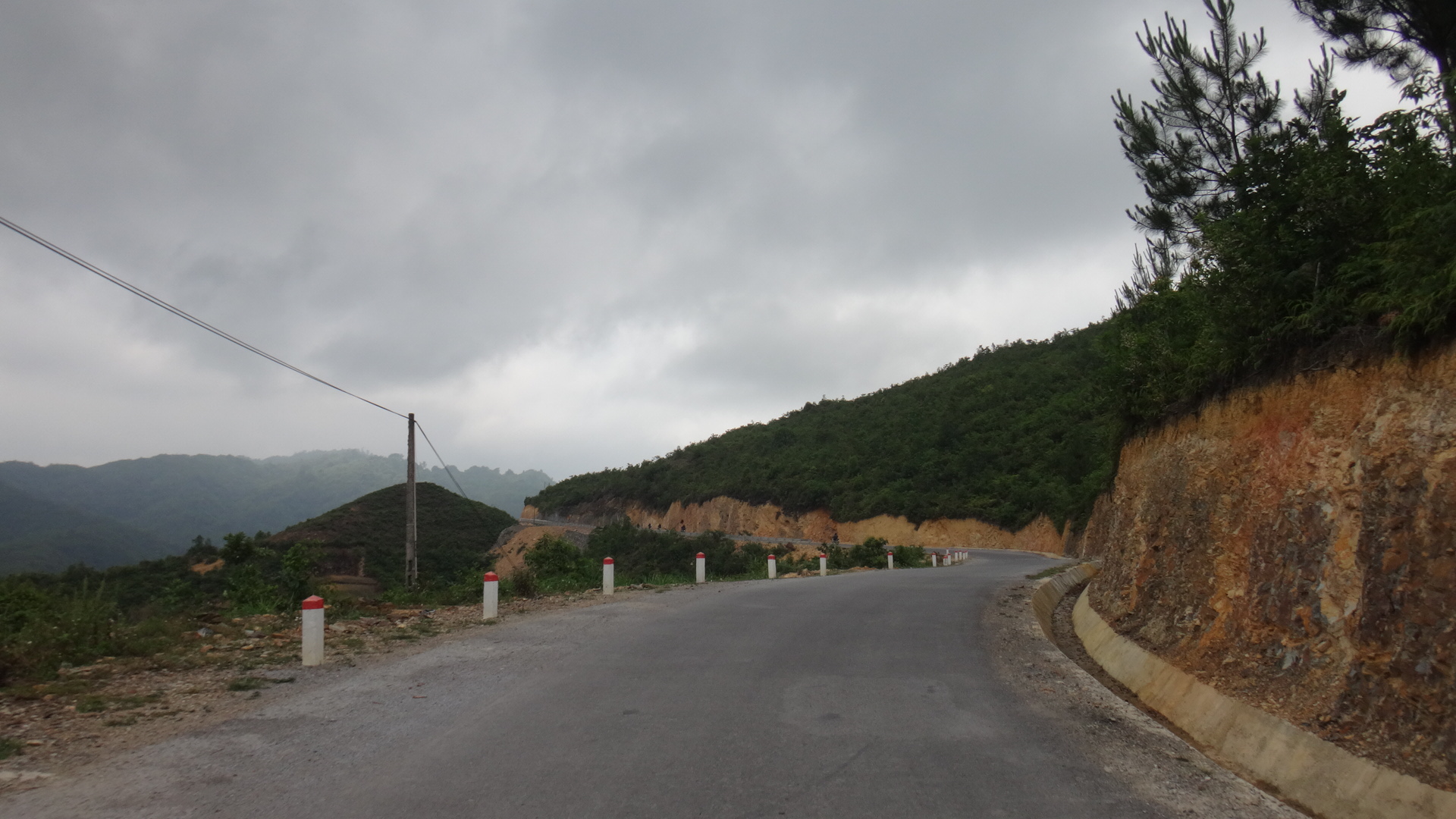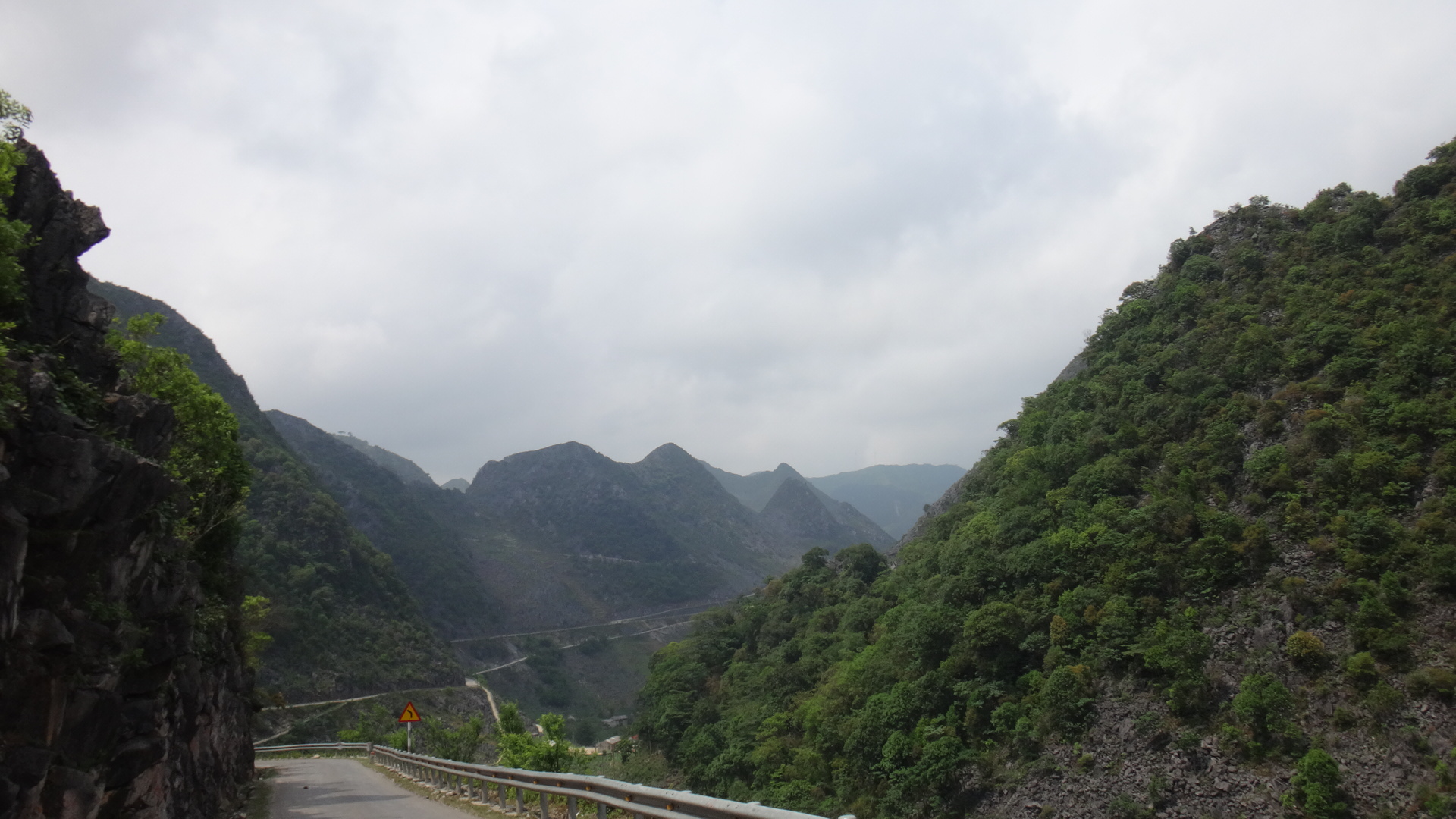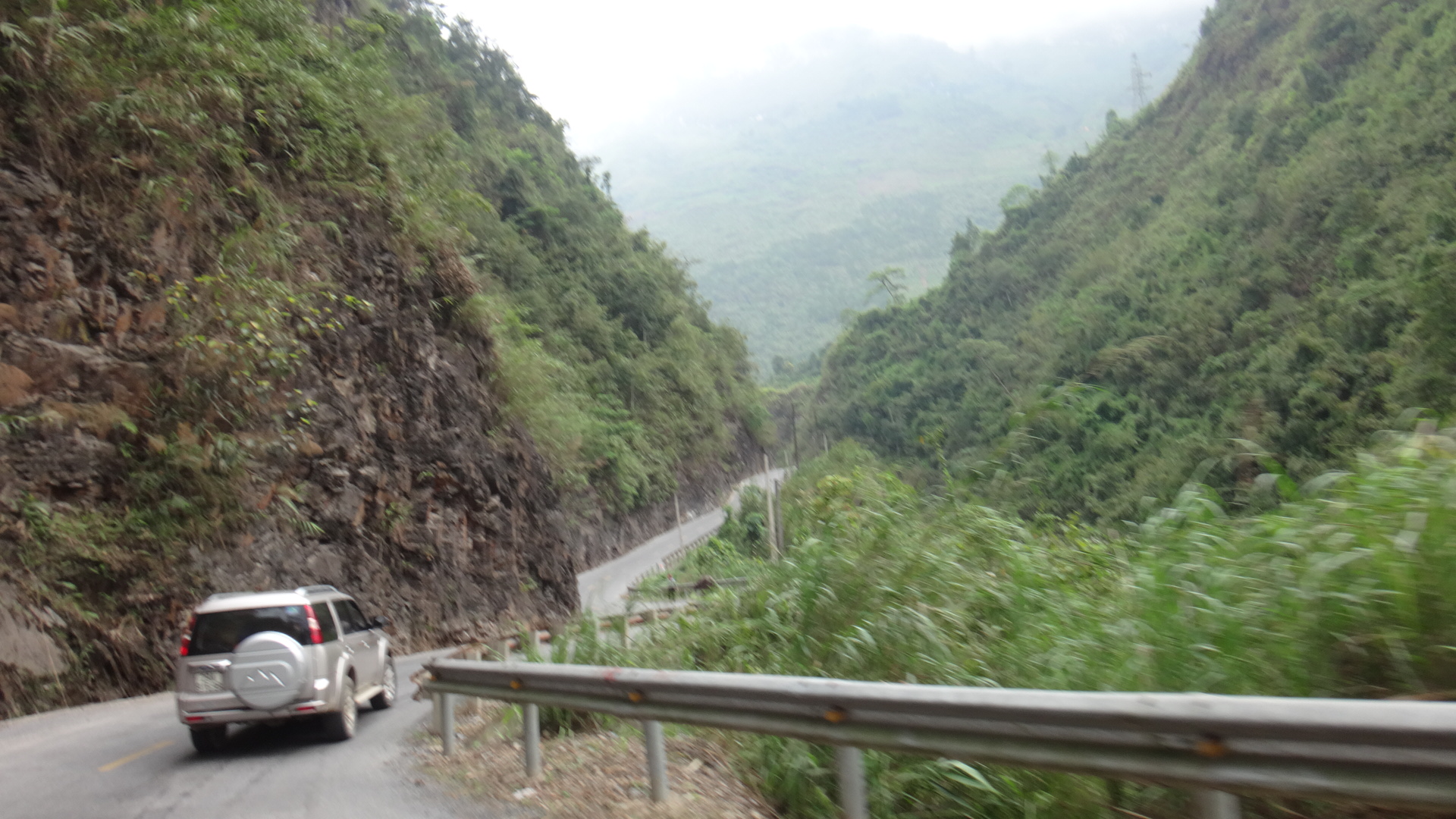 | このまま渓谷の奥深くと思っていたら峠に差し掛かり高度を上げてゆく。しかしこんな道で大型のトレーラーが故障して立往生。それを抜こうとするトレーラーが道をふさぎ対抗するトラックも立往生、しばらくダメかと思ってバイクから降りて待っていると。道をふさいでいたトレーラーがガードレールをこすりながらバックして通してくれた。こんな道を20tクラスのトレーラーが来る?驚くべしベトナム。 |