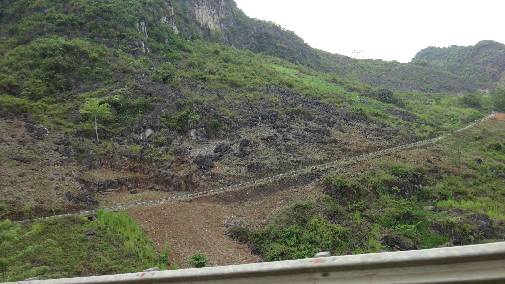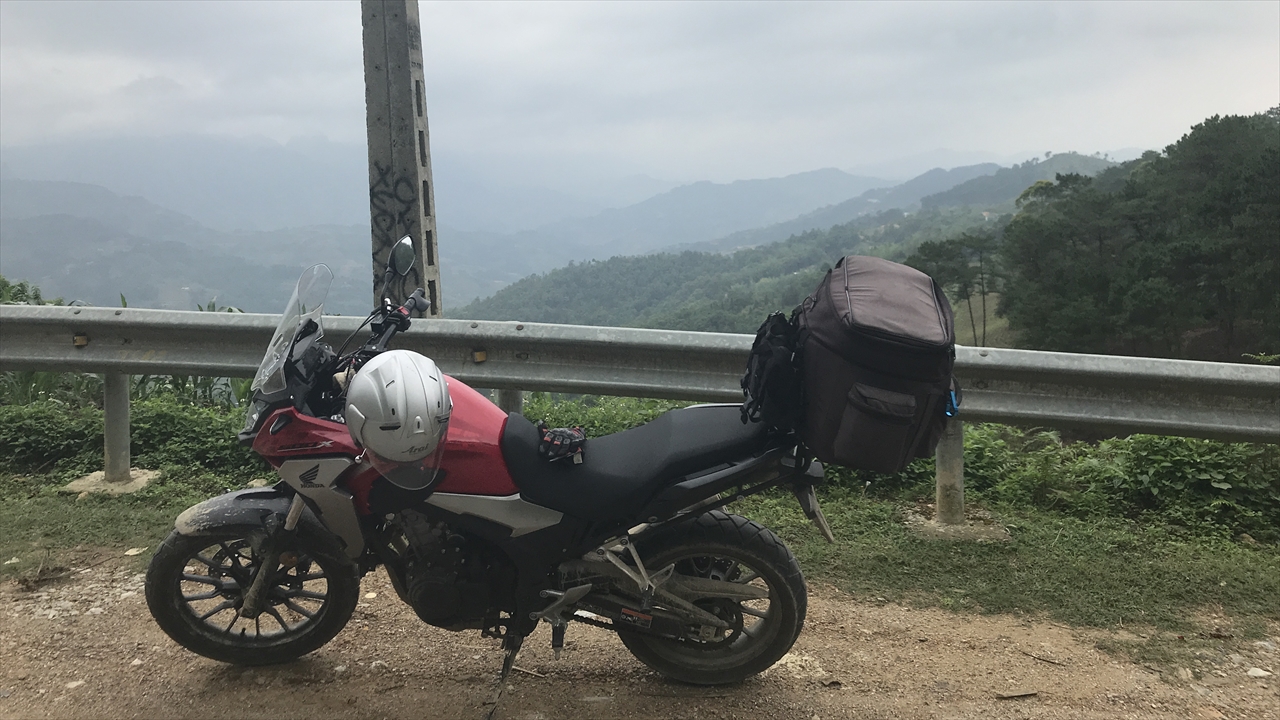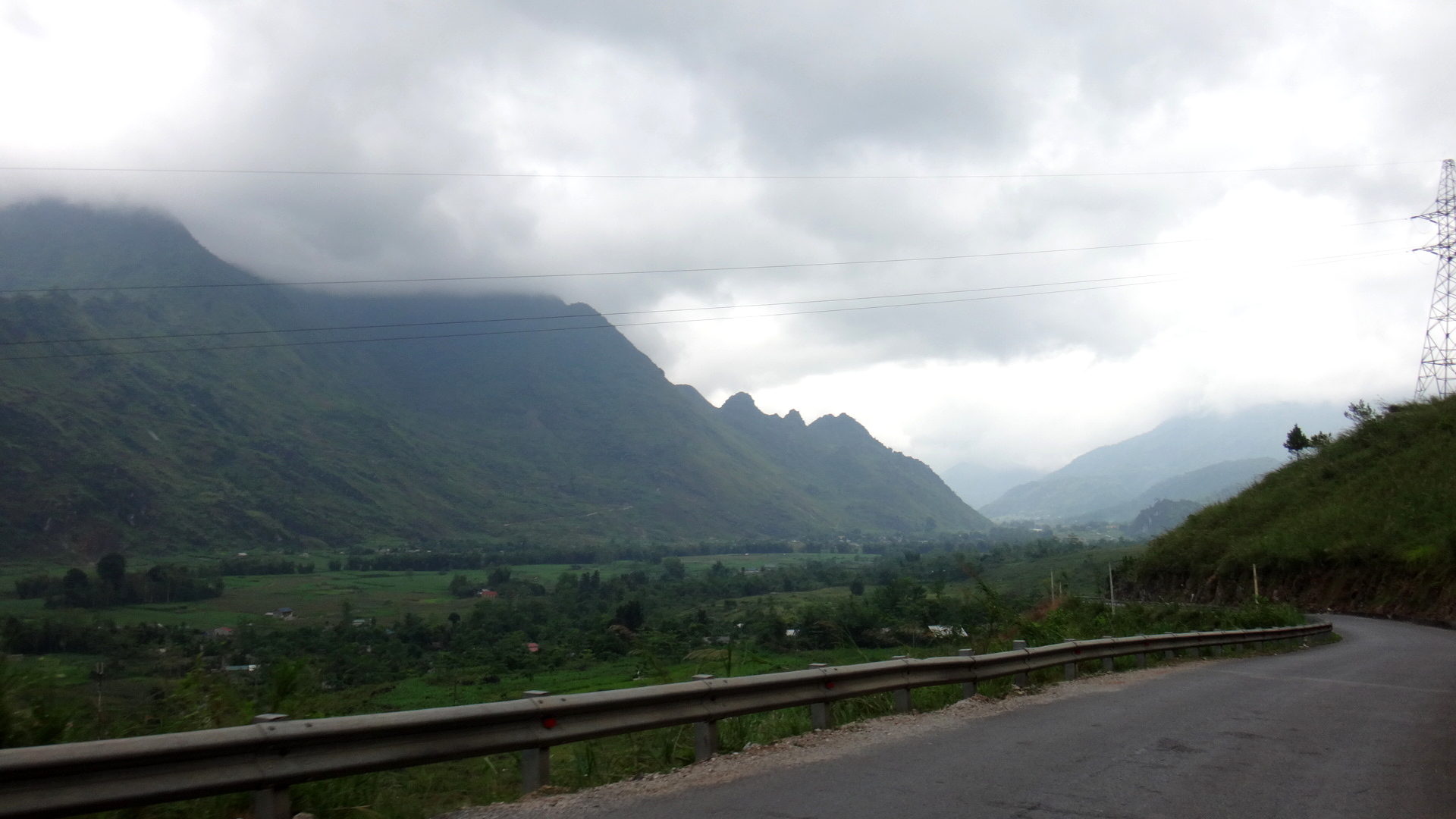 | このまま渓谷の奥深くと思っていたら峠に差し掛かり高度を上げてゆく。しかしこんな道で大型のトレーラーが故障して立往生。それを抜こうとするトレーラーが道をふさぎ対抗するトラックも立往生、しばらくダメかと思ってバイクから降りて待っていると。道をふさいでいたトレーラーがガードレールをこすりながらバックして通してくれた。こんな道を20tクラスのトレーラーが来る?驚くべしベトナム。 |